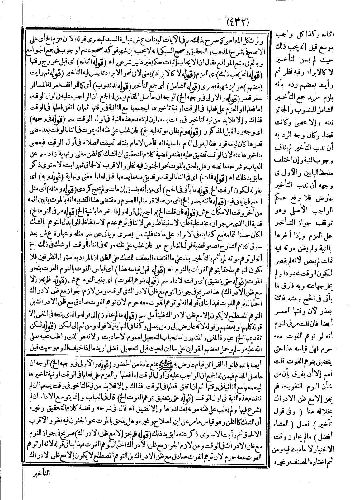أَثْنَاءَهُ، وَكَذَا كُلُّ وَاجِبٍ مُوَسَّعٍ قِيلَ إنَّمَا يَجِبُ ذَلِكَ حَيْثُ لَمْ يُسَنَّ التَّأْخِيرُ لَا كَالْإِبْرَادِ وَفِيهِ نَظَرٌ، ثُمَّ رَأَيْت بَعْضَهُمْ رَدَّهُ بِأَنَّهُ يَلْزَمُ مُرِيدَ جَمْعِ التَّأْخِيرِ الشَّامِلِ لِلْمَنْدُوبِ، وَالْجَائِزِ نِيَّتُهُ وَإِلَّا عَصَى وَكَانَتْ قَضَاءً وَكَانَ وَجْهُ الرَّدِّ بِهِ إنْ نُدِبَ التَّأْخِيرُ لَمْ يُنَافِ وُجُوبَ النِّيَّةِ وَإِنْ اخْتَلَفَ مَلْحَظُ الْبَابَيْنِ، وَالْأَوْلَى فِي وَجْهِهِ أَنَّ نَدْبَ التَّأْخِيرِ عَارِضٌ فَلَا يَرْفَعُ حُكْمَ الْوَاجِبِ الْأَصْلِيِّ وَهُوَ تَوَقُّفُ جَوَازِ التَّأْخِيرِ عَلَى الْعَزْمِ