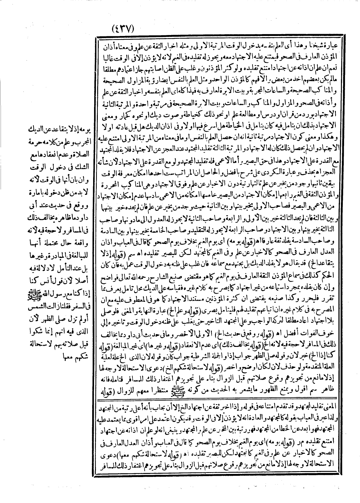 ـــــــــــــــــــــــــــــQعِبَارَةُ شَيْخِنَا وَهَذَا أَيْ الْعِلْمُ بِنَفْسِهِ بِدُخُولِ الْوَقْتِ الْمَرْتَبَةُ الْأُولَى وَمِثْلُهُ إخْبَارُ الثِّقَةِ عَنْ عِلْمٍ وَفِي مَعْنَاهُ أَذَانُ الْمُؤَذِّنِ الْعَارِفِ فِي الصَّحْوِ فَيُمْتَنَعُ عَلَيْهِ الِاجْتِهَادُ مَعَهُ وَيَجُوزُ لَهُ تَقْلِيدُهُ فِي الْغَيْمِ؛ لِأَنَّهُ لَا يُؤَذِّنُ إلَّا فِي الْوَقْتِ غَالِبًا نَعَمْ إنْ عَلِمَ أَنَّ أَذَانَهُ عَنْ اجْتِهَادٍ امْتَنَعَ تَقْلِيدُهُ وَلَوْ كَثُرَ الْمُؤَذِّنُونَ وَغَلَبَ عَلَى الظَّنِّ إصَابَتُهُمْ جَازَ اعْتِمَادُهُمْ مُطْلَقًا مَا لَمْ يَكُنْ بَعْضُهُمْ أَخَذَ مِنْ بَعْضٍ وَإِلَّا فَهُمْ كَالْمُؤَذِّنِ الْوَاحِدِ وَمِثْلُ الْعِلْمِ بِالنَّفْسِ أَيْضًا رُؤْيَةُ الْمَزَاوِلِ الصَّحِيحَةِ، وَالْمَنَاكِبِ الصَّحِيحَةِ، وَالسَّاعَاتِ الْمُجَرَّبَةِ وَبَيْتُ الْإِبْرَةِ لِعَارِفٍ بِهِ فَهَذَا كُلُّهُ أَيْ الْعِلْمُ بِنَفْسِهِ وَإِخْبَارُ الثِّقَةِ عَنْ عِلْمٍ وَأَذَانُهُ فِي الصَّحْوِ، وَالْمَزَاوِلُ، وَالْمَنَاكِبُ، وَالسَّاعَاتُ وَبَيْتُ الْإِبْرَةِ الصَّحِيحَةِ فِي مَرْتَبَةٍ وَاحِدَةٍ، وَالْمَرْتَبَةُ الثَّانِيَةُ الِاجْتِهَادُ بِوِرْدٍ مِنْ قُرْآنٍ، أَوْ دَرْسٍ، أَوْ مُطَالَعَةِ عِلْمٍ، أَوْ نَحْوِ ذَلِكَ كَخِيَاطَةٍ وَصَوْتِ دِيكٍ، أَوْ نَحْوِهِ كَحِمَارٍ وَمَعْنَى الِاجْتِهَادِ بِذَلِكَ أَنْ يَتَأَمَّلَ فِيهِ كَأَنْ يَتَأَمَّلَ فِي الْخِيَاطَةِ هَلْ أَسْرَعَ فِيهَا، أَوْ لَا؟ وَفِي أَذَانِ الدِّيكِ هَلْ قَبْلَ عَادَتِهِ أَوْ لَا وَهَكَذَا وَمَعْنَى كَوْنِ الِاجْتِهَادِ مَرْتَبَةً ثَانِيَةً أَنَّهُ إنْ حَصَلَ الْعِلْمُ بِالنَّفْسِ أَوْ مَا فِي مَعْنَاهُ مِنْ الْمَرْتَبَةِ الْأُولَى امْتَنَعَ عَلَيْهِ الِاجْتِهَادُ وَإِنْ لَمْ يَحْصُلْ ذَلِكَ كَانَ لَهُ الِاجْتِهَادُ، وَالْمَرْتَبَةُ الثَّالِثَةُ تَقْلِيدُ الْمُجْتَهِدِ عِنْدَ الْعَجْزِ عَنْ الِاجْتِهَادِ فَلَا يُقَلِّدُ الْمُجْتَهِدَ مَعَ الْقُدْرَةِ عَلَى الِاجْتِهَادِ وَهَذَا فِي حَقِّ الْبَصِيرِ