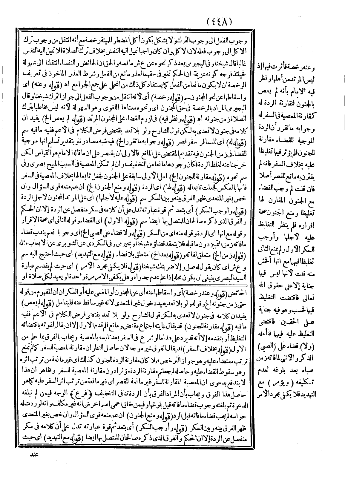 الْوَجْهُ فِيمَنْ لَمْ تَبْلُغْهُ الدَّعْوَةُ، ثُمَّ بَلَغَتْهُ وُجُوبُ قَضَاءِ مَا فَاتَهُ قَبْلَ بُلُوغِهَا وَفِيمَنْ خُلِقَ أَعْمَى أَصَمُّ أَخْرَسُ أَنَّهُ غَيْرُ مُكَلَّفٍ وَأَنَّهُ لَوْ رُدَّتْ لَهُ حَوَاسُّهُ لَمْ يَجِبْ قَضَاءُ مَا فَاتَهُ قَبْلَ الرَّدِّ (قَوْلُهُ: وَمَنَعَ الْجُنُونُ) إنْ عَمَّ مَنْعُهُ قَوِيَ السُّؤَالُ وَإِنْ خُصَّ بِغَيْرِ الْمُتَعَدِّي ظَهَرَ الْفَرْقُ بَيْنَهُ وَبَيْنَ السُّكْرِ (قَوْلُهُ: وَأَوْجَبَ السُّكْرَ) أَيْ: بِتَعَدٍّ، ثُمَّ قُوَّةُ عِبَارَتِهِ تَدُلُّ عَلَى أَنَّ كَلَامَهُ فِي سُكْرٍ مُنْفَصِلٍ عَنْ الرِّدَّةِ إلَّا أَنَّ الْحُكْمَ، وَالْفَرْقَ الَّذِي ذَكَرَهُ صَالِحَانِ لِلْمُتَّصِلِ بِهَا أَيْضًا