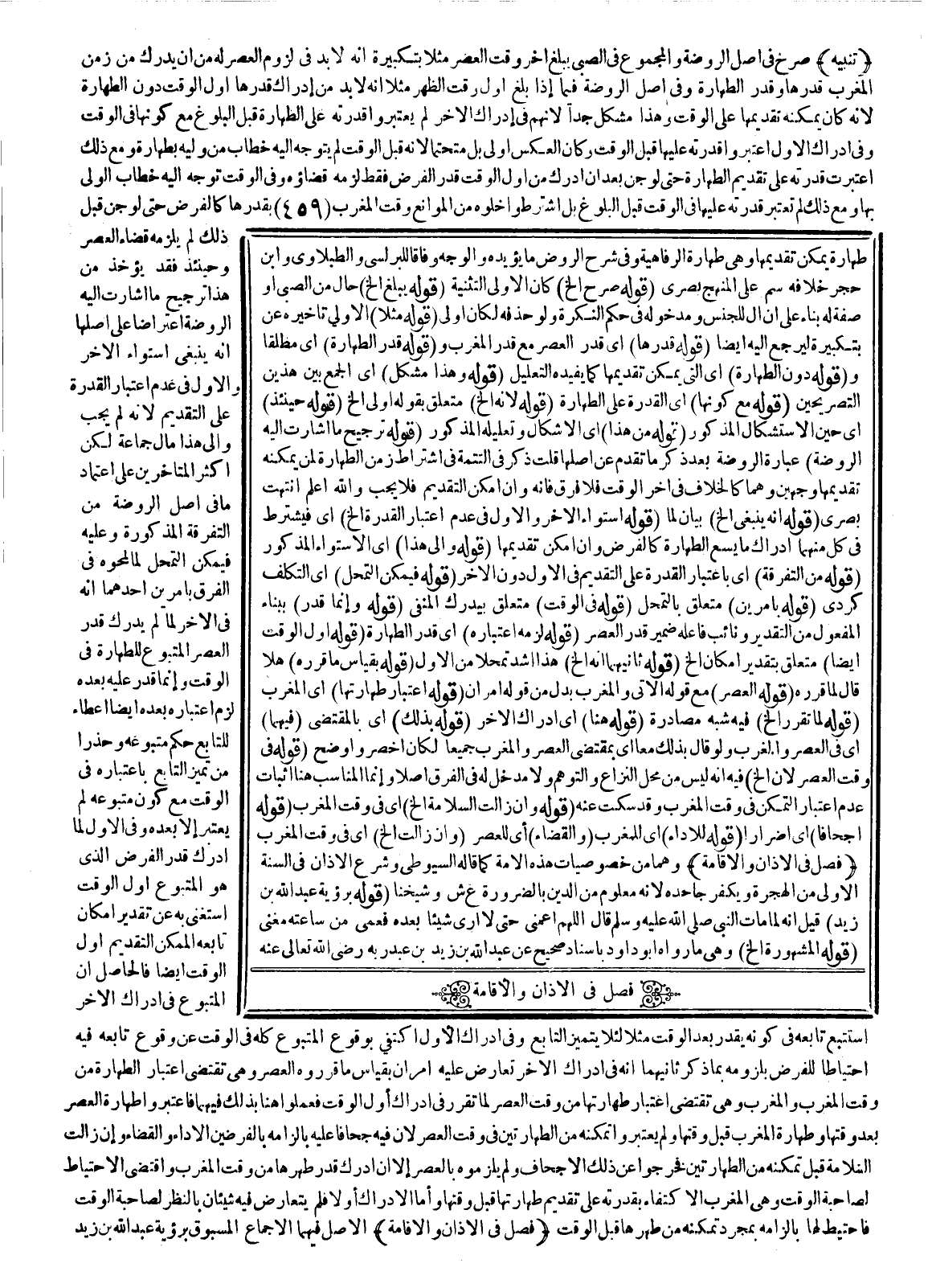 (تَنْبِيهٌ) صَرَّحَ فِي أَصْلِ الرَّوْضَةِ، وَالْمَجْمُوعِ فِي الصَّبِيِّ يَبْلُغُ آخِرَ وَقْتِ الْعَصْرِ مَثَلًا بِتَكْبِيرَةٍ أَنَّهُ لَا بُدَّ فِي لُزُومِ الْعَصْرِ لَهُ مِنْ أَنْ يُدْرِكَ مِنْ زَمَنِ الْمَغْرِبِ قَدْرَهَا وَقَدْرَ الطَّهَارَةِ وَفِي أَصْلِ الرَّوْضَةِ فِيمَا إذَا بَلَغَ أَوَّلَ وَقْتِ الظُّهْرِ مَثَلًا أَنَّهُ لَا بُدَّ مِنْ إدْرَاكِ قَدْرِهَا أَوَّلَ الْوَقْتِ دُونَ الطَّهَارَةِ؛ لِأَنَّهُ كَانَ يُمْكِنُهُ تَقْدِيمُهَا عَلَى الْوَقْتِ وَهَذَا مُشْكِلٌ جِدًّا؛ لِأَنَّهُمْ فِي إدْرَاكِ الْآخَرِ لَمْ يَعْتَبِرُوا قُدْرَتَهُ عَلَى الطَّهَارَةِ قَبْلَ الْبُلُوغِ مَعَ كَوْنِهَا فِي الْوَقْتِ وَفِي إدْرَاكِ الْأَوَّلِ اعْتَبَرُوا قُدْرَتَهُ عَلَيْهَا قَبْلَ الْوَقْتِ وَكَانَ الْعَكْسُ أَوْلَى بَلْ مُتَحَتِّمًا؛ لِأَنَّهُ قَبْلَ الْوَقْتِ لَمْ يَتَوَجَّهْ إلَيْهِ خِطَابٌ مِنْ وَلِيِّهِ بِطَهَارَةٍ وَمَعَ ذَلِكَ اُعْتُبِرَتْ قُدْرَتُهُ عَلَى تَقْدِيمِ الطَّهَارَةِ حَتَّى لَوْ جُنَّ بَعْدَ أَنْ أَدْرَكَ مِنْ أَوَّلِ الْوَقْتِ قَدْرَ الْفَرْضِ فَقَطْ لَزِمَهُ قَضَاؤُهُ وَفِي الْوَقْتِ تَوَجَّهَ إلَيْهِ خِطَابُ الْوَلِيِّ بِهَا وَمَعَ ذَلِكَ لَمْ تُعْتَبَرْ قُدْرَتُهُ عَلَيْهَا فِي الْوَقْتِ قَبْلَ الْبُلُوغِ، بَلْ اشْتَرَطُوا خُلُوَّهُ مِنْ الْمَوَانِعِ وَقْتَ الْمَغْرِبِ بِقَدْرِهَا كَالْفَرْضِ حَتَّى لَوْ جُنَّ قَبْلَ ذَلِكَ لَمْ يَلْزَمْهُ قَضَاءُ الْعَصْرِ وَحِينَئِذٍ فَقَدْ يُؤْخَذُ مِنْ هَذَا تَرْجِيحُ مَا أَشَارَتْ إلَيْهِ الرَّوْضَةُ اعْتِرَاضًا عَلَى أَصْلِهَا أَنَّهُ يَنْبَغِي اسْتِوَاءُ الْآخَرِ، وَالْأَوَّلِ فِي عَدَمِ اعْتِبَارِ الْقُدْرَةِ عَلَى التَّقْدِيمِ؛ لِأَنَّهُ لَمْ يَجِبْ، وَإِلَى هَذَا مَالَ جَمَاعَةٌ لَكِنَّ أَكْثَرَ الْمُتَأَخِّرِينَ عَلَى اعْتِمَادِ مَا فِي أَصْلِ الرَّوْضَةِ مِنْ التَّفْرِقَةِ الْمَذْكُورَةِ