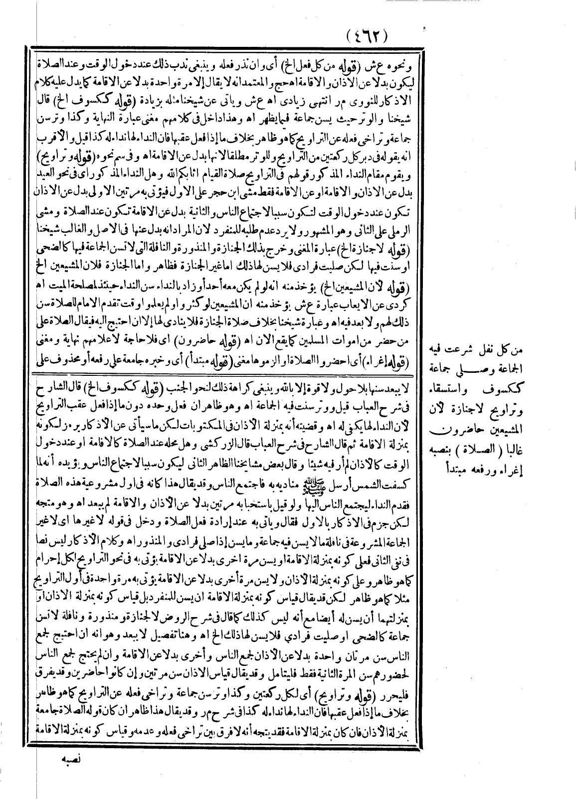 مِنْ كُلِّ نَفْلٍ شُرِعَتْ فِيهِ الْجَمَاعَةُ وَصُلِّيَ جَمَاعَةً كَكُسُوفٍ وَاسْتِسْقَاءٍ وَتَرَاوِيحَ لَا جِنَازَةٍ؛ لِأَنَّ الْمُشَيِّعِينَ حَاضِرُونَ غَالِبًا (الصَّلَاةَ) بِنَصْبِهِ إغْرَاءً وَرَفْعِهِ مُبْتَدَأً