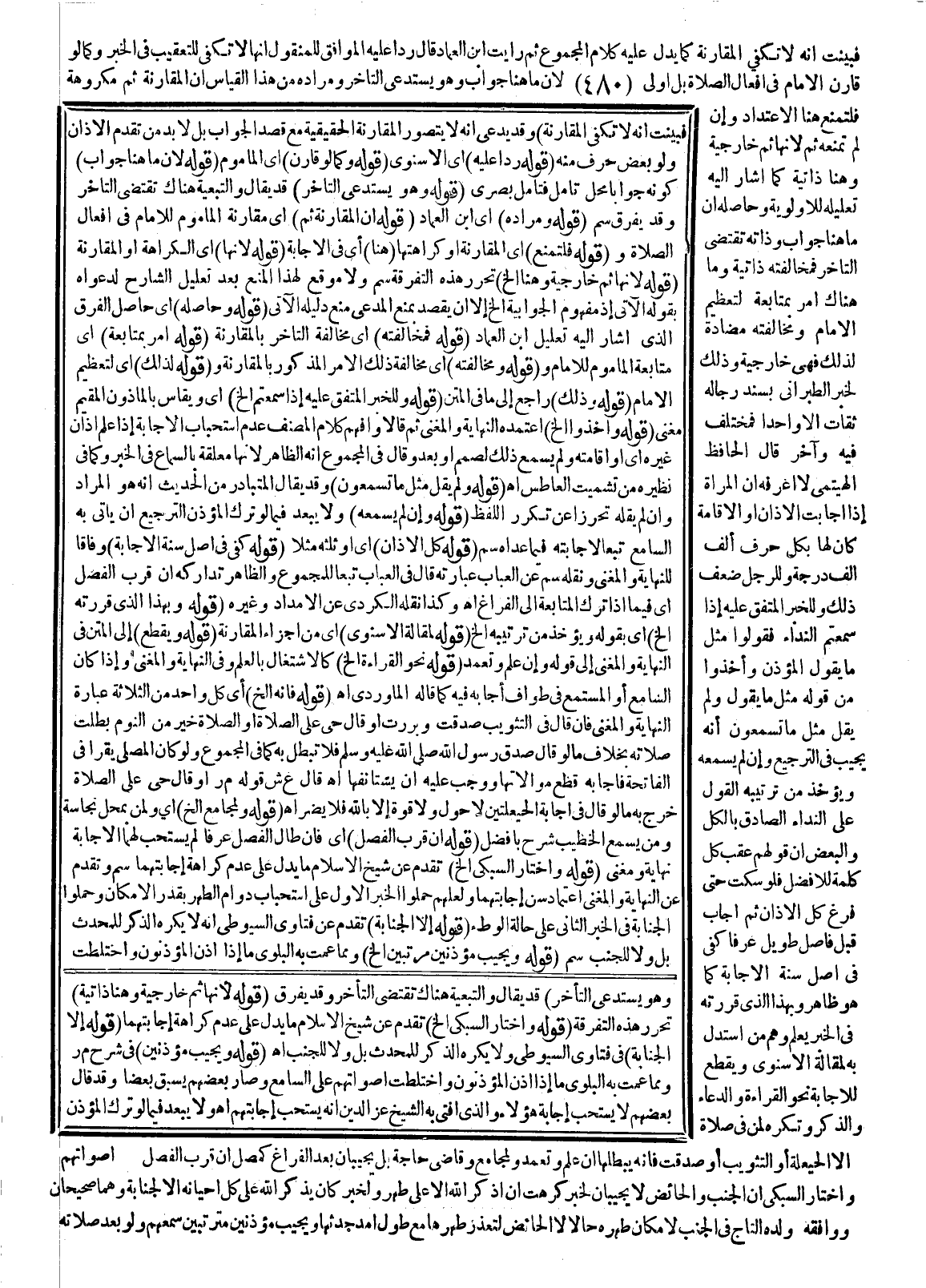 وَكَمَا لَوْ قَارَنَ الْإِمَامُ فِي أَفْعَالِ الصَّلَاةِ بَلْ أَوْلَى؛ لِأَنَّ مَا هُنَا جَوَابٌ وَهُوَ يَسْتَدْعِي التَّأَخُّرَ وَمُرَادُهُ مِنْ هَذَا الْقِيَاسِ أَنَّ الْمُقَارَنَةَ ثَمَّ مَكْرُوهَةٌ فَلْتُمْنَعْ هُنَا الِاعْتِدَادَ وَإِنْ لَمْ تَمْنَعْهُ، ثُمَّ؛ لِأَنَّهَا ثَمَّ خَارِجِيَّةٌ وَهُنَا ذَاتِيَّةٌ كَمَا أَشَارَ إلَيْهِ تَعْلِيلُهُ لِلْأَوْلَوِيَّةِ وَحَاصِلُهُ أَنَّ مَا هُنَا جَوَابٌ وَذَاتُهُ تَقْتَضِي التَّأَخُّرَ فَمُخَالَفَتُهُ ذَاتِيَّةٌ وَمَا هُنَاكَ أَمْرٌ بِمُتَابَعَةٍ لِتَعْظِيمِ الْإِمَامِ وَمُخَالَفَتُهُ مُضَادَّةٌ لِذَلِكَ فَهِيَ خَارِجِيَّةٌ وَذَلِكَ لِخَبَرِ الطَّبَرَانِيِّ بِسَنَدٍ رِجَالُهُ ثِقَاتٌ إلَّا وَاحِدًا فَمُخْتَلَفٌ فِيهِ وَآخَرَ قَالَ الْحَافِظُ الْهَيْتَمِيُّ لَا أَعْرِفُهُ «أَنَّ الْمَرْأَةَ إذَا أَجَابَتْ الْأَذَانَ، أَوْ الْإِقَامَةَ كَانَ لَهَا بِكُلِّ حَرْفٍ أَلْفُ أَلْفِ دَرَجَةٍ وَلِلرَّجُلِ ضِعْفُ ذَلِكَ» وَلِلْخَبَرِ الْمُتَّفَقِ عَلَيْهِ «إذَا سَمِعْتُمْ النِّدَاءَ فَقُولُوا مِثْلَ مَا يَقُولُ الْمُؤَذِّنُ» وَأَخَذُوا مِنْ قَوْلِهِ مِثْلَ مَا يَقُولُ وَلَمْ يَقُلْ مِثْلَ مَا تَسْمَعُونَ أَنَّهُ يُجِيبُ فِي التَّرْجِيعِ وَإِنْ لَمْ يَسْمَعْهُ وَيُؤْخَذُ مِنْ تَرْتِيبِهِ الْقَوْلَ عَلَى النِّدَاءِ الصَّادِقِ بِالْكُلِّ، وَالْبَعْضِ أَنَّ قَوْلَهُمْ عَقِبَ كُلِّ كَلِمَةٍ لِلْأَفْضَلِ فَلَوْ سَكَتَ حَتَّى فَرَغَ كُلُّ الْأَذَانِ، ثُمَّ أَجَابَ قَبْلَ فَاصِلٍ طَوِيلٍ عُرْفًا كَفَى فِي أَصْلِ سُنَّةِ الْإِجَابَةِ كَمَا هُوَ ظَاهِرٌ وَبِهَذَا الَّذِي قَرَّرْته فِي الْخَبَرِ يُعْلَمُ وَهْمُ مَنْ اسْتَدَلَّ بِهِ لِمَقَالَةِ الْإِسْنَوِيِّ وَيَقْطَعُ لِلْإِجَابَةِ نَحْوَ الْقِرَاءَةِ، وَالدُّعَاءِ، وَالذِّكْرِ وَتُكْرَهُ لِمَنْ فِي الصَّلَاةِ إلَّا الْحَيْعَلَةَ أَوْ التَّثْوِيبَ، أَوْ صَدَقْت فَإِنَّهُ يُبْطِلُهَا إنْ عَلِمَ وَتَعَمَّدَ وَلِمُجَامِعٍ وَقَاضِي حَاجَةٍ بَلْ يُجِيبَانِ بَعْدَ الْفَرَاغِ كَمُصَلٍّ إنْ قَرُبَ الْفَصْلُ