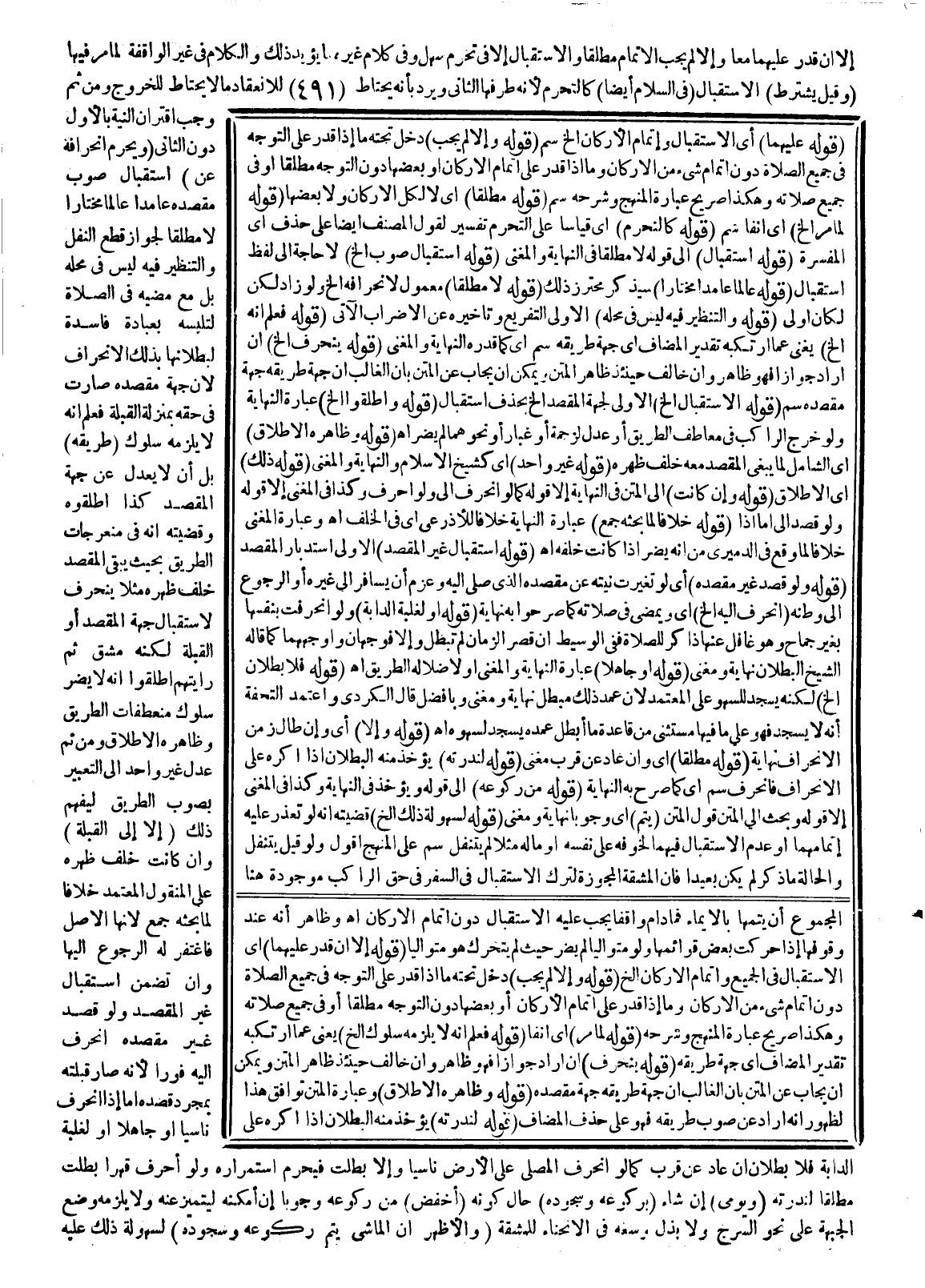 (وَقِيلَ يُشْتَرَطُ) الِاسْتِقْبَالُ (فِي السَّلَامِ أَيْضًا) كَالتَّحَرُّمِ؛ لِأَنَّهُ طَرَفُهَا الثَّانِي وَيُرَدُّ بِأَنَّهُ يُحْتَاطُ لِلِانْعِقَادِ مَا لَا يُحْتَاطُ لِلْخُرُوجِ وَمِنْ ثَمَّ وَجَبَ اقْتِرَانُ النِّيَّةِ بِالْأَوَّلِ دُونَ الثَّانِي (وَيَحْرُمُ انْحِرَافُهُ عَنْ) اسْتِقْبَالِ صَوْبِ مَقْصِدِهِ عَامِدًا عَالِمًا مُخْتَارًا لَا مُطْلَقًا لِجَوَازِ قَطْعِ النَّفْلِ، وَالتَّنْظِيرُ فِيهِ لَيْسَ فِي مَحَلِّهِ، بَلْ مَعَ مُضِيِّهِ فِي الصَّلَاةِ لِتَلَبُّسِهِ بِعِبَادَةٍ فَاسِدَةٍ لِبُطْلَانِهَا بِذَلِكَ الِانْحِرَافِ؛ لِأَنَّ جِهَةَ مُقْصِدِهِ صَارَتْ فِي حَقِّهِ بِمَنْزِلَةِ الْقِبْلَةِ فَعُلِمَ أَنَّهُ لَا يَلْزَمُهُ سُلُوكُ (طَرِيقَةٍ) بَلْ أَنْ لَا يَعْدِلَ عَنْ جِهَةِ الْمَقْصِدِ كَذَا أَطْلَقُوهُ وَقَضِيَّتُهُ أَنَّهُ فِي مُنْعَرِجَاتِ الطَّرِيقِ بِحَيْثُ يَبْقَى الْمَقْصِدُ خَلَفَ ظَهْرِهِ مَثَلًا يَنْحَرِفُ لِاسْتِقْبَالِ جِهَةِ الْمَقْصِدِ أَوْ الْقِبْلَةِ لَكِنَّهُ مُشِقٌّ