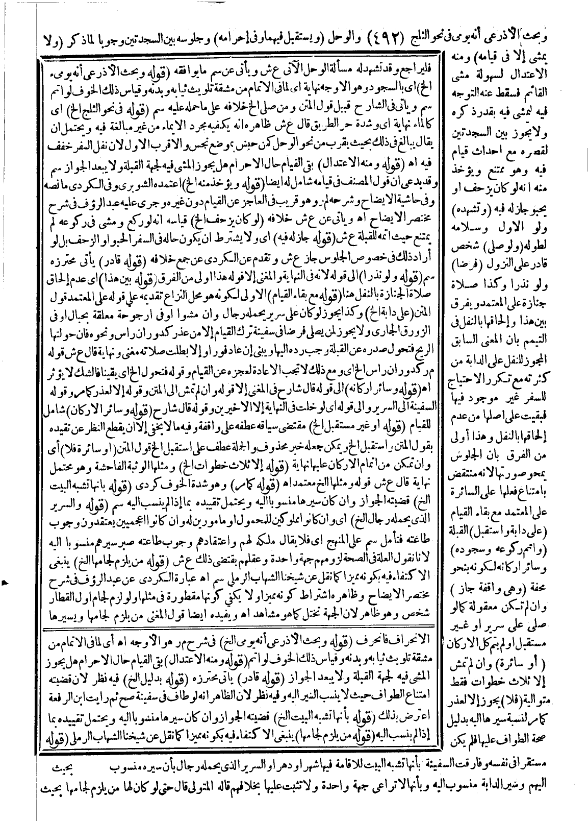 وَبَحَثَ الْأَذْرَعِيُّ أَنَّهُ يُومِئُ فِي نَحْوِ الثَّلْجِ، وَالْوَحْلِ (وَيَسْتَقْبِلُ فِيهِمَا وَفِي إحْرَامِهِ) وَجُلُوسِهِ بَيْنَ السَّجْدَتَيْنِ وُجُوبًا لِمَا ذُكِرَ (وَلَا يَمْشِي إلَّا فِي قِيَامِهِ) وَمِنْهُ الِاعْتِدَالُ لِسُهُولَةِ مَشْيِ الْقَائِمِ فَسَقَطَ عَنْهُ التَّوَجُّهُ فِيهِ لِيَمْشِيَ فِيهِ بِقَدْرِ ذِكْرِهِ وَلَا يَجُوزُ بَيْنَ السَّجْدَتَيْنِ لِقَصْرِهِ مَعَ إحْدَاثِ قِيَامٍ فِيهِ وَهُوَ مُمْتَنِعٌ وَيُؤْخَذُ مِنْهُ أَنَّهُ لَوْ كَانَ يَزْحَفُ، أَوْ يَحْبُو جَازَ لَهُ فِيهِ (وَتَشَهُّدُهُ) وَلَوْ الْأَوَّلَ وَسَلَامُهُ لِطُولِهِ