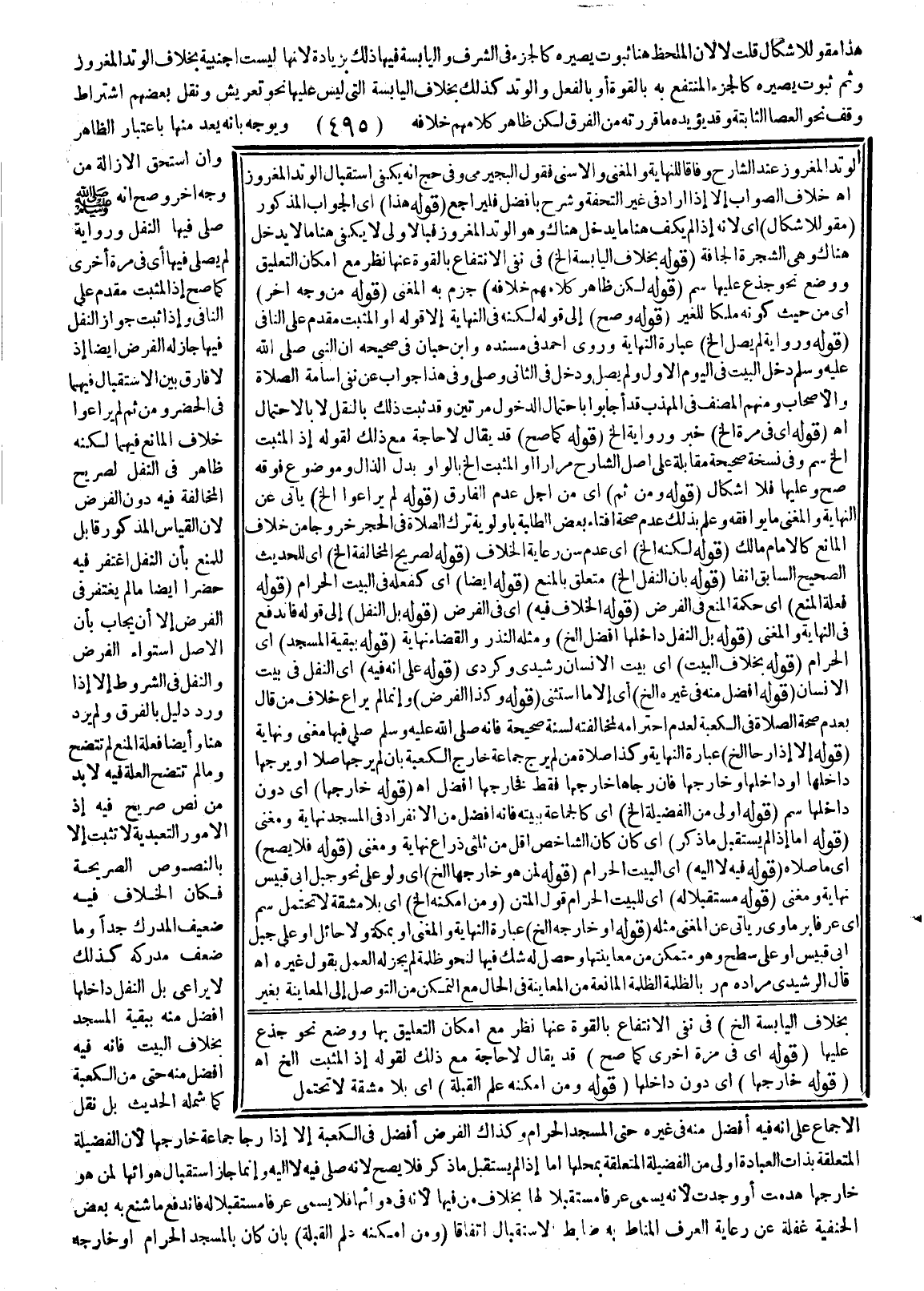وَلَمْ يَرِدْ هُنَا وَأَيْضًا فَعِلَّةُ الْمَنْعِ لَمْ تَتَّضِحْ وَمَا لَمْ تَتَّضِحْ الْعِلَّةُ فِيهِ لَا بُدَّ مِنْ نَصٍّ صَرِيحٍ فِيهِ إذْ الْأُمُورُ التَّعَبُّدِيَّةُ لَا تَثْبُتُ إلَّا بِالنُّصُوصِ الصَّرِيحَةِ فَكَانَ الْخِلَافُ فِيهِ ضَعِيفَ الْمَدْرَكِ جِدًّا وَمَا ضَعْف مَدْرَكُهُ كَذَلِكَ لَا يُرَاعَى، بَلْ النَّفَلُ دَاخِلَهَا أَفْضَلُ مِنْهُ بِبَقِيَّةِ الْمَسْجِدِ بِخِلَافِ الْبَيْتِ فَإِنَّهُ فِيهِ أَفْضَلُ مِنْهُ حَتَّى مِنْ الْكَعْبَةِ كَمَا شَمِلَهُ الْحَدِيثُ، بَلْ نُقِلَ الْإِجْمَاعُ عَلَى أَنَّهُ فِيهِ أَفْضَلُ مِنْهُ فِي غَيْرِهِ حَتَّى الْمَسْجِدِ الْحَرَامِ، وَكَذَاك الْفَرْضُ أَفْضَلُ فِي الْكَعْبَةِ إلَّا إذَا رَجَا جَمَاعَةً خَارِجَهَا؛ لِأَنَّ الْفَضِيلَةَ الْمُتَعَلِّقَةَ بِذَاتِ الْعِبَادَةِ أَوْلَى مِنْ الْفَضِيلَةِ الْمُتَعَلِّقَةِ بِمَحَلِّهَا أَمَّا إذَا لَمْ يَسْتَقْبِلْ مَا ذُكِرَ فَلَا يَصِحُّ؛ لِأَنَّهُ صَلَّى فِيهِ لَا إلَيْهِ وَإِنَّمَا جَازَ اسْتِقْبَالُ هَوَائِهَا لِمَنْ هُوَ خَارِجَهَا هُدِمَتْ، أَوْ وُجِدَتْ؛ لِأَنَّهُ يُسَمَّى عُرْفًا مُسْتَقْبِلًا لَهَا بِخِلَافِ مَنْ فِيهَا؛ لِأَنَّهُ فِي هَوَائِهَا فَلَا يُسَمَّى عُرْفًا مُسْتَقْبِلًا لَهُ فَانْدَفَعَ مَا شَنَّعَ بِهِ بَعْضُ الْحَنَفِيَّةِ غَفْلَةً عَنْ رِعَايَةِ الْعُرْفِ الْمُنَاطِ بِهِ ضَابِطُ الِاسْتِقْبَالِ اتِّفَاقًا