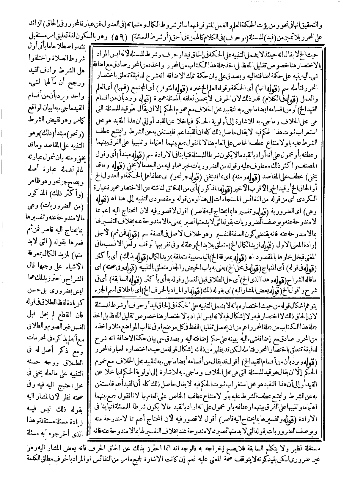 وَالتَّحْقِيقُ أَنَّهَا فِي نَحْوِ وَمَنْ يُؤْتَ الْحِكْمَةَ الْعِلْمَ وَالْعَمَلَ الْمُتَوَفِّرَ فِيهِمَا سَائِرُ شُرُوطِ الْكَمَالِ وَمُتَمِّمَاتِهِ (فِي الْعُدُولِ عَنْ عِبَارَةِ الْمُحَرَّرِ وَفِي إلْحَاقِ) الزَّائِدِ عَلَى الْمُحَرَّرِ بِلَا تَمْيِيزٍ مِنْ (قَيْدٍ) لِلْمَسْأَلَةِ (أَوْ حَرْفٍ) فِي الْكَلَامِ كَالْهَمْزَةِ فِي أَحَقَّ (أَوْ شَرْطٍ لِلْمَسْأَلَةِ) وَهُوَ بِالسُّكُونِ لُغَةً تَعْلِيقُ أَمْرٍ مُسْتَقْبَلٍ بِمِثْلِهِ، وَاصْطِلَاحًا مَا يَأْتِي أَوَّلَ شُرُوطِ الصَّلَاةِ وَاخْتَلَفُوا هَلْ الشَّرْطُ يُرَادِفُ الْقَيْدَ، وَرُجِّحَ أَنَّ مَآلَهُمَا لِشَيْءٍ وَاحِدٍ وَيُرَدُّ بِأَنَّ مِنْ أَقْسَامِ الْقَيْدِ مَا جِيءَ بِهِ لِبَيَانِ الْوَاقِعِ كَمَا مَرَّ، وَهُوَ نَقِيضُ الشَّرْطِ (وَنَحْوُ) مُبْتَدَأٌ (ذَلِكَ) وَهُوَ التَّنْبِيهُ عَلَى الْمَقَاصِدِ وَمَا قَدْ يَخْفَى وَمِنْهُ بَيَانُ شُمُولِ عِبَارَتِهِ لِمَا لَمْ تَشْمَلْهُ عِبَارَةُ أَصْلِهِ، وَيَصِحُّ جَرُّ نَحْوُ وَهُوَ ظَاهِرٌ (وَأَكْثَرُ ذَلِكَ) الْمَذْكُورِ (مِنْ الضَّرُورِيَّاتِ) وَهِيَ مَا لَا مَنْدُوحَةَ عَنْهُ، وَتَفْسِيرُهَا بِمَا يُحْتَاجُ إلَيْهِ قَاصِرٌ فَمِنْ ثَمَّ فَسَّرَهَا بِقَوْلِهِ (الَّتِي لَا بُدَّ مِنْهَا) لِمُرِيدِ الْكَمَالِ بِمَعْرِفَةِ الْأَشْيَاءِ عَلَى وَجْهِهَا، قَالَ الشُّرَّاحُ وَاحْتُرِزَ بِذَلِكَ عَمَّا لَيْسَ بِضَرُورِيٍّ بَلْ حَسَنٌ كَزِيَادَةِ لَفْظِ الطَّلَاقِ فِي قَوْلِهِ فَإِنْ انْقَطَعَ لَمْ يَحِلَّ قَبْلَ الْغُسْلِ غَيْرُ الصَّوْمِ وَالطَّلَاقِ مَعَ أَنَّهُ لَمْ يَذْكُرْهُ فِي الْمُحَرَّمَاتِ وَمَعَ ذِكْرِ أَصْلٍ لَهُ فِي الطَّلَاقِ وَوَجْهُ حُسْنِهِ التَّنْبِيهُ عَلَى مَا لَعَلَّهُ يَخْفَى فِي مَحَلٍّ اُحْتِيجَ إلَيْهِ فِيهِ.