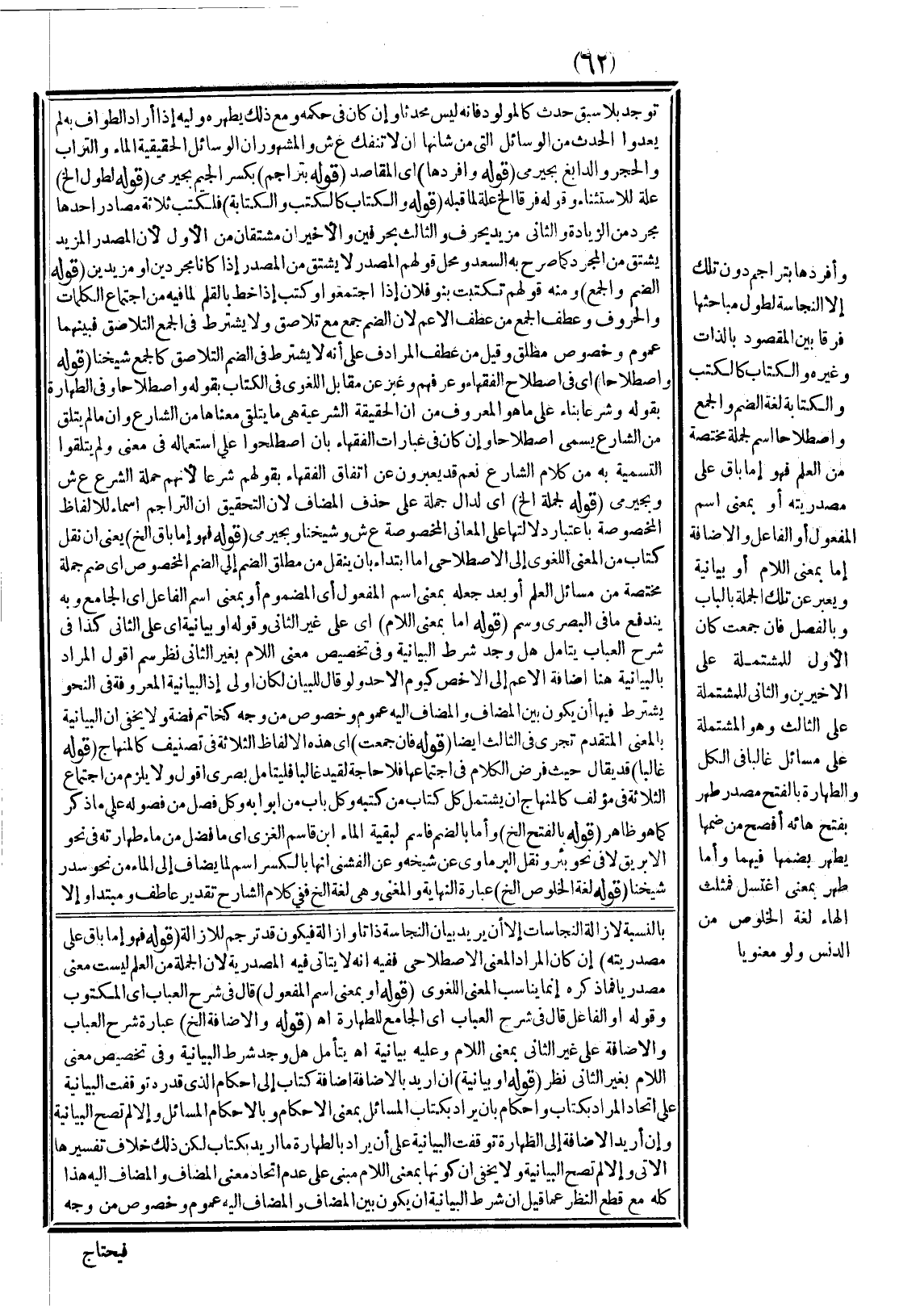 وَأَفْرَدَهَا بِتَرَاجِمَ دُونَ تِلْكَ إلَّا النَّجَاسَةَ لِطُولِ مَبَاحِثِهَا فَرْقًا بَيْنَ الْمَقْصُودِ بِالذَّاتِ وَغَيْرِهِ، وَالْكِتَابُ كَالْكَتْبِ وَالْكِتَابَةِ لُغَةً الضَّمُّ وَالْجَمْعُ، وَاصْطِلَاحًا اسْمٌ لِجُمْلَةٍ مُخْتَصَّةٍ مِنْ الْعِلْمِ فَهُوَ إمَّا بَاقٍ عَلَى مَصْدَرِيَّتِهِ أَوْ بِمَعْنَى اسْمِ الْمَفْعُولِ أَوْ الْفَاعِلِ وَالْإِضَافَةُ إمَّا بِمَعْنَى اللَّامِ أَوْ بَيَانِيَّةٌ، وَيُعَبَّرُ عَنْ تِلْكَ الْجُمْلَةِ بِالْبَابِ وَبِالْفَضْلِ فَإِنْ جُمِعَتْ كَانَ الْأَوَّلُ لِلْمُشْتَمِلَةِ عَلَى الْأَخِيرَيْنِ وَالثَّانِي لِلْمُشْتَمِلَةِ عَلَى الثَّالِثِ وَهُوَ الْمُشْتَمِلَةُ عَلَى مَسَائِلَ غَالِبًا فِي الْكُلِّ، وَالطَّهَارَةُ بِالْفَتْحِ مَصْدَرُ طَهُرَ بِفَتْحِ هَائِهِ أَفْصَحُ مِنْ ضَمِّهَا يَطْهُرُ بِضَمِّهَا فِيهِمَا، وَأَمَّا طَهُرَ بِمَعْنَى اغْتَسَلَ فَمُثَلَّثُ الْهَاءِ لُغَةً الْخُلُوصُ مِنْ الدَّنَسِ وَلَوْ مَعْنَوِيًّا