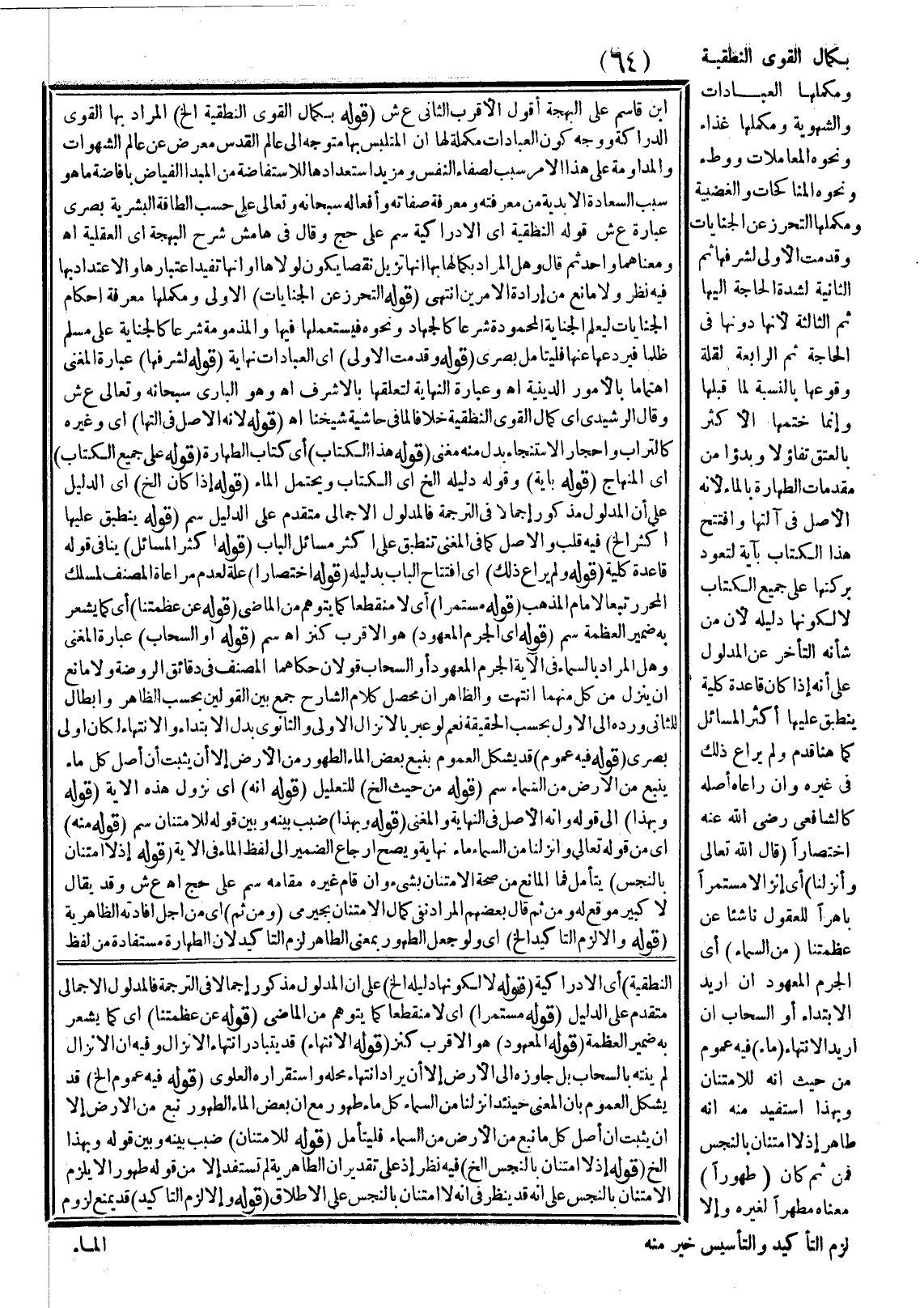 بِكَمَالِ الْقُوَى النُّطْقِيَّةِ وَمُكَمِّلُهَا الْعِبَادَاتُ، وَالشَّهَوِيَّةِ وَمُكَمِّلُهَا غِذَاءٌ وَنَحْوُهُ الْمُعَامَلَاتُ، وَوَطْءٌ وَنَحْوُهُ الْمُنَاكَحَاتُ، وَالْغَضَبِيَّةُ وَمُكَمِّلُهَا التَّحَرُّزُ عَنْ الْجِنَايَاتِ، وَقُدِّمَتْ الْأُولَى لِشَرَفِهَا، ثُمَّ الثَّانِيَةُ لِشِدَّةِ الْحَاجَةِ إلَيْهَا، ثُمَّ الثَّالِثَةُ؛ لِأَنَّهَا دُونَهَا فِي الْحَاجَةِ، ثُمَّ الرَّابِعَةُ لِقِلَّةِ وُقُوعِهَا بِالنِّسْبَةِ لِمَا قَبْلَهَا، وَإِنَّمَا خَتَمَهَا الْأَكْثَرُ بِالْعِتْقِ تَفَاؤُلًا.