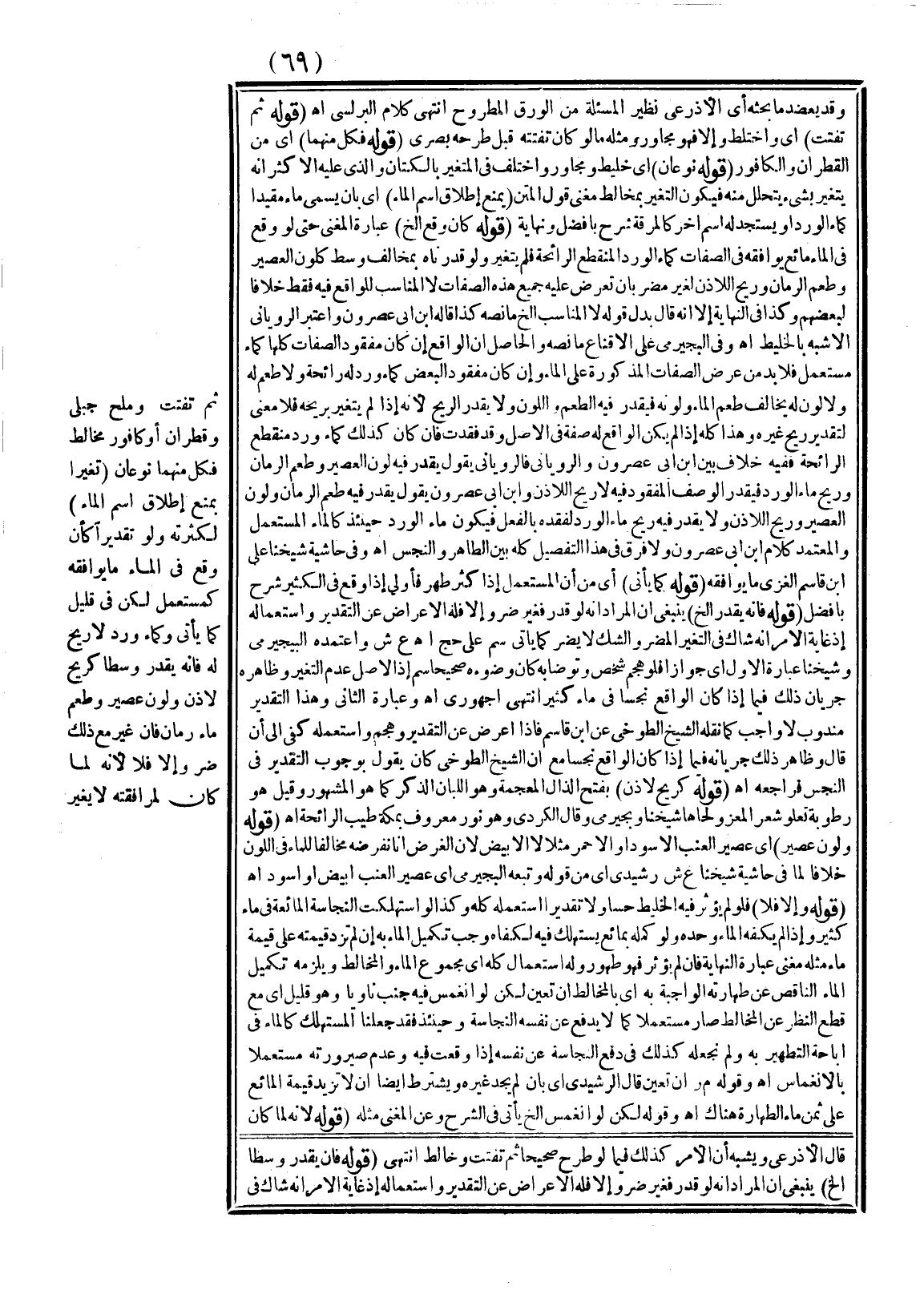 وَفِي الْبُجَيْرِمِيِّ عَلَى الْإِقْنَاعِ مَا نَصُّهُ، وَالْحَاصِلُ أَنَّ الْوَاقِعَ إنْ كَانَ مَفْقُودَ الصِّفَاتِ كُلِّهَا كَمَاءٍ مُسْتَعْمَلٍ فَلَا بُدَّ مِنْ عَرْضِ الصِّفَاتِ الْمَذْكُورَةِ عَلَى الْمَاءِ، وَإِنْ كَانَ مَفْقُودَ الْبَعْضِ كَمَاءِ وَرْدٍ لَهُ رَائِحَةٌ وَلَا طَعْمَ لَهُ وَلَا لَوْنَ لَهُ يُخَالِفُ طَعْمَ الْمَاءِ وَلَوْنَهُ فَيُقَدَّرُ فِيهِ الطَّعْمُ وَاللَّوْنُ وَلَا يُقَدَّرُ الرِّيحُ؛ لِأَنَّهُ إذَا لَمْ يَتَغَيَّرْ بِرِيحِهِ فَلَا مَعْنَى لِتَقْدِيرِ رِيحِ غَيْرِهِ، وَهَذَا كُلُّهُ إذَا لَمْ يَكُنْ الْوَاقِعُ لَهُ صِفَةٌ فِي الْأَصْلِ، وَقَدْ فُقِدَتْ فَإِنْ كَانَ كَذَلِكَ كَمَاءِ وَرْدٍ مُنْقَطِعِ الرَّائِحَةِ فَفِيهِ خِلَافٌ بَيْنَ ابْنِ أَبِي عَصْرُونٍ وَالرُّويَانِيِّ فَالرُّويَانِيُّ يَقُولُ يُقَدَّرُ فِيهِ لَوْنُ الْعَصِيرِ وَطَعْمُ الرُّمَّانِ وَرِيحُ مَاءِ الْوَرْدِ فَيُقَدَّرُ الْوَصْفُ الْمَفْقُودُ فِيهِ لَا رِيحُ اللَّاذَنِ وَابْنُ أَبِي عَصْرُونٍ يَقُولُ يُقَدَّرُ فِيهِ طَعْمُ الرُّمَّانِ وَلَوْنُ الْعَصِيرِ وَرِيحُ اللَّاذَنِ وَلَا يُقَدَّرُ فِيهِ رِيحُ مَاءِ الْوَرْدِ لِفَقْدِهِ بِالْفِعْلِ فَيَكُونُ مَاءُ الْوَرْدِ حِينَئِذٍ كَالْمَاءِ الْمُسْتَعْمَلِ وَالْمُعْتَمَدُ