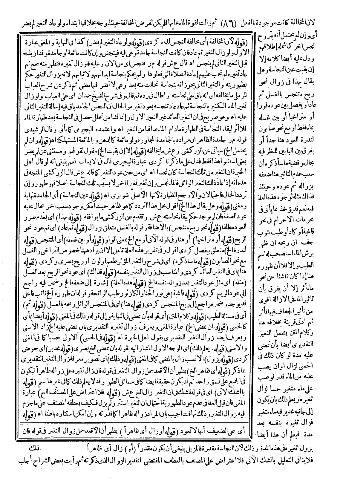 وَقَضِيَّةُ مَا سَأَذْكُرُهُ أَنَّ سَبَبَ عَدَمِ التَّأْثِيرِ هُنَا ضَعْفُهُ بِزَوَالِهِ، ثُمَّ عَوْدُهُ وَحِينَئِذٍ فَذَاكَ مِثْلُهُ لِوُجُودِ هَذِهِ الْعِلَّةِ فِيهِ نَعَمْ قَدْ يُؤْخَذُ مِمَّا يَأْتِي فِي مُحَرَّمَاتِ الْإِحْرَامِ فِي نَحْوِ فَاغِيَةٍ أَوْ كَادٍ أَوْ طِيبٍ بِثَوْبٍ جَفَّ أَنَّ رِيحَهُ إنْ ظَهَرَ بِرَشِّ الْمَاءِ اُسْتُصْحِبَ لَهُ اسْمُ الطِّيبِ وَإِلَّا فَلَا لِأَنَّ ظُهُورَهُ هُنَا إذَا كَانَ نَاشِئًا عَنْ نَحْوِ مَاءٍ أَثَّرَ إلَّا أَنْ يُفَرِّقَ بِأَنَّ تَأْثِيرَ الْمَاءِ فِي الْإِزَالَةِ أَقْوَى مِنْ تَأْثِيرِ الْجَفَافِ فِيهَا فَأَثَّرَ، ثُمَّ أَدْنَى قَرِينَةٍ بِخِلَافِهِ هُنَا، وَكَلَامُ الْمَتْنِ يَشْمَلُ التَّغَيُّرَ التَّقْدِيرِيَّ أَيْضًا بِأَنْ تَمْضِيَ عَلَيْهِ مُدَّةٌ لَوْ كَانَ ذَلِكَ فِي الْحِسِّيِّ لَزَالَ أَوْ أَنْ يَصُبَّ عَلَيْهِ مِنْ الْمَاءِ قَدْرٌ لَوْ صُبَّ عَلَى مَاءٍ مُتَغَيِّرٍ حِسًّا لَزَالَ تَغَيُّرُهُ.