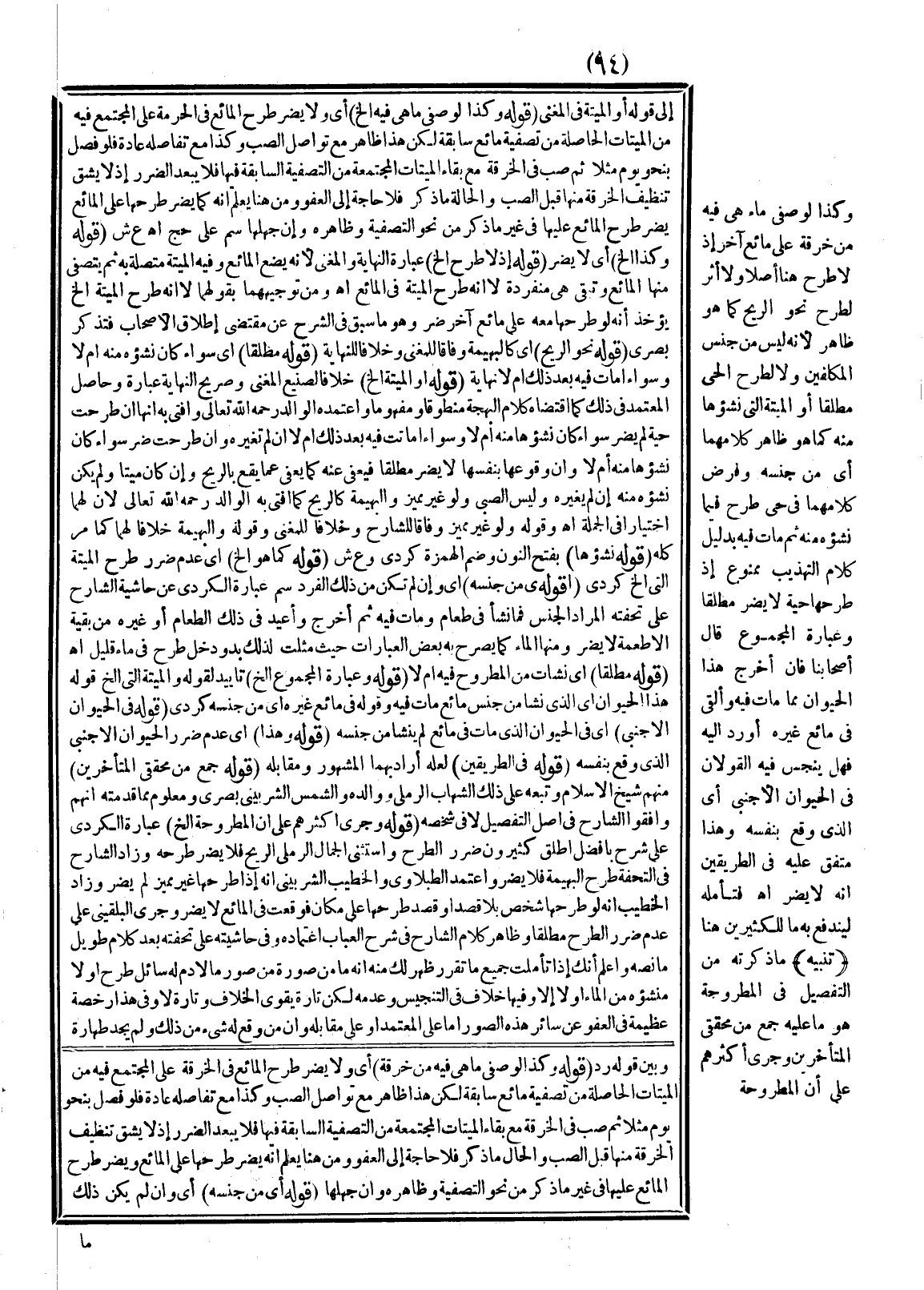 ـــــــــــــــــــــــــــــSوَبَيْنَ قَوْلِهِ رُدَّ (قَوْلُهُ وَكَذَا لَوْ صَفَّى مَا هِيَ فِيهِ مِنْ خِرْقَةٍ) أَيْ وَلَا يَضُرُّ طَرْحُ الْمَائِعِ فِي الْخِرْقَةِ عَلَى الْمُجْتَمِعِ فِيهِ مِنْ الْمَيْتَاتِ الْحَاصِلَةِ مِنْ تَصْفِيَةِ مَائِعٍ سَابِقَةٍ لَكِنْ هَذَا ظَاهِرٌ مَعَ تَوَاصُلِ الصَّبِّ وَكَذَا مَعَ تَفَاصُلِهِ عَادَةً فَلَوْ فُصِلَ بِنَحْوِ يَوْمٍ مَثَلًا ثُمَّ صُبَّ فِي الْخِرْقَةِ مَعَ بَقَاءِ الْمَيْتَاتِ الْمُجْتَمِعَةِ مِنْ التَّصْفِيَةِ السَّابِقَةِ فِيهَا فَلَا يَبْعُدُ الضَّرَرُ إذْ لَا يَشُقُّ تَنْظِيفُ الْخِرْقَةِ مِنْهَا قَبْلَ الصَّبِّ، وَالْحَالُ مَا ذُكِرَ فَلَا حَاجَةَ إلَى الْعَفْوِ وَمِنْ هُنَا يُعْلَمُ أَنَّهُ يَضُرُّ طَرْحُهَا عَلَى الْمَائِعِ وَيَضُرُّ طَرْحُ الْمَائِعِ عَلَيْهَا فِي غَيْرِ مَا ذُكِرَ مِنْ نَحْوِ التَّصْفِيَةِ وَظَاهِرُهُ وَإِنْ جَهِلَهَا (قَوْلُهُ أَيْ مِنْ جِنْسِهِ) أَيْ وَإِنْ لَمْ يَكُنْ ذَلِكَ