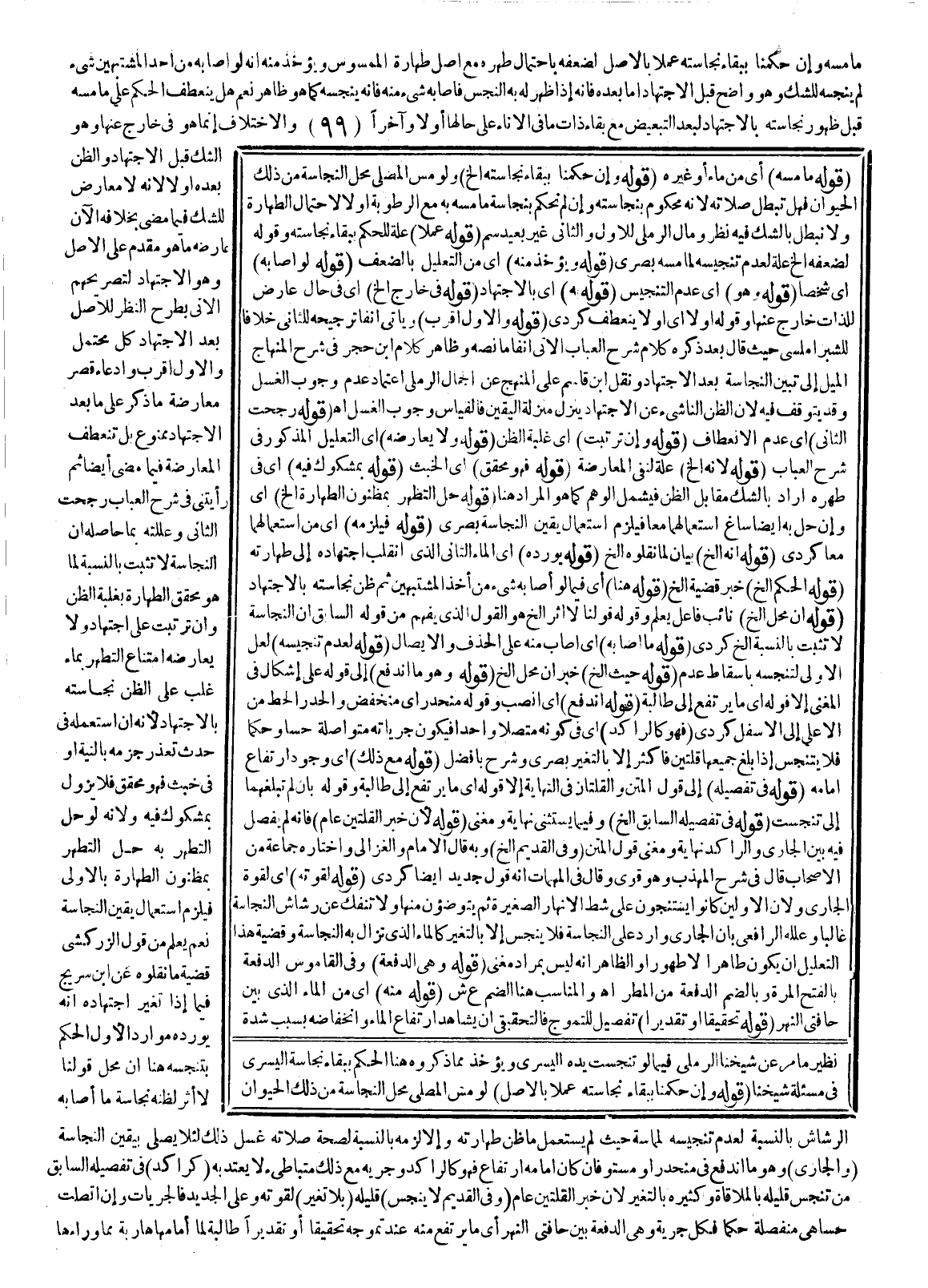 وَالِاخْتِلَافُ إنَّمَا هُوَ فِي خَارِجٍ عَنْهَا وَهُوَ الشَّكُّ قَبْلَ الِاجْتِهَادِ وَالظَّنُّ بَعْدَهُ أَوْ لَا؛ لِأَنَّهُ لَا مُعَارِضَ لِلشَّكِّ فِيمَا مَضَى بِخِلَافِهِ الْآنَ عَارَضَهُ مَا هُوَ مُقَدَّمٌ عَلَى الْأَصْلِ وَهُوَ الِاجْتِهَادُ لِتَصْرِيحِهِمْ الْآتِي بِطَرْحِ النَّظَرِ لِلْأَصْلِ بَعْدَ الِاجْتِهَادِ كُلٌّ مُحْتَمَلٌ، وَالْأَوَّلُ أَقْرَبُ وَادِّعَاءُ قَصْرِ مُعَارَضَةِ مَا ذُكِرَ عَلَى مَا بَعْدَ الِاجْتِهَادِ مَمْنُوعٌ بَلْ تَنْعَطِفُ الْمُعَارَضَةُ فِيمَا مَضَى أَيْضًا، ثُمَّ رَأَيْتنِي فِي شَرْحِ الْعُبَابِ رَجَّحْت الثَّانِيَ وَعَلَّلْته بِمَا حَاصِلُهُ أَنَّ النَّجَاسَةَ لَا تَثْبُتُ بِالنِّسْبَةِ لِمَا هُوَ مُحَقَّقُ الطَّهَارَةِ بِغَلَبَةِ الظَّنِّ، وَإِنْ تَرَتَّبَتْ عَلَى اجْتِهَادٍ وَلَا يُعَارِضُهُ امْتِنَاعُ التَّطَهُّرِ بِمَاءٍ غَلَبَ عَلَى الظَّنِّ نَجَاسَتُهُ بِالِاجْتِهَادِ؛ لِأَنَّهُ إنْ اسْتَعْمَلَهُ فِي حَدَثٍ تَعَذَّرَ جَزْمُهُ بِالنِّيَّةِ أَوْ فِي خَبَثٍ فَهُوَ مُحَقَّقٌ فَلَا يَزُولُ بِمَشْكُوكٍ فِيهِ، وَلِأَنَّهُ لَوْ حَلَّ التَّطَهُّرُ بِهِ حَلَّ التَّطَهُّرُ بِمَظْنُونِ الطَّهَارَةِ بِالْأَوْلَى فَيَلْزَمُ اسْتِعْمَالُ يَقِينِ النَّجَاسَةِ نَعَمْ يُعْلَمُ مِنْ قَوْلِ الزَّرْكَشِيّ قَضِيَّةُ مَا نَقَلُوهُ عَنْ ابْنِ سُرَيْجٍ فِيمَا إذَا تَغَيَّرَ اجْتِهَادُهُ أَنَّهُ يُورِدُهُ مَوَارِدَ الْأَوَّلِ الْحُكْمُ بِتَنَجُّسِهِ هُنَا أَنَّ مَحَلَّ قَوْلِنَا لَا أَثَرَ لِظَنِّهِ نَجَاسَةَ مَا أَصَابَهُ الرُّشَاشُ بِالنِّسْبَةِ لِعَدَمِ تَنْجِيسِهِ لِمُمَاسِّهِ حَيْثُ لَمْ يُسْتَعْمَلْ مَا ظَنَّ طَهَارَتَهُ، وَإِلَّا لَزِمَهُ بِالنِّسْبَةِ لِصِحَّةِ صَلَاتِهِ غَسْلُ ذَلِكَ لِئَلَّا يُصَلِّيَ بِيَقِينِ النَّجَاسَةِ.