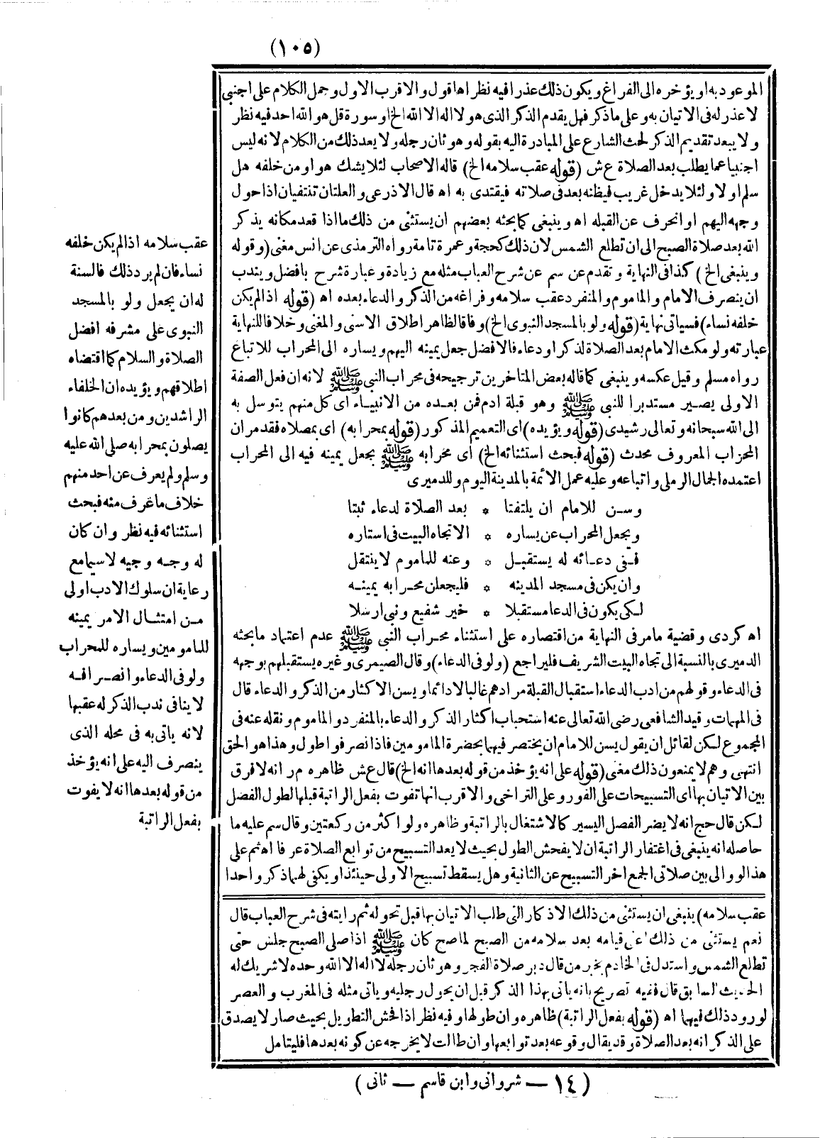 عَقِبَ سَلَامِهِ إذَا لَمْ يَكُنْ خَلْفَهُ نِسَاءٌ فَإِنْ لَمْ يُرِدْ ذَلِكَ فَالسُّنَّةُ لَهُ أَنْ يَجْعَلَ وَلَوْ بِالْمَسْجِدِ النَّبَوِيِّ عَلَى مُشَرِّفِهِ أَفْضَلُ الصَّلَاةِ وَالسَّلَامِ كَمَا اقْتَضَاهُ إطْلَاقُهُمْ وَيُؤَيِّدُهُ أَنَّ الْخُلَفَاءَ الرَّاشِدِينَ وَمَنْ بَعْدَهُمْ كَانُوا يُصَلُّونَ بِمِحْرَابِهِ - صَلَّى اللَّهُ عَلَيْهِ وَسَلَّمَ - وَلَمْ يُعْرَفْ عَنْ أَحَدٍ مِنْهُمْ خِلَافُ مَا عُرِفَ مِنْهُ فَبَحْثُ اسْتِثْنَائِهِ فِيهِ نَظَرٌ وَإِنْ كَانَ لَهُ وَجْهٌ وَجِيهٌ لَا سِيَّمَا مَعَ رِعَايَةِ أَنَّ سُلُوكَ الْأَدَبِ أَوْلَى مِنْ امْتِثَالِ الْأَمْرِ يَمِينُهُ لِلْمَأْمُومَيْنِ وَيَسَارُهُ لِلْمِحْرَابِ وَلَوْ فِي الدُّعَاءِ وَانْصِرَافُهُ لَا يُنَافِي نَدْبَ الذِّكْرِ لَهُ عَقِبَهَا لِأَنَّهُ يَأْتِي بِهِ فِي مَحَلِّهِ الَّذِي يَنْصَرِفُ إلَيْهِ عَلَى أَنَّهُ يُؤْخَذُ مِنْ قَوْلِهِ بَعْدَهَا أَنَّهُ لَا يَفُوتُ بِفِعْلِ الرَّاتِبَةِ