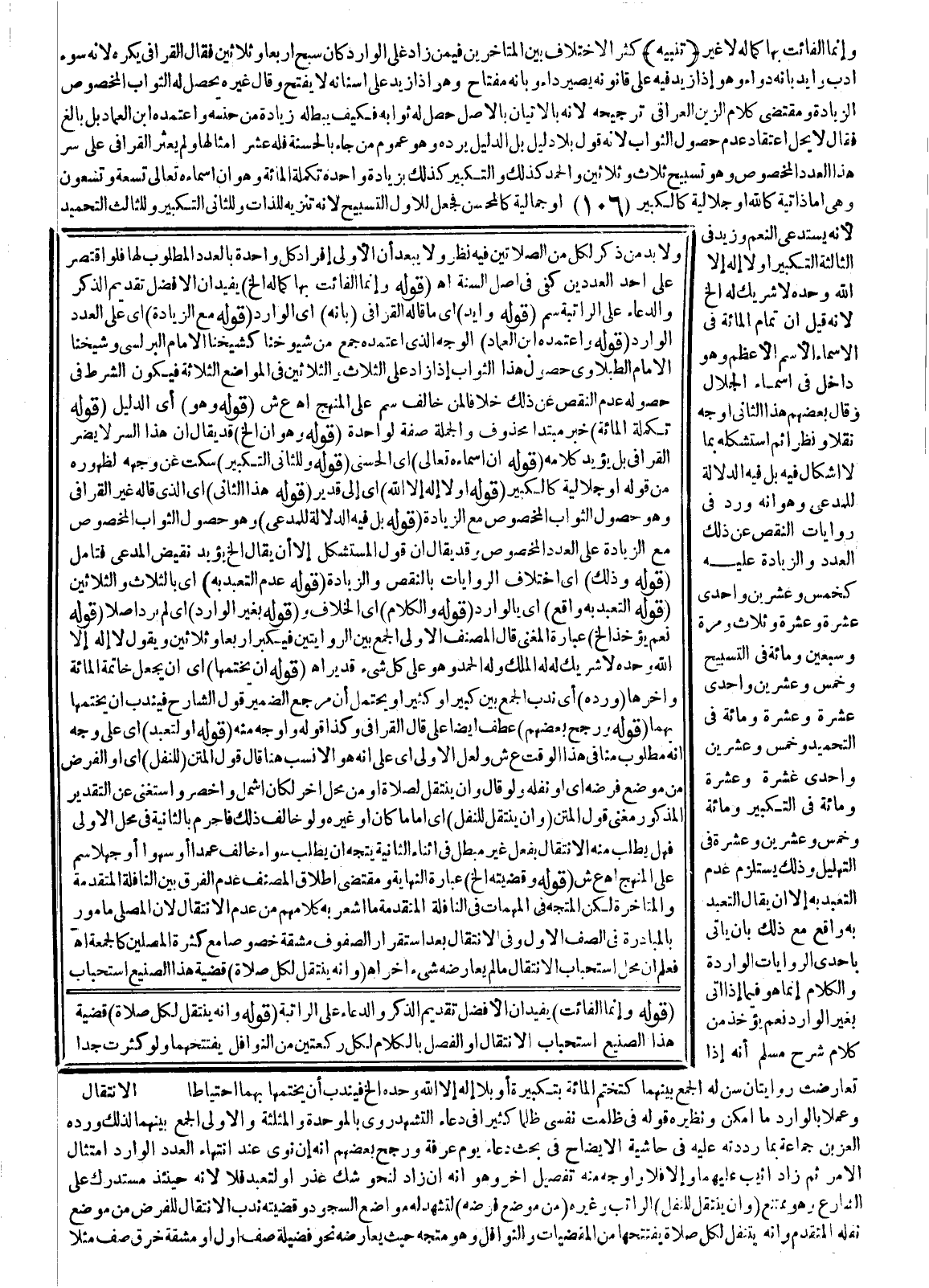 (قَوْلُهُ وَإِنَّمَا الْفَائِتُ بِهَا كَمَالُهُ إلَخْ) يُفِيدُ أَنَّ الْأَفْضَلَ تَقْدِيمُ الذِّكْرِ وَالدُّعَاءِ عَلَى الرَّاتِبَةِ سم (قَوْلُهُ وَأَيَّدَ) أَيْ مَا قَالَهُ الْقَرَافِيُّ (بِأَنَّهُ) أَيْ الْوَارِدَ (قَوْلُهُ مَعَ الزِّيَادَةِ) أَيْ عَلَى الْعَدَدِ الْوَارِدِ (قَوْلُهُ وَاعْتَمَدَهُ ابْنُ الْعِمَادِ) الْوَجْهُ الَّذِي اعْتَمَدَهُ جَمْعٌ مِنْ شُيُوخِنَا كَشَيْخِنَا الْإِمَامِ الْبُرُلُّسِيِّ وَشَيْخِنَا الْإِمَامِ الطَّبَلَاوِيِّ حُصُولُ هَذَا الثَّوَابِ إذَا زَادَ عَلَى الثَّلَاثِ وَالثَّلَاثِينَ فِي الْمَوَاضِعِ الثَّلَاثَةِ فَيَكُونُ الشَّرْطُ فِي حُصُولِهِ عَدَمَ النَّقْصِ عَنْ ذَلِكَ خِلَافًا لِمَنْ خَالَفَ سم عَلَى الْمَنْهَجِ اهـ ع ش (قَوْلُهُ وَهُوَ) أَيْ الدَّلِيلُ (قَوْلُهُ تَكْمِلَةُ الْمِائَةِ) خَبَرُ مُبْتَدَأٍ مَحْذُوفٍ وَالْجُمْلَةُ صِفَةٌ لِوَاحِدَةٍ (قَوْلُهُ وَهُوَ أَنَّ إلَخْ) قَدْ يُقَالُ إنَّ هَذَا السِّرَّ لَا يَضُرُّ الْقَرَافِيُّ بَلْ يُؤَيِّدُ كَلَامَهُ (قَوْلُهُ إنَّ أَسْمَاءَهُ تَعَالَى) أَيْ الْحُسْنَى (قَوْلُهُ وَلِلثَّانِي التَّكْبِيرُ) سَكَتَ عَنْ وَجْهِهِ لِظُهُورِهِ مِنْ قَوْلِهِ أَوْ جَلَالِيَّةٌ كَالْكَبِيرِ (قَوْلُهُ أَوْ لَا إلَهَ إلَّا اللَّهُ) أَيْ إلَى قَدِيرٌ (قَوْلُهُ هَذَا الثَّانِي) أَيْ الَّذِي قَالَهُ غَيْرُ الْقَرَافِيِّ وَهُوَ حُصُولُ الثَّوَابِ الْمَخْصُوصِ مَعَ الزِّيَادَةِ (قَوْلُهُ بَلْ فِيهِ الدَّلَالَةُ لِلْمُدَّعِي) وَهُوَ حُصُولُ الثَّوَابِ الْمَخْصُوصِ مَعَ الزِّيَادَةِ عَلَى الْعَدَدِ الْمَخْصُوصِ وَقَدْ يُقَالُ إنَّ قَوْلَ الْمُسْتَشْكِلِ إلَّا أَنْ يُقَالَ إلَخْ يُؤَيِّدُ نَقِيضَ الْمُدَّعِي فَتَأَمَّلْ (قَوْلُهُ وَذَلِكَ) أَيْ اخْتِلَافُ الرِّوَايَاتِ بِالنَّقْصِ وَالزِّيَادَةِ (قَوْلُهُ عَدَمَ التَّعَبُّدِ بِهِ) أَيْ بِالثَّلَاثِ وَالثَّلَاثِينَ (قَوْلُهُ التَّعَبُّدُ بِهِ وَاقِعٌ) أَيْ بِالْوَارِدِ (قَوْلُهُ وَالْكَلَامُ) أَيْ الْخِلَافُ وَ (قَوْلُهُ بِغَيْرِ الْوَارِدِ) أَيْ لَمْ يَرِدْ أَصْلًا (قَوْلُهُ نَعَمْ يُؤْخَذُ إلَخْ) عِبَارَةُ الْمُغْنِي قَالَ الْمُصَنِّفُ الْأَوْلَى الْجَمْعُ بَيْنَ الرِّوَايَتَيْنِ فَيُكَبِّرُ أَرْبَعًا وَثَلَاثِينَ وَيَقُولُ لَا إلَهَ إلَّا اللَّهُ وَحْدَهُ لَا شَرِيكَ لَهُ لَهُ الْمُلْكُ وَلَهُ الْحَمْدُ وَهُوَ عَلَى كُلِّ شَيْءٍ قَدِيرٌ اهـ.