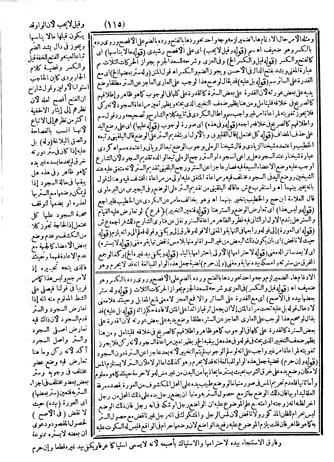ـــــــــــــــــــــــــــــSالْإِدْغَامِ هَاءُ الضَّمِيرِ لَزِمَ وَجْهٌ وَاحِدٌ نَحْوُ رَدِّهَا بِالْفَتْحِ وَرَدِّهِ بِالضَّمِّ عَلَى الْأَفْصَحِ وَرُوِيَ رَدُّهُ بِالْكَسْرِ، وَهُوَ ضَعِيفٌ اهـ (قَوْلُهُ قِيلَ وَالْكَسْرُ) فِي الْغَزِّيِّ وَشَرْحِهِ لِلسَّعْدِ الْجَزْمُ بِجَوَازِ الْحَرَكَاتِ الثَّلَاثِ (قَوْلُهُ وَلَهُ سَتْرُ بَعْضِهَا بِيَدِهِ فِي الْأَصَحِّ) أَيْ مَعَ الْقُدْرَةِ عَلَى السَّاتِرِ وَإِلَّا فَمَعَ الْعَجْزِ لَا مَعْنَى لِمَنْعِ الْمُقَابِلِ وَحِينَئِذٍ فَلَا مَعْنَى لِإِدْخَالِ قَوْلِهِ بَلْ عَلَيْهِ تَحْتَ مُرَادِ الْمَتْنِ إلَّا أَنْ يُجْعَلَ تَرَقِّيًا زَائِدًا عَلَى الْمَتْنِ لِإِفَادَةِ حُكْمٍ زَائِدٍ (قَوْلُهُ بَلْ عَلَيْهِ) قَدْ يُقَالُ لَوْ صُحِّحَ هَذَا لَوَجَبَ عَلَى الْعَارِي الْعَاجِزِ عَنْ السَّتْرِ مُطْلَقًا وَضْعُ يَدَيْهِ عَلَى بَعْضِ عَوْرَتِهِ؛ لِأَنَّ الْقُدْرَةَ عَلَى بَعْضِ السُّتْرَةِ كَالْقُدْرَةِ عَلَى كُلِّهَا فِي الْوُجُوبِ كَمَا هُوَ ظَاهِرٌ وَإِطْلَاقُهُمْ كَالصَّرِيحِ فِي خِلَافِهِ فَلْيُتَأَمَّلْ وَمِنْ هُنَا يَظْهَرُ ضَعْفُ التَّخْيِيرِ الَّذِي بَحَثَهُ فِي قَوْلِهِ وَفِي هَذِهِ هَلْ يُبْقِيهِ إلَخْ وَيَظْهَرُ تَعَيُّنُ مُرَاعَاةِ السُّجُودِ؛ لِأَنَّهُ رُكْنٌ فَلَا يَجُوزُ تَفْوِيتُهُ لِمُرَاعَاةِ أَمْرٍ غَيْرِ وَاجِبٍ عَلَى أَنَّهُ لَوْ سَلَّمَ الْوُجُوبَ لَمْ يَتِمَّ التَّخْيِيرُ؛ لِأَنَّهُ يُعَدُّ عَاجِزًا عَنْ السُّتْرَةِ دُونَ السُّجُودِ.