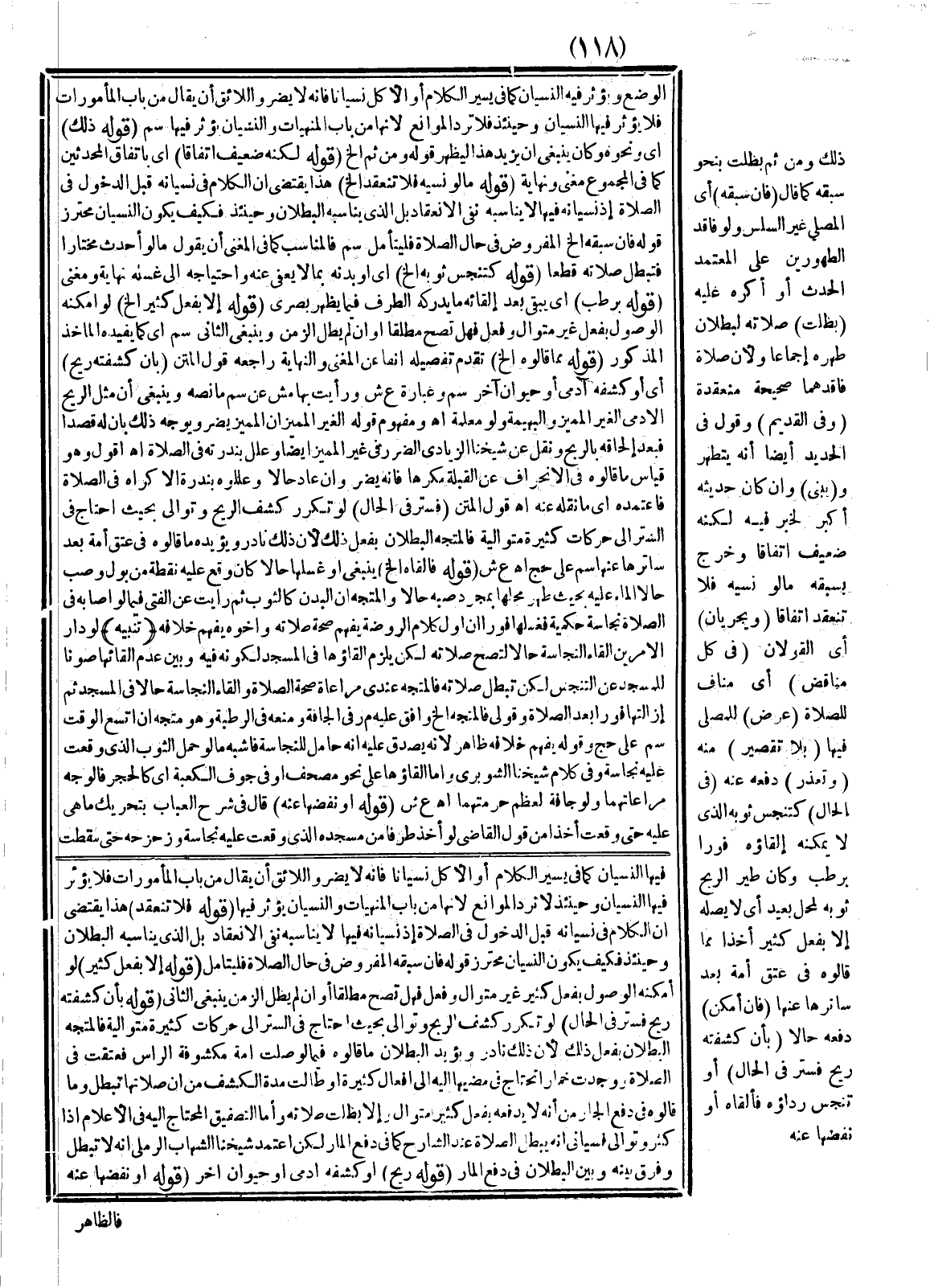 ـــــــــــــــــــــــــــــQالْوَضْعِ وَيُؤَثِّرُ فِيهِ النِّسْيَانُ كَمَا فِي يَسِيرِ الْكَلَامِ أَوْ الْأَكْلِ نِسْيَانًا فَإِنَّهُ لَا يَضُرُّ وَاللَّائِقُ أَنْ يُقَالَ مِنْ بَابِ الْمَأْمُورَاتِ فَلَا يُؤَثِّرُ فِيهَا النِّسْيَانُ وَحِينَئِذٍ فَلَا تَرِدُ الْمَوَانِعُ؛ لِأَنَّهَا مِنْ بَابِ الْمَنْهِيَّاتِ وَالنِّسْيَانُ يُؤَثِّرُ فِيهَا سم (قَوْلُهُ ذَلِكَ) أَيْ وَنَحْوُهُ وَكَانَ يَنْبَغِي أَنْ يَزِيدَ هَذَا لِيَظْهَرَ قَوْلُهُ وَمِنْ ثَمَّ إلَخْ (قَوْلُهُ لَكِنَّهُ ضَعِيفٌ اتِّفَاقًا) أَيْ بِاتِّفَاقِ الْمُحْدِثِينَ كَمَا فِي الْمَجْمُوعِ مُغْنِي وَنِهَايَةٌ (قَوْلُهُ مَا لَوْ نَسِيَهُ فَلَا تَنْعَقِدُ إلَخْ) هَذَا يَقْتَضِي أَنَّ الْكَلَامَ فِي نِسْيَانِهِ قَبْلَ الدُّخُولِ فِي الصَّلَاةِ إذْ نِسْيَانُهُ فِيهَا لَا يُنَاسِبُهُ نَفْيُ الِانْعِقَادِ بَلْ الَّذِي يُنَاسِبُهُ الْبُطْلَانُ وَحِينَئِذٍ فَكَيْفَ يَكُونُ النِّسْيَانُ مُحْتَرَزَ قَوْلِهِ فَإِنْ سَبَقَهُ إلَخْ الْمَفْرُوضُ فِي حَالِ الصَّلَاةِ فَلْيُتَأَمَّلْ سم فَالْمُنَاسِبُ كَمَا فِي الْمُغْنِي أَنْ يَقُولَ مَا لَوْ أَحْدَثَ مُخْتَارًا فَتَبْطُلُ صَلَاتُهُ قَطْعًا (قَوْلُهُ كَتَنَجُّسِ ثَوْبِهِ إلَخْ) أَيْ أَوْ بِدُونِهِ بِمَا لَا يُعْفَى عَنْهُ وَاحْتِيَاجِهِ إلَى غَسْلِهِ نِهَايَةٌ وَمُغْنِي (قَوْلُهُ بِرَطْبٍ) أَيْ يَبْقَى بَعْدَ إلْقَائِهِ مَا يُدْرِكُهُ الطَّرْفُ فِيمَا يَظْهَرُ بَصْرِيٌّ (قَوْلُهُ إلَّا بِفِعْلٍ كَثِيرٍ إلَخْ) لَوْ أَمْكَنَهُ الْوُصُولُ بِفِعْلٍ غَيْرِ مُتَوَالٍ وَفَعَلَ فَهَلْ تَصِحُّ مُطْلَقًا أَوْ إنْ لَمْ يَطُلْ الزَّمَنُ وَيَنْبَغِي الثَّانِي سم أَيْ كَمَا يُفِيدُهُ الْمَأْخَذُ الْمَذْكُورُ.