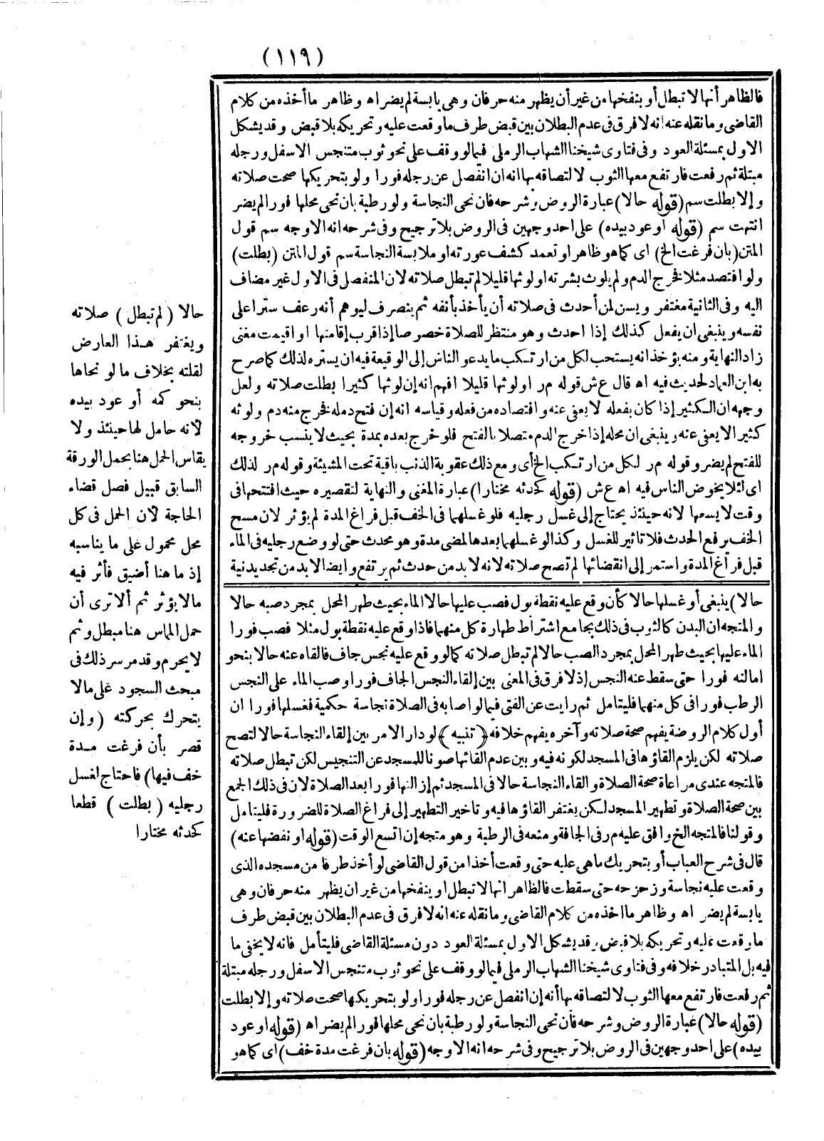 ـــــــــــــــــــــــــــــQفَالظَّاهِرُ أَنَّهَا لَا تَبْطُلُ أَوْ بِنَفْخِهَا مِنْ غَيْرِ أَنْ يَظْهَرَ مِنْهُ حَرْفَانِ وَهِيَ يَابِسَةٌ لَمْ يَضُرَّ انْتَهَى، وَظَاهِرُ مَا أَخَذَهُ مِنْ كَلَامِ الْقَاضِي وَمَا نَقَلَهُ عَنْهُ أَنَّهُ لَا فَرْقَ فِي عَدَمِ الْبُطْلَانِ بَيْنَ قَبْضِ طَرَفِ مَا وَقَعَتْ عَلَيْهِ وَتَحْرِيكِهِ بِلَا قَبْضٍ وَقَدْ يُشْكِلُ الْأَوَّلُ بِمَسْأَلَةِ الْعَوْدِ وَفِي فَتَاوَى شَيْخِنَا الشِّهَابِ الرَّمْلِيِّ فِيمَا لَوْ وَقَفَ عَلَى نَحْوِ ثَوْبٍ مُتَنَجِّسِ الْأَسْفَلِ وَرِجْلُهُ مُبْتَلَّةٌ ثُمَّ رُفِعَتْ فَارْتَفَعَ مَعَهَا الثَّوْبُ لِالْتِصَاقِهِ بِهَا أَنَّهُ إنْ انْفَصَلَ عَنْ رِجْلِهِ فَوْرًا وَلَوْ بِتَحْرِيكِهَا صَحَّتْ صَلَاتُهُ وَإِلَّا بَطَلَتْ سم (قَوْلُهُ حَالًا) عِبَارَةُ الرَّوْضِ وَشَرْحِهِ فَإِنْ نَحَّى النَّجَاسَةَ وَلَوْ رَطْبَةً بِأَنْ نَحَّى مَحَلَّهَا فَوْرًا لَمْ يَضُرَّ انْتَهَتْ اهـ. سم (قَوْلُهُ أَوْ عُودٍ بِيَدِهِ) عَلَى أَحَدِ وَجْهَيْنِ فِي الرَّوْضِ بِلَا تَرْجِيحٍ وَفِي شَرْحِهِ أَنَّهُ الْأَوْجَهُ سم قَوْلُ الْمَتْنِ (بِأَنْ فَرَغَتْ إلَخْ) أَيْ كَمَا هُوَ ظَاهِرٌ أَوْ تَعَمَّدَ كَشْفَ عَوْرَتِهِ أَوْ مُلَابَسَةَ النَّجَاسَةِ سم قَوْلُ الْمَتْنِ (بَطَلَتْ) وَلَوْ افْتَصَدَ مَثَلًا فَخَرَجَ الدَّمُ وَلَمْ يُلَوِّثْ بَشَرَتَهُ أَوْ لَوَّثَهَا قَلِيلًا لَمْ تَبْطُلْ صَلَاتُهُ؛ لِأَنَّ الْمُنْفَصِلَ فِي الْأُولَى غَيْرُ مُضَافٍ إلَيْهِ وَفِي الثَّانِيَةِ مُغْتَفَرٌ وَيُسَنُّ لِمَنْ أَحْدَثَ فِي صَلَاتِهِ أَنْ يَأْخُذَ بِأَنْفِهِ ثُمَّ يَنْصَرِفَ لِيُوهِمَ أَنَّهُ رَعَفَ سَتْرًا عَلَى نَفْسِهِ وَيَنْبَغِي أَنْ يَفْعَلَ كَذَلِكَ إذَا أَحْدَثَ، وَهُوَ مُنْتَظِرٌ لِلصَّلَاةِ خُصُوصًا إذَا قَرُبَ إقَامَتُهَا أَوْ أُقِيمَتْ مُغْنِي زَادَ النِّهَايَةُ وَمِنْهُ يُؤْخَذُ أَنَّهُ يُسْتَحَبُّ لِكُلِّ مَنْ ارْتَكَبَ مَا يَدْعُو النَّاسَ إلَى الْوَقِيعَةِ فِيهِ أَنْ يَسْتُرَهُ لِذَلِكَ كَمَا صَرَّحَ بِهِ ابْنُ الْعِمَادِ لِحَدِيثٍ فِيهِ اهـ. قَالَ ع ش قَوْلُهُ م ر أَوْ لَوَّثَهَا قَلِيلًا أَفْهَمَ أَنَّهُ إنْ لَوَّثَهَا كَثِيرًا بَطَلَتْ صَلَاتُهُ وَلَعَلَّ وَجْهَهُ أَنَّ الْكَثِيرَ إذَا كَانَ بِفِعْلِهِ لَا يُعْفَى عَنْهُ وَافْتِصَادُهُ مِنْ فِعْلِهِ وَقِيَاسُهُ أَنَّهُ إنْ فَتَحَ دُمَّلَهُ فَخَرَجَ مِنْهُ دَمٌ وَلَوَّثَهُ كَثِيرًا لَا يُعْفَى عَنْهُ وَيَنْبَغِي أَنَّ مَحَلَّهُ إذَا خَرَجَ الدَّمُ مُتَّصِلًا بِالْفَتْحِ فَلَوْ خَرَجَ بَعْدَهُ بِمُدَّةٍ بِحَيْثُ لَا يُنْسَبُ خُرُوجُهُ لِلْفَتْحِ لَمْ يَضُرَّ وَقَوْلُهُ م ر لِكُلِّ مَنْ ارْتَكَبَ إلَخْ أَيْ وَمَعَ ذَلِكَ عُقُوبَةُ الْمُذْنِبِ بَاقِيَةٌ تَحْتَ الْمَشِيئَةِ وَقَوْلُهُ م ر لِذَلِكَ أَيْ لِئَلَّا يَخُوضَ النَّاسُ فِيهِ اهـ ع ش (قَوْلُهُ كَحَدَثِهِ مُخْتَارًا) عِبَارَةُ الْمُغْنِي وَالنِّهَايَةِ لِتَقْصِيرِهِ حَيْثُ افْتَتَحَهَا فِي وَقْتٍ لَا يَسَعُهَا؛ لِأَنَّهُ حِينَئِذٍ يَحْتَاجُ إلَى غَسْلِ رِجْلَيْهِ فَلَوْ غَسَلَهُمَا فِي الْخُفِّ قَبْلَ فَرَاغِ الْمُدَّةِ لَمْ يُؤَثِّرْ؛ لِأَنَّ مَسْحَ الْخُفِّ يَرْفَعُ الْحَدَثَ فَلَا تَأْثِيرَ لِلْغَسْلِ، وَكَذَا لَوْ غَسَلَهُمَا بَعْدَهَا لِمُضِيِّ مُدَّةٍ، وَهُوَ مُحْدِثٌ حَتَّى لَوْ وَضَعَ رِجْلَيْهِ فِي الْمَاءِ قَبْلَ فَرَاغِ الْمُدَّةِ وَاسْتَمَرَّ إلَى انْقِضَائِهَا لَمْ تَصِحَّ صَلَاتُهُ؛ لِأَنَّهُ لَا بُدَّ مِنْ حَدَثٍ ثُمَّ يَرْتَفِعُ وَأَيْضًا لَا بُدَّ مِنْ تَجْدِيدِ نِيَّةٍ