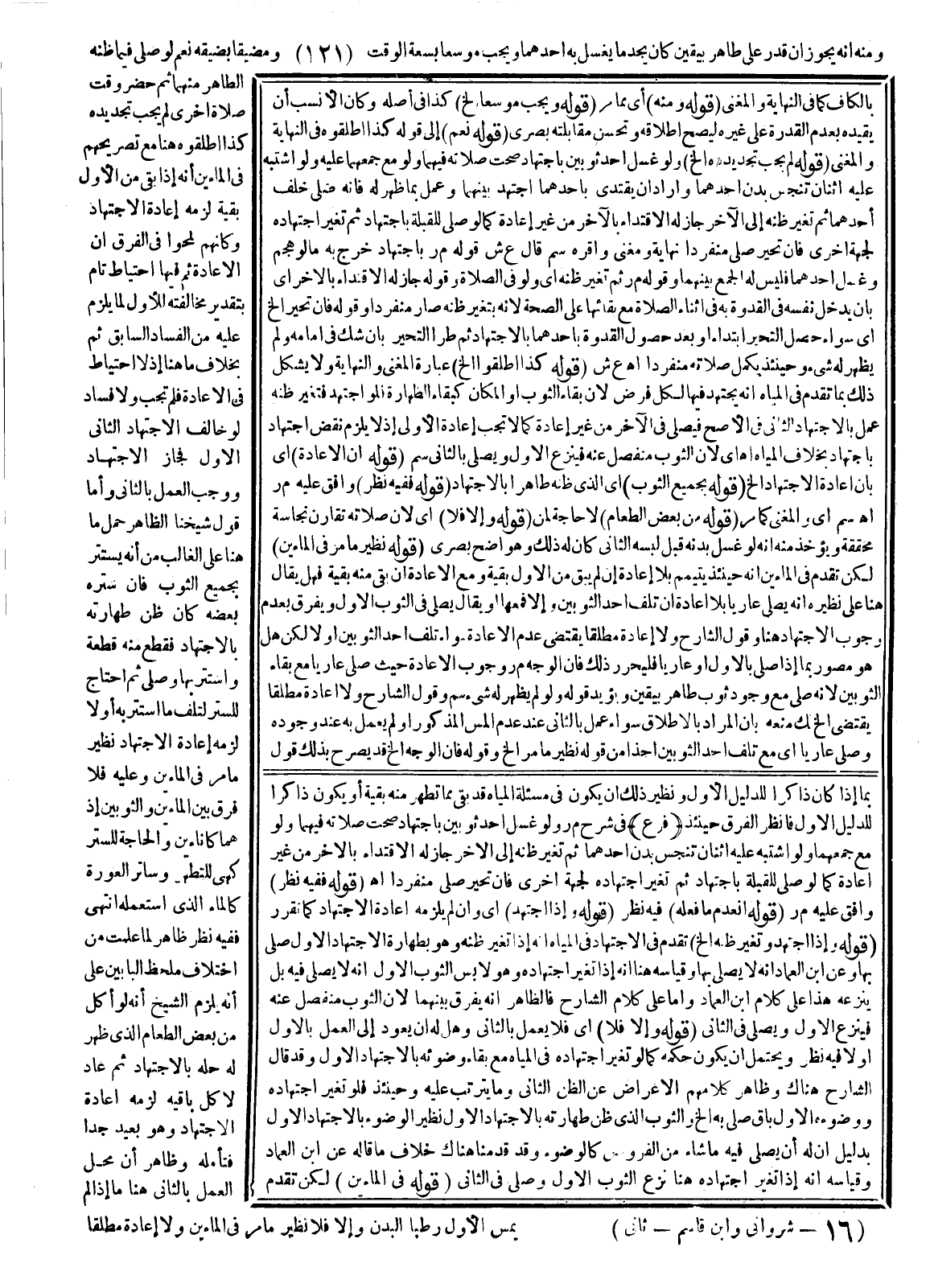 وَمِنْهُ أَنَّهُ يَجُوزُ إنْ قَدَرَ عَلَى الظَّاهِرِ بِيَقِينٍ كَأَنْ يَجِدَ مَا يَغْسِلُ بِهِ أَحَدَهُمَا وَيَجِبُ مُوَسَّعًا بِسَعَةِ الْوَقْتِ وَمُضَيَّقًا بِضِيقِهِ نَعَمْ لَوْ صَلَّى فِيمَا ظَنَّهُ الطَّاهِرَ مِنْهُمَا ثُمَّ حَضَرَ وَقْتُ صَلَاةٍ أُخْرَى لَمْ يَجِبْ تَجْدِيدُهُ كَذَا أَطْلَقُوهُ هُنَا مَعَ تَصْرِيحِهِمْ فِي الْمَاءَيْنِ أَنَّهُ إذَا بَقِيَ مِنْ الْأَوَّلِ بَقِيَّةٌ لَزِمَهُ إعَادَةُ الِاجْتِهَادِ وَكَأَنَّهُمْ لَمَحُوا فِي الْفَرْقِ أَنَّ الْإِعَادَةَ ثَمَّ فِيهَا احْتِيَاطٌ تَامٌّ بِتَقْدِيرِ مُخَالَفَتِهِ لِلْأَوَّلِ لِمَا يَلْزَمُ عَلَيْهِ مِنْ الْفَسَادِ السَّابِقِ ثَمَّ بِخِلَافِ مَا هُنَا إذْ لَا احْتِيَاطَ فِي الْإِعَادَةِ فَلَمْ تَجِبْ وَلَا فَسَادَ لَوْ خَالَفَ الِاجْتِهَادُ الثَّانِي الْأَوَّلَ فَجَازَ الِاجْتِهَادُ وَوَجَبَ الْعَمَلُ بِالثَّانِي.