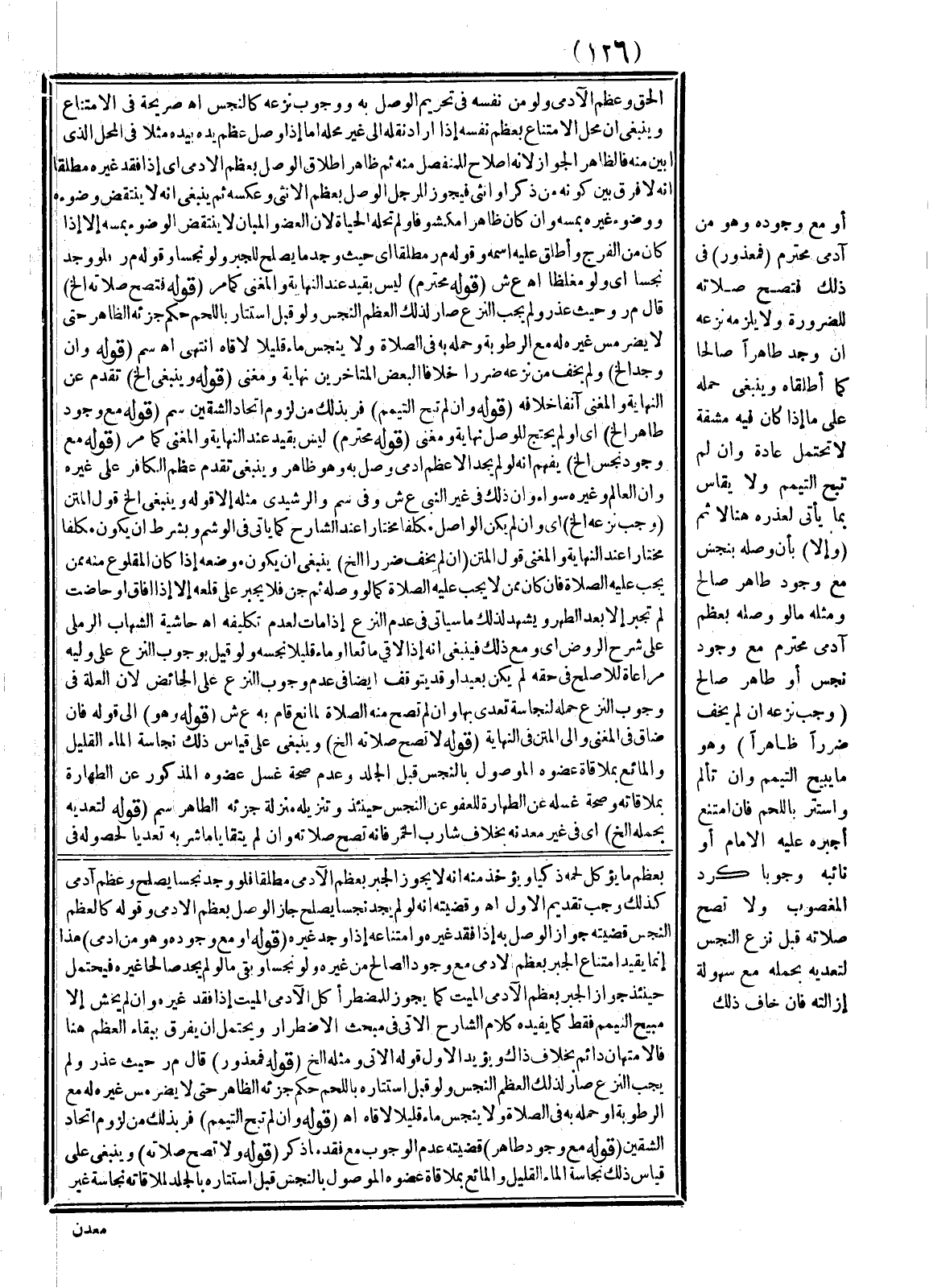 (قَوْلُهُ وَإِنْ لَمْ تُبِحْ التَّيَمُّمَ) فَرَّ بِذَلِكَ مِنْ لُزُومِ اتِّحَادِ الشِّقَّيْنِ (قَوْلُهُ مَعَ وُجُودِ طَاهِرٍ) قَضِيَّتُهُ عَدَمُ الْوُجُوبِ مَعَ فَقْدِ مَا ذَكَرَ (قَوْلُهُ وَلَا تَصِحُّ صَلَاتُهُ) وَيَنْبَغِي عَلَى قِيَاسِ ذَلِكَ نَجَاسَةُ الْمَاءِ الْقَلِيلِ وَالْمَائِعِ بِمُلَاقَاةِ عُضْوِهِ الْمَوْصُولِ بِالنَّجِسِ قَبْلَ اسْتِتَارِهِ بِالْجِلْدِ لِمُلَاقَاتِهِ نَجَاسَةً غَيْرَ