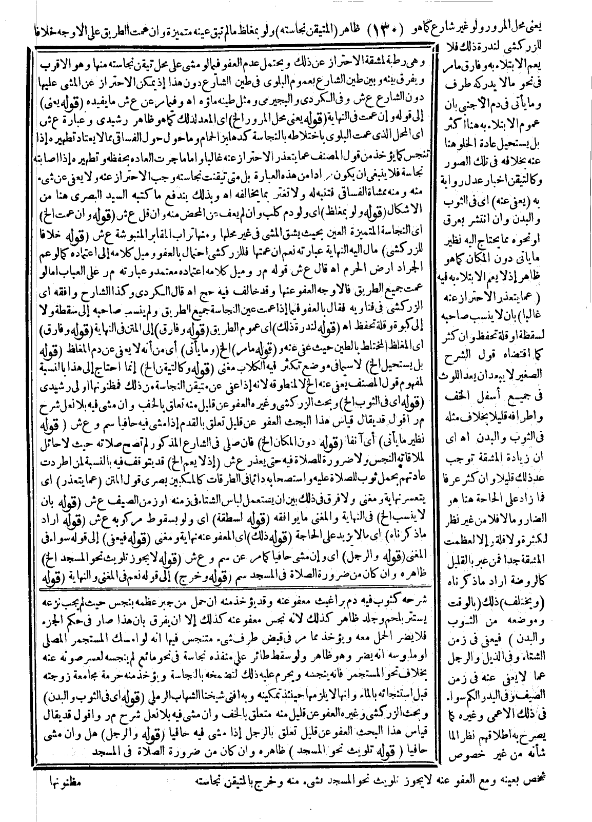 يَعْنِي مَحَلَّ الْمُرُورِ وَلَوْ غَيْرَ شَارِعٍ كَمَا هُوَ ظَاهِرٌ (الْمُتَيَقَّنَ نَجَاسَتُهُ) وَلَوْ بِمُغَلَّظٍ مَا لَمْ تَبْقَ عَيْنُهُ مُتَمَيِّزَةً وَإِنْ عَمَّتْ الطَّرِيقَ عَلَى الْأَوْجَهِ خِلَافًا لِلزَّرْكَشِيِّ لِنُدْرَةِ ذَلِكَ فَلَا يَعُمُّ الِابْتِلَاءُ بِهِ وَفَارَقَ مَا مَرَّ نَحْوُ مَا لَا يُدْرِكُهُ طَرَفٌ وَمَا يَأْتِي فِي دَمِ الْأَجْنَبِيِّ بِأَنَّ عُمُومَ الِابْتِلَاءِ بِهِ هُنَا أَكْثَرُ بَلْ يَسْتَحِيلُ عَادَةً الْخُلُوُّ هُنَا عَنْهُ بِخِلَافِهِ فِي تِلْكَ الصُّوَرِ وَكَالتَّيَقُّنِ إخْبَارُ عَدْلٍ رِوَايَةً بِهِ (يُعْفَى عَنْهُ) أَيْ فِي الثَّوْبِ وَالْبَدَنِ وَإِنْ انْتَشَرَ بِعَرَقٍ أَوْ نَحْوِهِ مِمَّا يَحْتَاجُ إلَيْهِ نَظِيرَ مَا يَأْتِي دُونَ الْمَكَانِ كَمَا هُوَ ظَاهِرٌ إذْ لَا يَعُمُّ الِابْتِلَاءُ بِهِ فِيهِ (عَمَّا يَتَعَذَّرُ الِاحْتِرَازُ عَنْهُ غَالِبًا) بِأَنْ لَا يُنْسَبَ صَاحِبُهُ لِسَقْطَةٍ أَوْ قِلَّةِ تَحَفُّظٍ وَإِنْ كَثُرَ كَمَا اقْتَضَاهُ قَوْلُ الشَّرْحِ الصَّغِيرِ لَا يَبْعُدُ أَنْ يُعَدَّ اللَّوْثُ فِي جَمِيعِ أَسْفَلِ الْخُفِّ وَأَطْرَافِهِ قَلِيلًا بِخِلَافِ مِثْلِهِ فِي الثَّوْبِ وَالْبَدَنِ اهـ. أَيْ أَنَّ زِيَادَةَ الْمَشَقَّةِ تُوجِبُ عَدَّ ذَلِكَ قَلِيلًا وَإِنْ كَثُرَ عُرْفًا فَمَا زَادَ عَلَى الْحَاجَةِ هُنَا هُوَ الضَّارُّ وَمَا لَا فَلَا مِنْ غَيْرِ نَظَرٍ لِكَثْرَةٍ وَلَا قِلَّةٍ وَإِلَّا لَعَظُمَتْ الْمَشَقَّةُ جِدًّا فَمَنْ عَبَّرَ بِالْقَلِيلِ كَالرَّوْضَةِ أَرَادَ مَا ذَكَرْنَاهُ (وَيَخْتَلِفُ) ذَلِكَ (بِالْوَقْتِ وَمَوْضِعِهِ مِنْ الثَّوْبِ وَالْبَدَنِ) فَيُعْفَى فِي زَمَنِ الشِّتَاءِ وَفِي الذَّيْلِ وَالرِّجْلِ عَمَّا لَا يُعْفَى عَنْهُ فِي زَمَنِ الصَّيْفِ وَفِي الْيَدِ وَالْكُمِّ سَوَاءٌ فِي ذَلِكَ الْأَعْمَى وَغَيْرُهُ كَمَا يُصَرِّحُ بِهِ إطْلَاقُهُمْ نَظَرًا لِمَا مِنْ شَأْنِهِ مِنْ غَيْرِ خُصُوصِ شَخْصٍ بِعَيْنِهِ وَمَعَ الْعَفْوِ عَنْهُ لَا يَجُوزُ تَلْوِيثُ نَحْوِ الْمَسْجِدِ بِشَيْءٍ مِنْهُ وَخَرَجَ بِالْمُتَيَقَّنِ نَجَاسَتُهُ