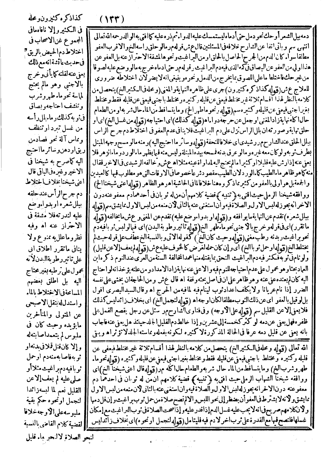 كَذَا ذَكَرَهُ كَثِيرُونَ وَمَحَلُّهُ فِي الْكَثِيرِ وَإِلَّا نَافَاهُ مَا فِي الْمَجْمُوعِ عَنْ الْأَصْحَابِ فِي اخْتِلَاطِ دَمِ الْحَيْضِ بِالرِّيقِ فِي حَدِيثِ عَائِشَةَ أَنَّهُ مَعَ ذَلِكَ يُعْفَى عَنْهُ لِقِلَّتِهِ كَمَا يَأْتِي وَخَرَجَ بِالْأَجْنَبِيِّ، وَهُوَ مَا لَمْ يَحْتَجْ لِمُمَاسَّةِ نَحْوِ مَاءِ طُهْرٍ وَشُرْبٍ وَتَنَشُّفٍ احْتَاجَهُ وَبُصَاقٍ فِي ثَوْبِهِ كَذَلِكَ وَمَاءِ بَلَلِ رَأْسِهِ مِنْ غُسْلِ تَبَرُّدٍ أَوْ تَنَظُّفٍ وَمُمَاسِّ آلَةِ نَحْوِ فِصَادٍ مِنْ رِيقٍ أَوْ دُهْنٍ وَسَائِرِ مَا اُحْتِيجَ إلَيْهِ كَمَا صَرَّحَ بِهِ شَيْخُنَا فِي الْأَخِيرِ وَغَيْرُهُ فِي الْبَاقِي قَالَ أَعْنِي شَيْخَنَا بِخِلَافِ اخْتِلَاطِ دَمِ جُرْحِ الرَّأْسِ عِنْدَ حَلْقِهِ بِبَلَلِ شَعْرِهِ أَوْ بِدَوَاءٍ وُضِعَ عَلَيْهِ لِنُدْرَتِهِ فَلَا مَشَقَّةَ فِي الِاحْتِرَازِ عَنْهُ اهـ. وَفِيهِ نَظَرٌ وَمَا عَلَّلَ بِهِ مَمْنُوعٌ وَلَا يُنَافِي مَا تَقَرَّرَ إطْلَاقَ أَبَى عَلَى تَأْثِيرِ رُطُوبَةِ الْبَدَنِ لِأَنَّهُ مَحْمُولٌ عَلَى تَرَطُّبِهِ بِغَيْرِ مُحْتَاجٍ إلَيْهِ بَلْ أَطْلَقَ بَعْضُهُمْ الْمُسَامَحَةَ فِي الِاخْتِلَاطِ بِالْمَاءِ وَاسْتَدَلَّ لَهُ بِنَقْلِ الْأَصْبَحِيِّ عَنْ الْمُتَوَلِّي وَالْمُتَأَخِّرِينَ مَا يُؤَيِّدُهُ وَحَيْثُ كَانَ فِي مَلْبُوسٍ لَمْ يَتَعَمَّدْ إصَابَتَهُ لَهُ وَإِلَّا كَأَنْ قَتَلَ قَمْلًا فِي بَدَنِهِ أَوْ ثَوْبِهِ فَأَصَابَهُ مِنْهُ دَمٌ أَوْ حَمَلَ ثَوْبًا فِيهِ دَمُ بَرَاغِيثَ مَثَلًا أَوْ صَلَّى عَلَيْهِ لَمْ يُعْفَ إلَّا عَنْ الْقَلِيلِ نَعَمْ لِمَا لَبِسَهُ زَائِدًا لِتَجَمُّلٍ أَوْ نَحْوِهِ حُكْمَ بَقِيَّةِ مَلْبُوسِهِ عَلَى الْأَوْجَهِ خِلَافًا لِقَضِيَّةِ كَلَامِ الْقَاضِي بِالنِّسْبَةِ لِنَحْوِ الصَّلَاةِ لَا لِنَحْوِ مَاءٍ قَلِيلٍ
