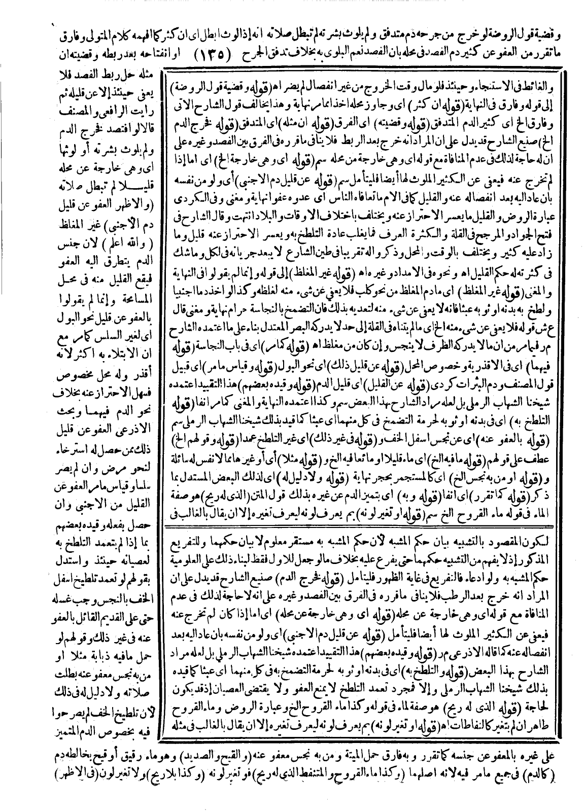 ـــــــــــــــــــــــــــــSلِكَوْنِ الْمَقْصُودِ بِالتَّشْبِيهِ بَيَانَ حُكْمِ الْمُشَبَّهِ؛ لِأَنَّ حُكْمَ الْمُشَبَّهِ بِهِ مُسْتَقِرٌّ مَعْلُومٌ لَا بَيَانَ حُكْمِهِمَا وَلِلتَّفْرِيعِ الْمَذْكُورِ إذْ لَا يُفْهَمُ مِنْ التَّشْبِيهِ حُكْمُهُمَا حَتَّى يُفَرَّعَ عَلَيْهِ بِخِلَافِ مَا لَوْ جُعِلَ لِلْأَوَّلِ فَقَطْ لِبِنَاءِ ذَلِكَ عَلَى مَعْلُومِيَّةِ حُكْمِ الْمُشَبَّهِ بِهِ وَلَوْ ادِّعَاءً فَالتَّفْرِيعُ فِي غَايَةِ الظُّهُورِ فَلْيُتَأَمَّلْ (قَوْلُهُ فَخَرَجَ الدَّمُ) صَنِيعُ الشَّارِحِ قَدْ يَدُلُّ عَلَى أَنَّ الْمُرَادَ أَنَّهُ خَرَجَ بَعْدَ الرَّطْبِ فَلَا يُنَافِي مَا قَرَّرَهُ فِي الْفَرْقِ بَيْنَ الْفَصْدِ وَغَيْرِهِ عَلَى أَنَّهُ لَا حَاجَةَ لِذَلِكَ فِي عَدَمِ الْمُنَافَاةِ مَعَ قَوْلِهِ أَيْ وَهِيَ خَارِجَةٌ عَنْ مَحَلِّهِ (قَوْلُهُ أَيْ وَهِيَ خَارِجَةٌ عَنْ مَحَلِّهِ) أَيْ أَمَّا إذَا كَانَ لَمْ تَخْرُجْ عَنْهُ فَيُعْفَى عَنْ الْكَثِيرِ الْمُلَوِّثِ لَهَا أَيْضًا فَلْيُتَأَمَّلْ (قَوْلُهُ عَنْ قَلِيلِ دَمِ الْأَجْنَبِيِّ) أَيْ وَلَوْ مِنْ نَفْسِهِ بِأَنْ عَادَ إلَيْهِ بَعْدَ انْفِصَالِهِ عَنْهُ كَمَا قَالَهُ الْأَذْرَعِيُّ م ر (قَوْلُهُ وَقَيَّدَهُ بَعْضُهُمْ) هَذَا التَّقْيِيدُ اعْتَمَدَهُ شَيْخُنَا الشِّهَابُ الرَّمْلِيُّ بَلْ لَعَلَّهُ مُرَادُ الشَّارِحِ بِهَذَا الْبَعْضِ (قَوْلُهُ وَالتَّلَطُّخَ بِهِ) أَيْ فِي بَدَنِهِ أَوْ ثَوْبِهِ لِحُرْمَةِ التَّضَمُّخِ بِهِ فِي كُلٍّ مِنْهُمَا أَيْ عَبَثًا كَمَا قَيَّدَهُ بِذَلِكَ شَيْخُنَا الشِّهَابُ الرَّمْلِيُّ وَإِلَّا فَمُجَرَّدُ تَعَمُّدِ التَّلَطُّخِ لَا يَمْنَعُ الْعَفْوَ وَلَا يَقْتَضِي الْعِصْيَانَ إذْ قَدْ يَكُونُ لِحَاجَةٍ (قَوْلُهُ الَّذِي لَهُ رِيحٌ) هُوَ صِفَةُ الْمَاءِ فِي قَوْلِهِ وَكَذَا مَاءُ الْقُرُوحِ إلَخْ وَعِبَارَةُ الرَّوْضِ وَمَاءُ الْقُرُوحِ طَاهِرٌ إنْ لَمْ يَتَغَيَّرْ كَالنَّفَّاطَاتِ اهـ.