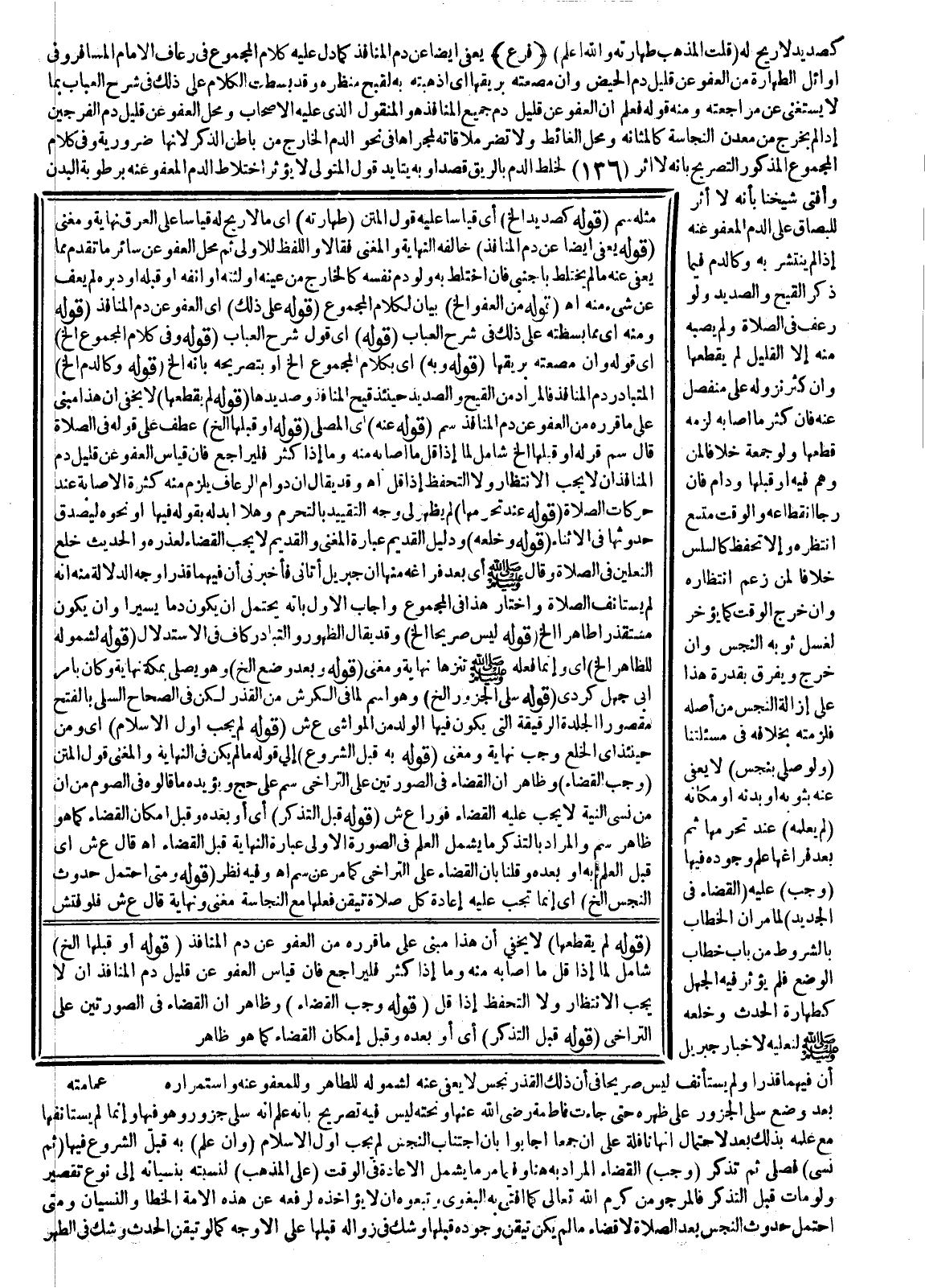 فَرْعٌ يُعْفَى أَيْضًا عَنْ دَمِ الْمَنَافِذِ كَمَا دَلَّ عَلَيْهِ كَلَامُ الْمَجْمُوعِ فِي رُعَافِ الْإِمَامِ الْمُسَافِرِ وَفِي أَوَائِلِ الطَّهَارَةِ مِنْ الْعَفْوِ عَنْ قَلِيلِ دَمِ الْحَيْضِ وَإِنْ مَصَعَتْهُ بِرِيقِهَا أَيْ أَذْهَبَتْهُ بِهِ لِقُبْحِ مَنْظَرِهِ وَقَدْ بَسَطْت الْكَلَامَ عَلَى ذَلِكَ فِي شَرْحِ الْعُبَابِ بِمَا لَا يُسْتَغْنَى عَنْ مُرَاجَعَتِهِ وَمِنْهُ قَوْلُهُ فَعُلِمَ أَنَّ الْعَفْوَ عَنْ قَلِيلِ دَمِ جَمِيعِ الْمَنَافِذِ هُوَ الْمَنْقُولُ الَّذِي عَلَيْهِ الْأَصْحَابُ وَمَحَلُّ الْعَفْوِ عَنْ قَلِيلِ دَمِ الْفَرْجَيْنِ إذَا لَمْ يَخْرُجْ مِنْ مَعْدِنِ النَّجَاسَةِ كَالْمَثَانَةِ وَمَحَلِّ الْغَائِطِ وَلَا تَضُرُّ مُلَاقَاتُهُ لِمَجْرَاهَا فِي نَحْوِ الدَّمِ الْخَارِجِ مِنْ بَاطِنِ الذَّكَرِ لِأَنَّهَا ضَرُورِيَّةٌ وَفِي كَلَامِ الْمَجْمُوعِ الْمَذْكُورِ التَّصْرِيحُ بِأَنَّهُ لَا أَثَرَ لِخَلْطِ الدَّمِ بِالرِّيقِ قَصْدًا وَبِهِ يَتَأَيَّدُ قَوْلُ الْمُتَوَلِّي لَا يُؤَثِّرُ اخْتِلَاطُ الدَّمِ الْمَعْفُوِّ عَنْهُ بِرُطُوبَةِ الْبَدَنِ وَأَفْتَى شَيْخُنَا بِأَنَّهُ لَا أَثَرَ لِلْبُصَاقِ عَلَى الدَّمِ الْمَعْفُوِّ عَنْهُ إذَا لَمْ يَنْتَشِرْ بِهِ وَكَالدَّمِ فِيمَا ذَكَرَ الْقَيْحُ وَالصَّدِيدُ وَلَوْ رَعَفَ فِي الصَّلَاةِ وَلَمْ يُصِبْهُ مِنْهُ إلَّا الْقَلِيلُ لَمْ يَقْطَعْهَا وَإِنْ كَثُرَ نُزُولُهُ عَلَى مُنْفَصِلٍ عَنْهُ فَإِنْ كَثُرَ مَا أَصَابَهُ لَزِمَهُ قَطْعُهَا وَلَوْ جُمُعَةً خِلَافًا لِمَنْ وَهَمَ فِيهِ أَوْ قَبْلَهَا وَدَامَ فَإِنْ رَجَا انْقِطَاعَهُ وَالْوَقْتُ مُتَّسِعٌ انْتَظَرَهُ وَإِلَّا تَحَفَّظَ كَالسَّلَسِ خِلَافًا لِمَنْ زَعَمَ انْتِظَارَهُ وَإِنْ خَرَجَ الْوَقْتُ كَمَا يُؤَخِّرُ لِغَسْلِ ثَوْبِهِ النَّجَسِ وَإِنْ خَرَجَ وَيُفَرَّقُ بِقُدْرَةِ هَذَا عَلَى إزَالَةِ النَّجَسِ مِنْ أَصْلِهِ فَلَزِمَتْهُ بِخِلَافِهِ فِي مَسْأَلَتِنَا.