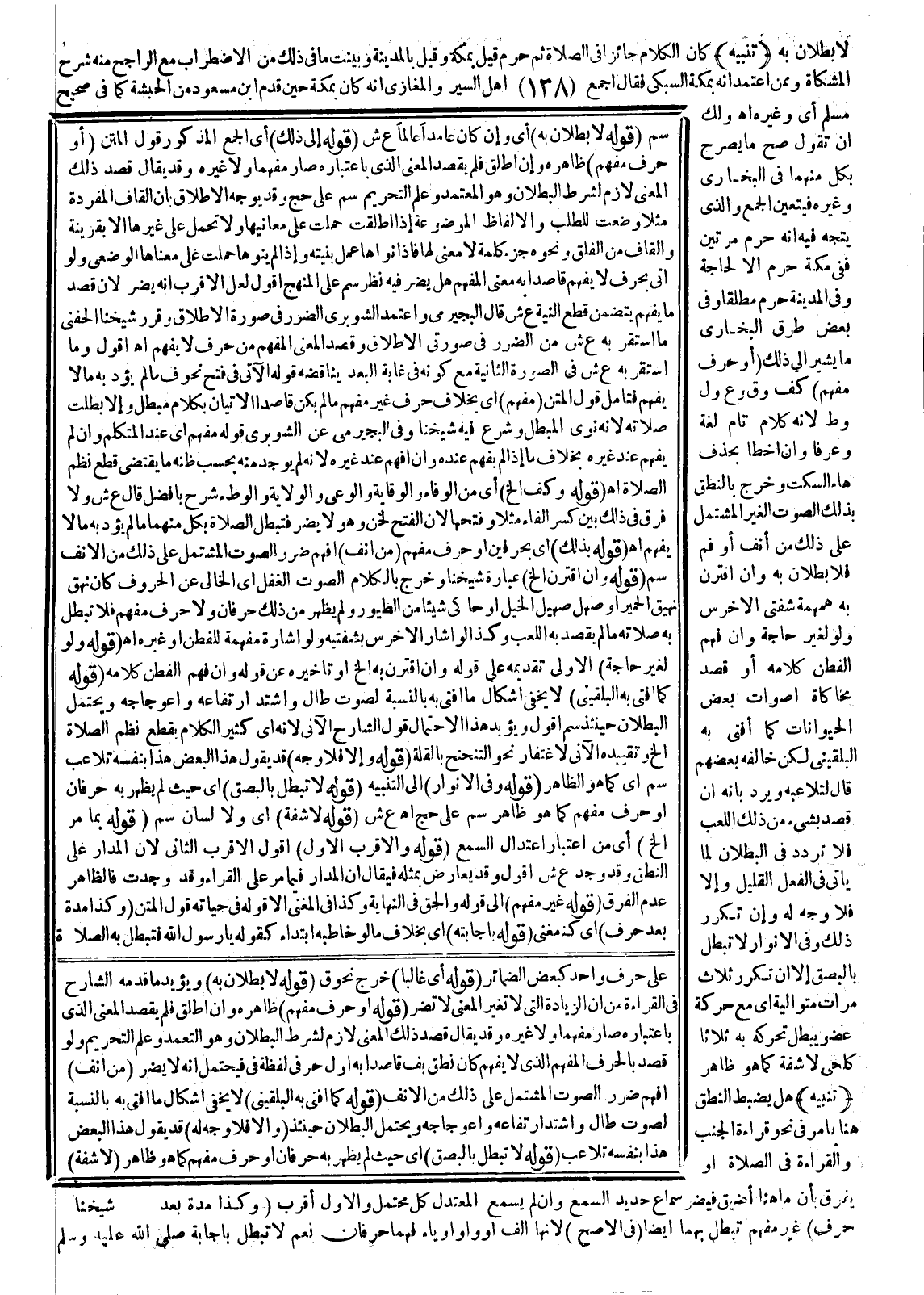 (تَنْبِيهٌ) كَانَ الْكَلَامُ جَائِزًا فِي الصَّلَاةِ ثُمَّ حَرُمَ قِيلَ بِمَكَّةَ وَقِيلَ بِالْمَدِينَةِ وَبَيَّنْت مَا فِي ذَلِكَ مِنْ الِاضْطِرَابِ مَعَ الرَّاجِحِ مِنْهُ فِي شَرْحِ الْمِشْكَاةِ وَمِمَّنْ اعْتَمَدَ أَنَّهُ بِمَكَّةَ السُّبْكِيُّ فَقَالَ أَجْمَعَ أَهْلُ السِّيَرِ وَالْمَغَازِي أَنَّهُ كَانَ بِمَكَّةَ حِينَ قَدِمَ ابْنُ مَسْعُودٍ مِنْ الْحَبَشَةِ كَمَا فِي صَحِيحِ مُسْلِمٍ أَيْ وَغَيْرِهِ اهـ وَلَك أَنْ تَقُولَ صَحَّ مَا يُصَرِّحُ بِكُلٍّ مِنْهُمَا فِي الْبُخَارِيِّ وَغَيْرِهِ فَيَتَعَيَّنُ الْجَمْعُ وَاَلَّذِي يَتَّجِهُ فِيهِ أَنَّهُ حَرُمَ مَرَّتَيْنِ فَفِي مَكَّةَ حَرُمَ إلَّا لِحَاجَةٍ وَفِي الْمَدِينَةِ حَرُمَ مُطْلَقًا وَفِي بَعْضِ طُرُقِ الْبُخَارِيِّ مَا يُشِيرُ إلَى ذَلِكَ (أَوْ حَرْفٍ مُفْهِمٍ) ك ف وق وع ول وط لِأَنَّهُ كَلَامٌ تَامٌّ لُغَةً وَعُرْفًا وَإِنْ أَخْطَأَ بِحَذْفِ هَاءِ السَّكْتِ وَخَرَجَ بِالنُّطْقِ بِذَلِكَ الصَّوْتُ الْغَيْرُ الْمُشْتَمِلِ عَلَى ذَلِكَ مِنْ أَنْفٍ أَوْ فَمٍ فَلَا بُطْلَانَ بِهِ وَإِنْ اقْتَرَنَ بِهِ هَمْهَمَةُ شَفَتَيْ الْأَخْرَسِ وَلَوْ لِغَيْرِ حَاجَةٍ وَإِنْ فَهِمَ الْفَطِنُ كَلَامَهُ أَوْ قَصَدَ مُحَاكَاةَ أَصْوَاتِ بَعْضِ الْحَيَوَانَاتِ كَمَا أَفْتَى بِهِ الْبُلْقِينِيُّ لَكِنْ خَالَفَهُ بَعْضُهُمْ قَالَ لِتَلَاعُبِهِ وَيَرُدُّ بِأَنَّهُ إنْ قَصَدَ بِشَيْءٍ مِنْ ذَلِكَ اللَّعِبَ فَلَا تَرَدُّدَ فِي الْبُطْلَانِ لِمَا يَأْتِي فِي الْفِعْلِ الْقَلِيلِ وَإِلَّا فَلَا وَجْهَ لَهُ وَإِنْ تَكَرَّرَ ذَلِكَ وَفِي الْأَنْوَارِ لَا تَبْطُلُ بِالْبَصْقِ إلَّا إنْ تَكَرَّرَ ثَلَاثَ مَرَّاتٍ مُتَوَالِيَةً أَيْ مَعَ حَرَكَةِ عُضْوٍ يُبْطِلُ تَحَرُّكُهُ بِهِ ثَلَاثًا كَلِحًى لَا شَفَةٍ كَمَا هُوَ ظَاهِرٌ