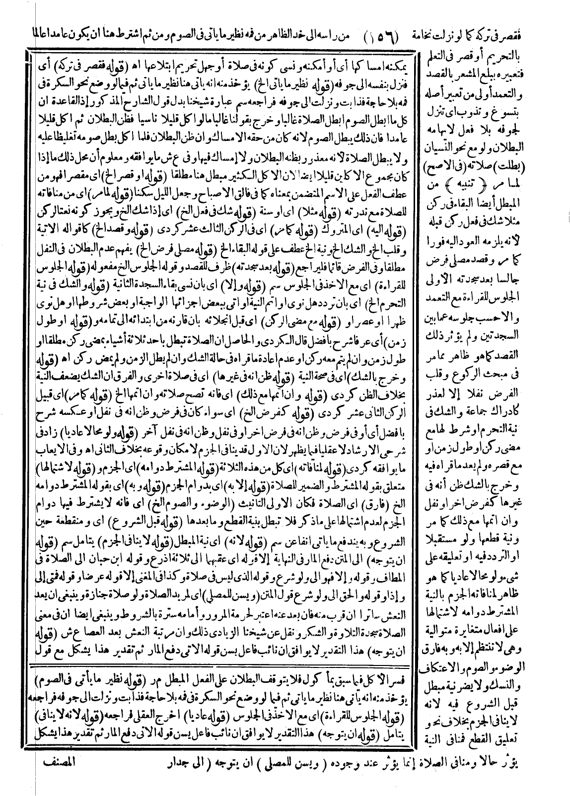 (تَنْبِيهٌ) مِنْ الْمُبْطِلِ أَيْضًا الْبَقَاءُ فِي رُكْنٍ مَثَلًا شَكَّ فِي فِعْلِ رُكْنٍ قَبْلَهُ لِأَنَّهُ يَلْزَمُهُ الْعَوْدُ إلَيْهِ فَوْرًا كَمَا مَرَّ وَقَصْدُ مُصَلِّي فَرْضٍ جَالِسًا بَعْدَ سَجْدَتِهِ الْأُولَى الْجُلُوسَ لِلْقِرَاءَةِ مَعَ التَّعَمُّدِ وَإِلَّا حُسِبَ جُلُوسُهُ عَمَّا بَيْنَ السَّجْدَتَيْنِ وَلَمْ يُؤَثِّرْ ذَلِكَ الْقَصْدُ كَمَا هُوَ ظَاهِرٌ مِمَّا مَرَّ فِي مَبْحَثِ الرُّكُوعِ وَقَلْبُ الْفَرْضِ نَفْلًا إلَّا لِعُذْرٍ كَإِدْرَاكِ جَمَاعَةٍ وَالشَّكُّ فِي نِيَّةِ التَّحَرُّمِ أَوْ شَرْطٌ لَهَا مَعَ مُضِيِّ رُكْنٍ أَوْ طُولُ زَمَنٍ أَوْ مَعَ قِصَرِهِ وَلَمْ يَعُدَّ مَا قَرَأَهُ فِيهِ وَخَرَجَ بِالشَّكِّ ظَنُّ أَنَّهُ فِي غَيْرِهَا كَفَرْضٍ آخَرَ أَوْ نَفْلٍ وَإِنْ أَتَمَّهَا مَعَ ذَلِكَ كَمَا مَرَّ وَنِيَّةُ قَطْعِهَا، وَلَوْ مُسْتَقْبَلًا أَوْ التَّرَدُّدُ فِيهِ أَوْ تَعْلِيقُهُ عَلَى شَيْءٍ وَلَوْ مُحَالًا عَادِيًا كَمَا هُوَ ظَاهِرٌ لِمُنَافَاتِهِ الْجَزْمَ بِالنِّيَّةِ الْمُشْتَرَطِ دَوَامُهُ لِاشْتِمَالِهَا عَلَى أَفْعَالٍ مُتَغَايِرَةٍ مُتَوَالِيَةٍ وَهِيَ لَا تَنْتَظِمُ إلَّا بِهِ وَبِهِ فَارَقَ الْوُضُوءَ وَالصَّوْمَ وَالِاعْتِكَافَ وَالنُّسُكَ وَلَا يَضُرُّ نِيَّةُ مُبْطِلٍ قَبْلَ الشُّرُوعِ فِيهِ لِأَنَّهُ لَا يُنَافِي الْجَزْمَ بِخِلَافِ نَحْوِ تَعْلِيقِ الْقَطْعِ فَمُنَافِي النِّيَّةِ مُؤَثِّرٌ حَالًا وَمُنَافِي الصَّلَاةِ إنَّمَا يُؤَثِّرُ عِنْدَ وُجُودِهِ.