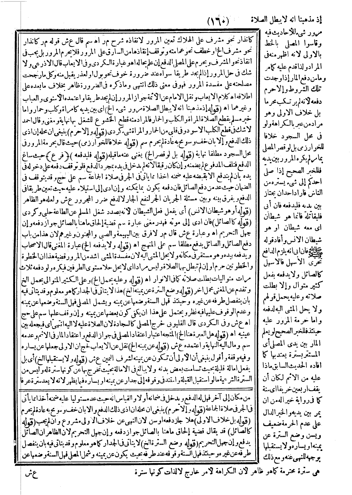 ـــــــــــــــــــــــــــــQكَإِنْذَارِ نَحْوِ مُشْرِفٍ عَلَى الْهَلَاكِ تَعَيَّنَ الْمُرُورُ لِإِنْقَاذِهِ شَرْحُ م ر اهـ سم قَالَ ع ش قَوْلُهُ م ر كَإِنْذَارِ نَحْوِ مُشْرِفٍ إلَخْ أَوْ خَطْفِ نَحْوِ عِمَامَتِهِ وَتَوَقَّفَ إنْقَاذُهَا مِنْ السَّارِقِ عَلَى الْمُرُورِ فَلَا يَحْرُمُ الْمُرُورُ بَلْ يَجِبُ فِي إنْقَاذِ نَحْوِ الْمُشْرِفِ وَيَحْرُمُ عَلَى الْمُصَلِّي الدَّفْعُ إنْ عَلِمَ بِحَالِهِ اهـ.
