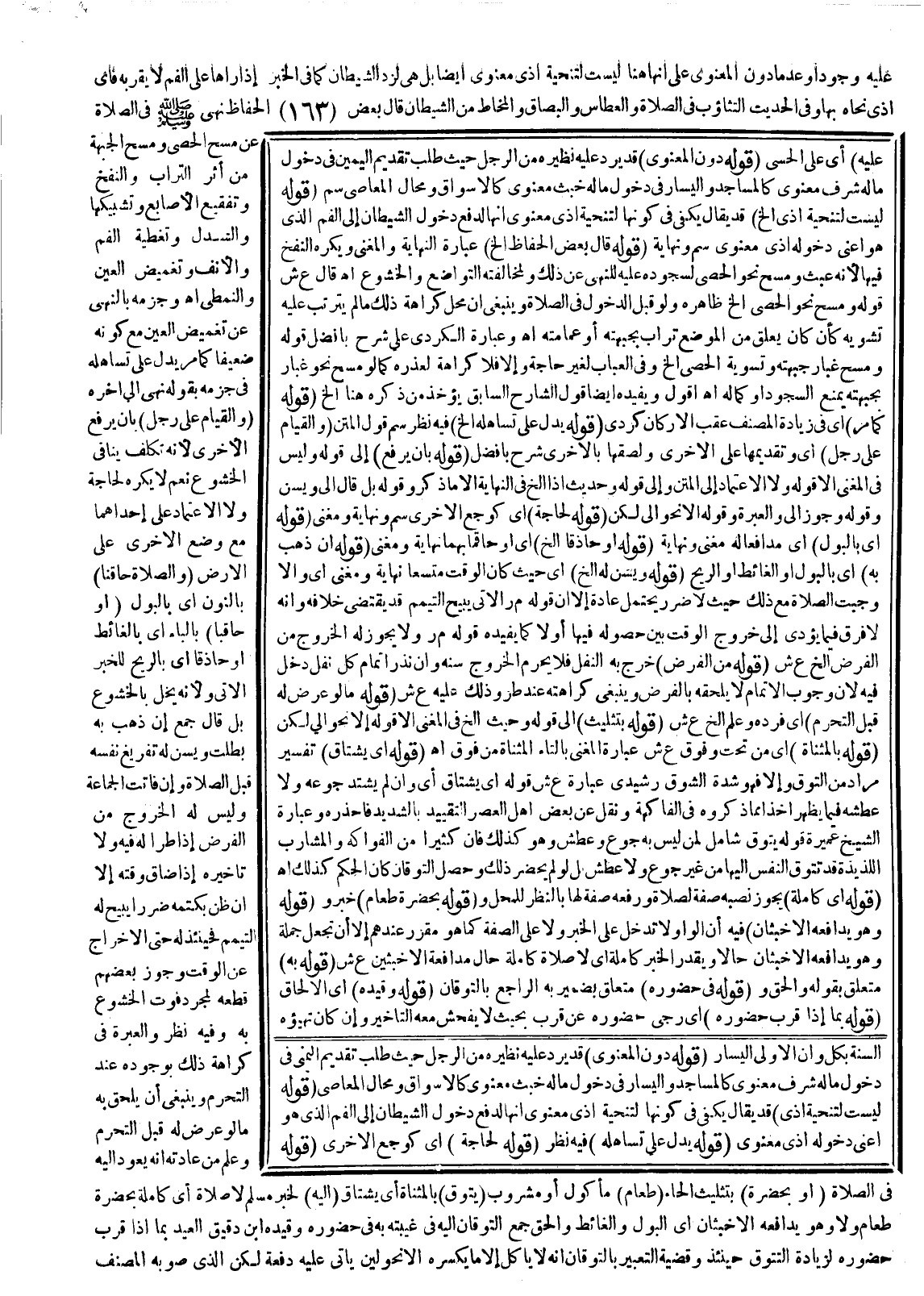 عَلَيْهِ وُجُودًا وَعَدَمًا دُونَ الْمَعْنَوِيِّ عَلَى أَنَّهَا هُنَا لَيْسَتْ لِتَنْحِيَةِ أَذًى مَعْنَوِيٍّ أَيْضًا بَلْ هِيَ لِرَدِّ الشَّيْطَانِ كَمَا فِي الْخَبَرِ إذَا رَآهَا عَلَى الْفَمِ لَا يَقْرَبُهُ فَأَيُّ أَذًى نَحَّاهُ بِهَا وَفِي الْحَدِيثِ «التَّثَاؤُبُ فِي الصَّلَاةِ وَالْعُطَاسُ وَالْبُصَاقُ وَالْمُخَاطُ مِنْ الشَّيْطَانِ» قَالَ بَعْضُ الْحُفَّاظِ «نَهَى - صَلَّى اللَّهُ عَلَيْهِ وَسَلَّمَ - فِي الصَّلَاةِ عَنْ مَسْحِ الْحَصَى وَمَسْحِ الْجَبْهَةِ مِنْ أَثَرِ التُّرَابِ وَالنَّفْخِ وَتَفْقِيعِ الْأَصَابِعِ وَتَشْبِيكِهَا وَالسَّدْلِ وَتَغْطِيَةِ الْفَمِ وَالْأُذُنِ وَتَغْمِيضِ الْعَيْنِ وَالتَّمَطِّي» اهـ. وَجَزْمُهُ بِالنَّهْيِ عَنْ تَغْمِيضِ الْعَيْنِ مَعَ كَوْنِهِ ضَعِيفًا كَمَا مَرَّ يَدُلُّ عَلَى تَسَاهُلِهِ فِي جَزْمِهِ بِقَوْلِهِ نَهَى إلَى آخِرِهِ (وَالْقِيَامُ عَلَى رِجْلٍ) بِأَنْ يَرْفَعَ الْأُخْرَى لِأَنَّهُ تَكَلُّفٌ يُنَافِي الْخُشُوعَ نَعَمْ لَا يُكْرَهُ لِحَاجَةٍ وَلَا الِاعْتِمَادُ عَلَى إحْدَاهُمَا مَعَ وَضْعِ الْأُخْرَى عَلَى الْأَرْضِ.