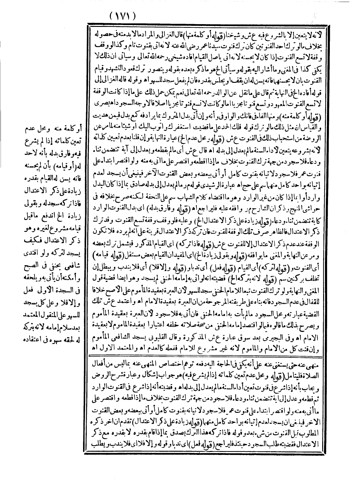 ـــــــــــــــــــــــــــــQلِأَنَّهُ لَا يَتَعَيَّنُ إلَّا بِالشُّرُوعِ فِيهِ ع ش وَشَيْخُنَا (قَوْلُهُ أَوْ كَلِمَةً مِنْهَا) قَالَهُ الْغَزَالِيُّ وَالْمُرَادُ مَا لَا بُدَّ مِنْهُ فِي حُصُولِهِ بِخِلَافِ مَا لَوْ تَرَكَ أَحَدَ الْقَنُوتَيْنِ كَأَنْ تَرَكَ قُنُوتَ سَيِّدِنَا عُمَرَ - رَضِيَ اللَّهُ تَعَالَى عَنْهُ -؛ لِأَنَّهُ أَتَى بِقُنُوتٍ تَامٍّ وَكَذَا لَوْ وَقَفَ وَقْفَةً لَا تَسَعُ الْقُنُوتَ إذَا كَانَ لَا يُحْسِنُهُ؛ لِأَنَّهُ أَتَى بِأَصْلِ الْقِيَامِ أَفَادَهُ شَيْخِي - رَحِمَهُ اللَّهُ تَعَالَى - وَسَيَأْتِي أَنَّ ذَلِكَ لَا يَكْفِي كَذَا فِي الْمُغْنِي وَمَا أَشَارَ إلَيْهِ بِقَوْلِهِ وَسَيَأْتِي إلَخْ هُوَ مَا ذَكَرَهُ بَعْدَهُ بِقَوْلِهِ وَيُتَصَوَّرُ تَرْكُ قُعُودِ التَّشَهُّدِ وَقِيَامِ الْقُنُوتِ بِأَنْ لَا يُحْسِنَهُمَا فَإِنَّهُ يُسَنُّ لَهُ أَنْ يَقِفَ أَوْ يَجْلِسَ بِقَدْرِهِ فَإِنْ لَمْ يَفْعَلْ سَجَدَ لِلسَّهْوِ انْتَهَى.