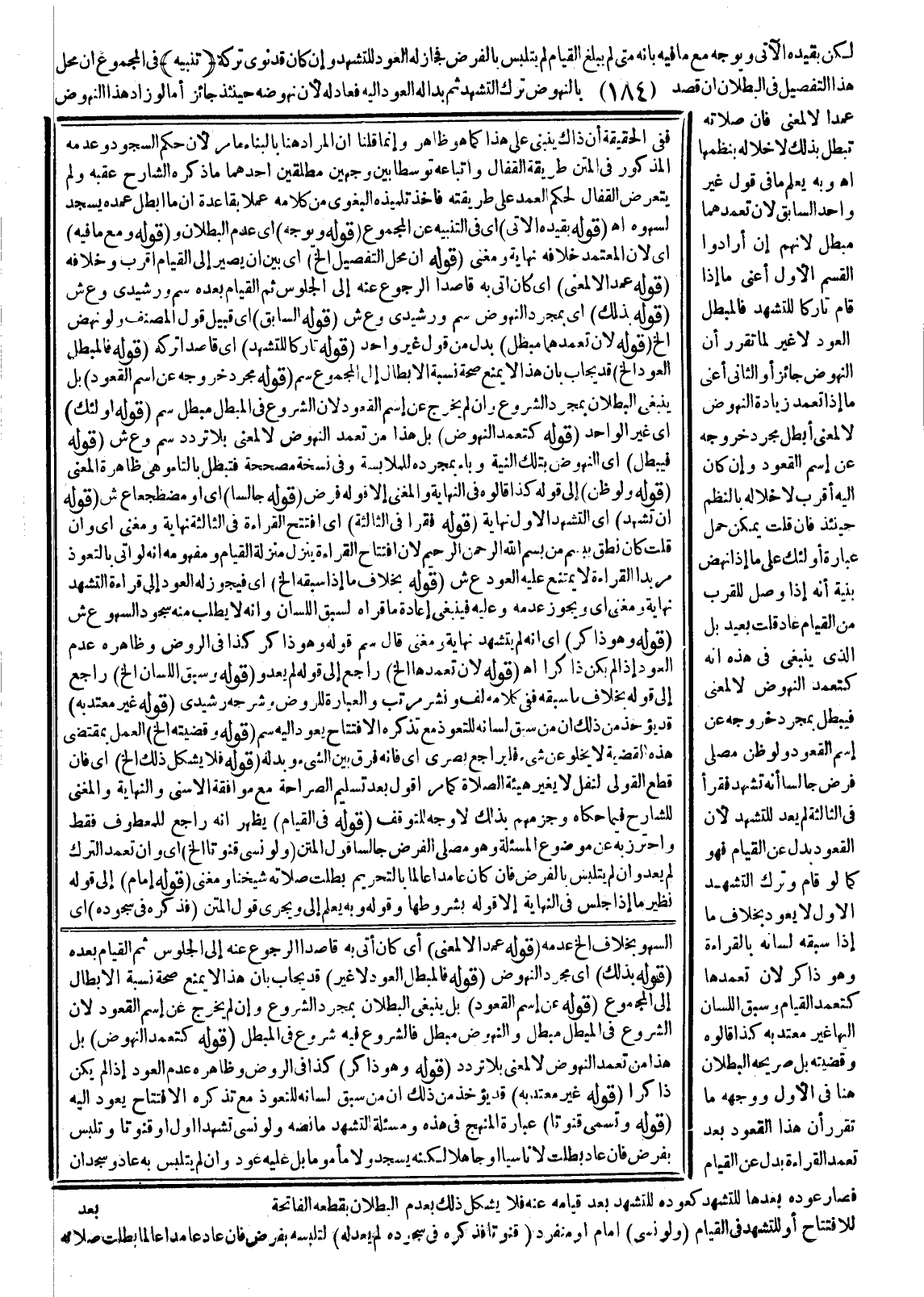 لَكِنْ بِقَيْدِهِ الْآتِي وَيُوَجَّهُ مَعَ مَا فِيهِ بِأَنَّهُ مَتَى لَمْ يَبْلُغْ الْقِيَامَ لَمْ يَتَلَبَّسْ بِالْفَرْضِ فَجَازَ لَهُ الْعَوْدُ لِلتَّشَهُّدِ، وَإِنْ كَانَ قَدْ نَوَى تَرْكَهُ (تَنْبِيهٌ) فِي الْمَجْمُوعِ أَنَّ مَحَلَّ هَذَا التَّفْصِيلِ فِي الْبُطْلَانِ إنْ قَصَدَ بِالنُّهُوضِ تَرْكَ التَّشَهُّدِ ثُمَّ بَدَا لَهُ الْعَوْدُ إلَيْهِ فَعَادَ لَهُ؛ لِأَنَّ نُهُوضَهُ حِينَئِذٍ جَائِزٌ أَمَّا لَوْ زَادَ هَذَا النُّهُوضَ عَمْدًا لَا لِمَعْنًى فَإِنَّ صَلَاتَهُ تَبْطُلُ بِذَلِكَ لِإِخْلَالِهِ بِنَظْمِهَا اهـ وَبِهِ يُعْلَمُ مَا فِي قَوْلِ غَيْرِ وَاحِدٍ السَّابِقِ؛ لِأَنَّ تَعَمُّدَهُمَا مُبْطِلٌ؛ لِأَنَّهُمْ إنْ أَرَادُوا الْقِسْمَ الْأَوَّلَ أَعْنِي مَا إذَا قَامَ تَارِكًا لِلتَّشَهُّدِ فَالْمُبْطِلُ الْعَوْدُ لَا غَيْرُ لِمَا تَقَرَّرَ أَنَّ النُّهُوضَ جَائِزٌ أَوْ الثَّانِي أَعْنِي مَا إذَا تَعَمَّدَ زِيَادَةَ النُّهُوضِ لَا لِمَعْنًى أَبْطَلَ مُجَرَّدُ خُرُوجِهِ عَنْ اسْمِ الْقُعُودِ، وَإِنْ كَانَ إلَيْهِ أَقْرَبَ لِإِخْلَالِهِ بِالنَّظْمِ حِينَئِذٍ فَإِنْ قُلْتَ يُمْكِنُ حَمْلُ عِبَارَةِ أُولَئِكَ عَلَى مَا إذَا نَهَضَ بِنِيَّةِ أَنَّهُ إذَا وَصَلَ لِلْقُرْبِ مِنْ الْقِيَامِ عَادَ قُلْتُ بَعِيدٌ بَلْ الَّذِي يَنْبَغِي فِي هَذِهِ أَنَّهُ كَتَعَمُّدِ النُّهُوضِ لَا لِمَعْنًى فَيُبْطِلُ بِمُجَرَّدِ خُرُوجِهِ عَنْ اسْمِ الْقُعُودِ، وَلَوْ ظَنَّ مُصَلِّي فَرْضٍ جَالِسًا أَنَّهُ تَشَهَّدَ فَقَرَأَ فِي الثَّالِثَةِ لَمْ يَعُدْ لِلتَّشَهُّدِ؛ لِأَنَّ الْقُعُودَ بَدَلٌ عَنْ الْقِيَامِ فَهُوَ كَمَا لَوْ قَامَ وَتَرَكَ التَّشَهُّدَ الْأَوَّلَ لَا يَعُودُ بِخِلَافِ مَا إذَا سَبَقَهُ لِسَانُهُ بِالْقِرَاءَةِ وَهُوَ ذَاكِرٌ لِأَنَّ تَعَمُّدَهَا كَتَعَمُّدِ الْقِيَامِ وَسَبْقُ اللِّسَانِ إلَيْهَا غَيْرُ مُعْتَدٍّ بِهِ كَذَا قَالُوهُ.