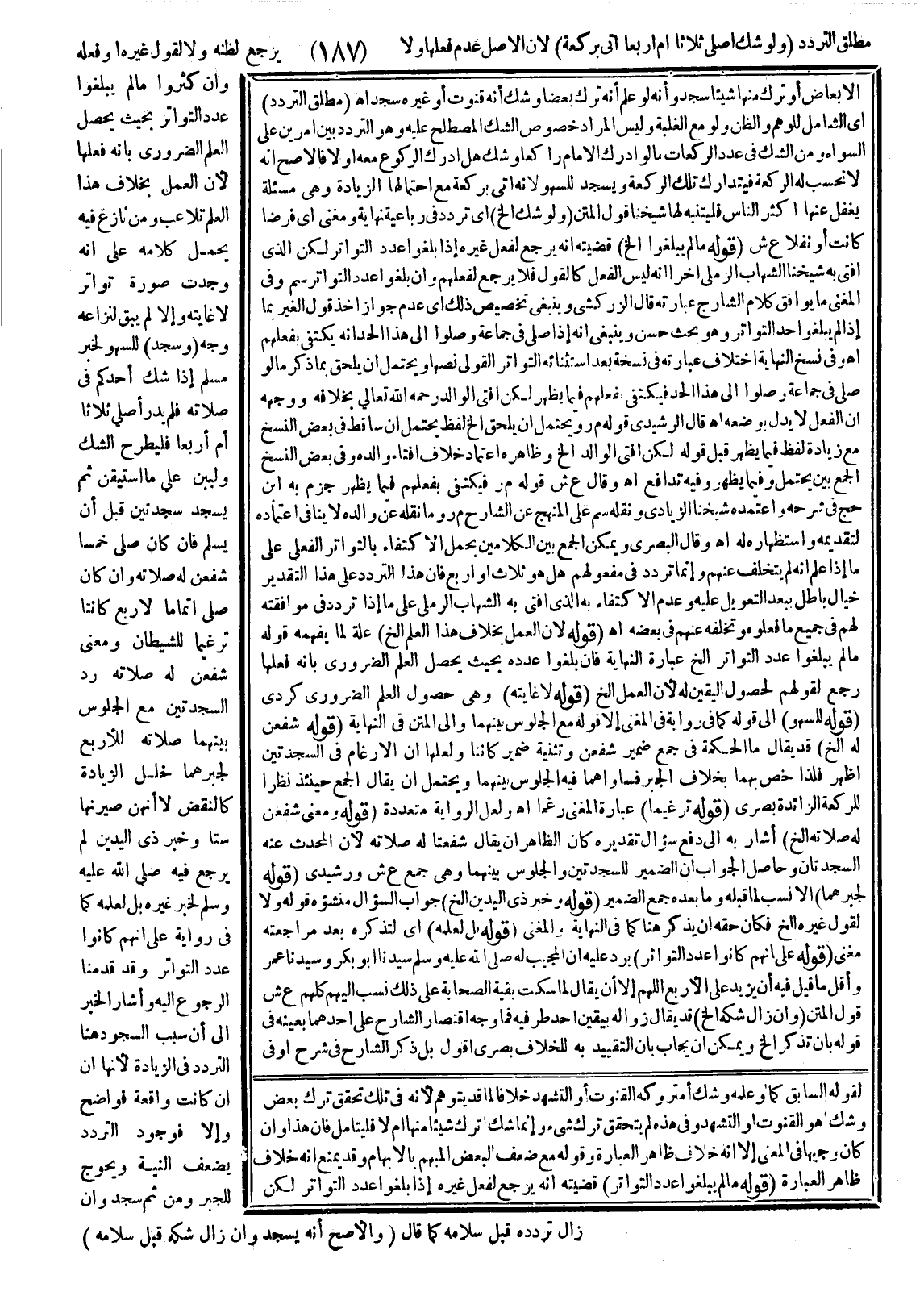 وَفِي نُسَخِ النِّهَايَةِ اخْتِلَافُ عِبَارَتِهِ فِي نُسْخَةٍ بَعْدَ اسْتِثْنَائِهِ التَّوَاتُرَ الْقَوْلِيَّ نَصُّهَا وَيُحْتَمَلُ أَنْ يَلْحَقَ بِمَا ذُكِرَ مَا لَوْ صَلَّى فِي جَمَاعَةٍ وَصَلَّوْا إلَى هَذَا الْحَدِّ فَيُكْتَفَى بِفِعْلِهِمْ فِيمَا يَظْهَرُ لَكِنْ أَفْتَى الْوَالِدُ - رَحِمَهُ اللَّهُ تَعَالَى - بِخِلَافِهِ وَوَجْهُهُ أَنَّ الْفِعْلَ لَا يَدُلُّ بِوَضْعِهِ اهـ قَالَ الرَّشِيدِيُّ قَوْلُهُ م ر وَيُحْتَمَلُ أَنْ يَلْحَقَ إلَخْ لَفْظُ يُحْتَمَلُ أَنْ سَاقِطٌ فِي بَعْضِ النُّسَخِ مَعَ زِيَادَةِ لَفْظٍ فِيمَا يَظْهَرُ قَبْلَ قَوْلِهِ لَكِنْ أَفْتَى الْوَالِدُ إلَخْ وَظَاهِرُهُ اعْتِمَادُ خِلَافِ إفْتَاءِ وَالِدِهِ وَفِي بَعْضِ النُّسَخِ الْجَمْعُ بَيْنَ يُحْتَمَلُ وَفِيمَا يَظْهَرُ وَفِيهِ تَدَافُعٌ اهـ وَقَالَ ع ش قَوْلُهُ م ر فَيُكْتَفَى بِفِعْلِهِمْ فِيمَا يَظْهَرُ جَزَمَ بِهِ ابْنُ حَجّ فِي شَرْحِهِ وَاعْتَمَدَهُ شَيْخُنَا الزِّيَادِيُّ وَنَقَلَهُ سم عَلَى الْمَنْهَجِ عَنْ الشَّارِحِ م ر وَمَا نَقَلَهُ عَنْ وَالِدِهِ لَا يُنَافِي اعْتِمَادَهُ لِتَقْدِيمِهِ وَاسْتِظْهَارِهِ لَهُ اهـ وَقَالَ الْبَصْرِيُّ وَيُمْكِنُ الْجَمْعُ بَيْنَ الْكَلَامَيْنِ بِحَمْلِ الِاكْتِفَاءِ بِالتَّوَاتُرِ الْفِعْلِيِّ عَلَى مَا إذَا عَلِمَ أَنَّهُ لَمْ يَتَخَلَّفْ عَنْهُمْ وَإِنَّمَا تَرَدَّدَ فِي مَفْعُولِهِمْ هَلْ هُوَ ثَلَاثٌ أَوْ أَرْبَعٌ فَإِنَّ هَذَا التَّرَدُّدَ عَلَى هَذَا التَّقْدِيرِ خَيَالٌ بَاطِلٌ يَبْعُدُ التَّعْوِيلُ عَلَيْهِ وَعَدَمُ الِاكْتِفَاءِ بِهِ الَّذِي أَفْتَى بِهِ الشِّهَابُ الرَّمْلِيُّ عَلَى مَا إذَا تَرَدَّدَ فِي مُوَافَقَتِهِ لَهُمْ فِي جَمِيعِ مَا فَعَلُوهُ وَتَخَلَّفَ عَنْهُمْ فِي بَعْضِهِ اهـ.
