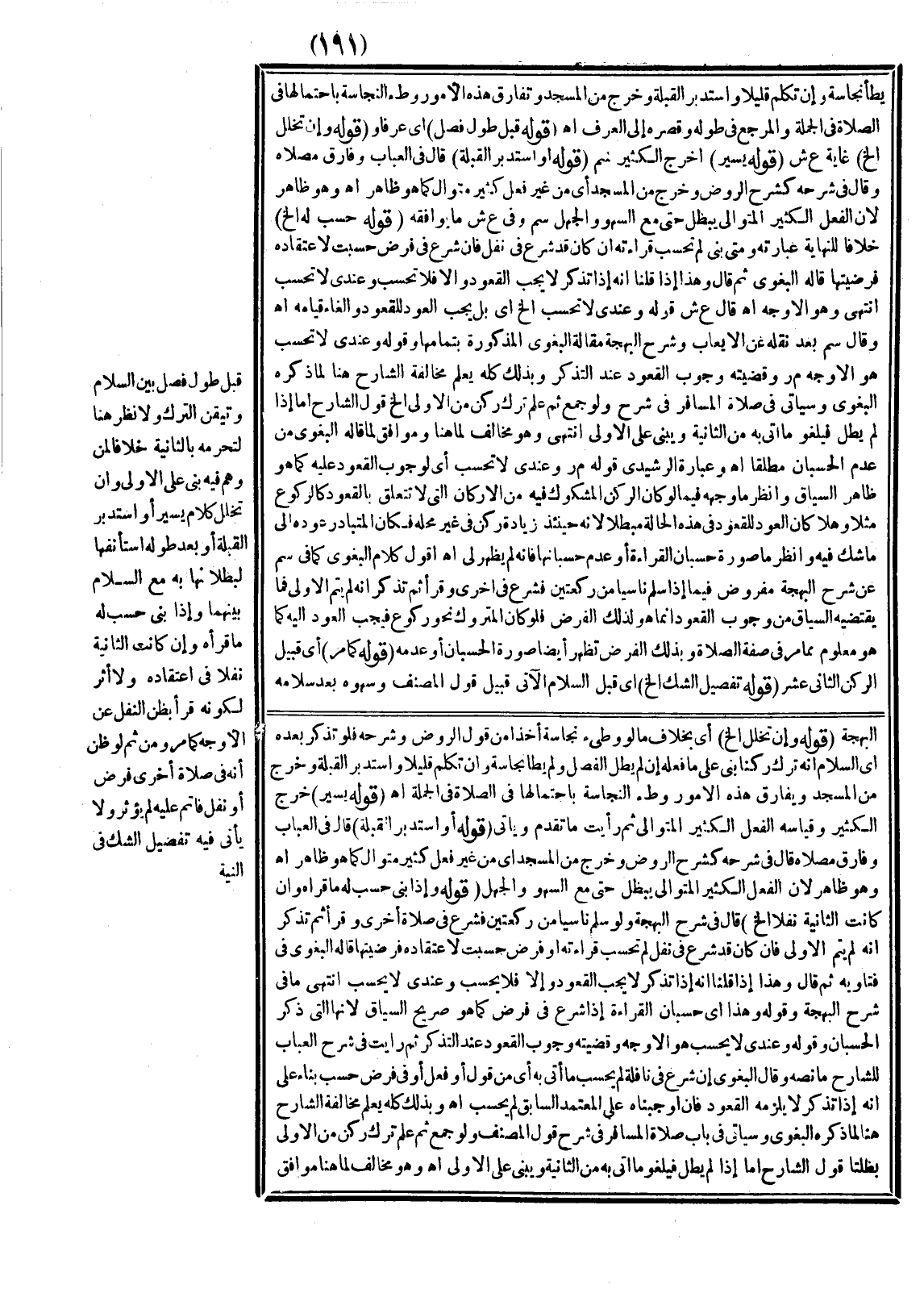 قَبْلَ طُولِ فَصْلٍ بَيْنَ السَّلَامِ وَتَيَقُّنِ التَّرْكِ وَلَا نَظَرَ هُنَا لِتَحَرُّمِهِ بِالثَّانِيَةِ خِلَافًا لِمَنْ وَهِمَ فِيهِ بَنَى عَلَى الْأَوَّلِ، وَإِنْ تَخَلَّلَ كَلَامٌ يَسِيرٌ أَوْ اسْتَدْبَرَ الْقِبْلَةَ أَوْ بَعْدَ طُولِهِ اسْتَأْنَفَهَا لِبُطْلَانِهَا بِهِ مَعَ السَّلَامِ بَيْنَهُمَا وَإِذَا بَنَى حُسِبَ لَهُ مَا قَرَأَهُ، وَإِنْ كَانَتْ الثَّانِيَةُ نَفْلًا فِي اعْتِقَادِهِ وَلَا أَثَرَ لِكَوْنِهِ قَرَأَ بِظَنِّ النَّفْلِ عَلَى الْأَوْجَهِ كَمَا مَرَّ وَمِنْ ثَمَّ لَوْ ظَنَّ أَنَّهُ فِي صَلَاةٍ أُخْرَى فَرْضٍ أَوْ نَفْلٍ فَأَتَمَّ عَلَيْهِ لَمْ يُؤَثِّرْ وَلَا يَأْتِي فِيهِ تَفْصِيلُ الشَّكِّ فِي النِّيَّةِ