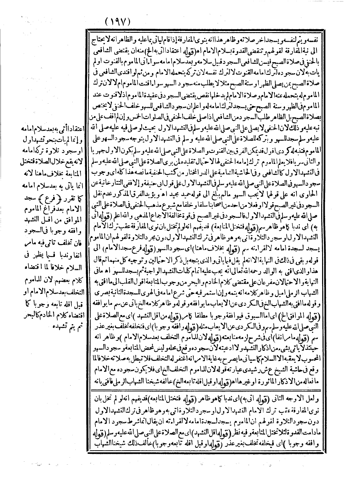 وَيُؤَيِّدُ الْفَرْقَ الْمَذْكُورَ عَدَمُ نَقْلِ السُّجُودِ فِي غَيْرِ الصُّبْحِ قَوْلًا أَوْ فِعْلًا مِنْ أَحَدٍ مِنْ أَصْحَابِنَا سَلَفًا وَخَلَفًا مَعَ شُيُوعِ مَذْهَبِ الْحَنَفِيِّ فِي الصَّلَاةِ عَلَى النَّبِيِّ - صَلَّى اللَّهُ عَلَيْهِ وَسَلَّمَ - فِي التَّشَهُّدِ الْأَوَّلِ فَالسُّجُودُ فِي غَيْرِ الصُّبْحِ فِي قُوَّةِ مُخَالَفَةِ الْإِجْمَاعِ الْمَذْهَبِيِّ وَاَللَّهُ أَعْلَمُ (قَوْلُهُ أَتَى بِهِ) أَيْ نَدْبًا كَمَا هُوَ ظَاهِرٌ س م (قَوْلُهُ فَتَخْتَلُّ الْمُتَابَعَةُ) قَدْ يُفْهَمُ أَنَّهُ لَوْ لَمْ تَخْتَلَّ بِأَنْ نَوَى الْمُفَارَقَةَ عَقِبَ تَرْكِ الْإِمَامِ التَّشَهُّدَ الْأَوَّلَ أَوْ سُجُودَ التِّلَاوَةِ أَتَى بِهِ وَهُوَ ظَاهِرٌ فِي تَرْكِ التَّشَهُّدِ الْأَوَّلِ دُونَ سُجُودِ التِّلَاوَةِ لِقَوْلِهِمْ إنَّ الْمَأْمُومَ يَسْجُدُ لِسَجْدَةِ إمَامِهِ لَا لِقِرَاءَتِهِ سم (قَوْلُهُ بِخِلَافِ مَا هُنَا) أَيْ سُجُودِ السَّهْوِ (قَوْلُهُ فَرْعٌ: سَجَدَ الْإِمَامُ) إلَى قَوْلِهِ وَبَقِيَ فِي ذَلِكَ فِي النِّهَايَةِ إلَّا أَنَّهُ لَمْ يَقُلْ فِيمَا يَأْتِي وَاَلَّذِي يُتَّجَهُ ذِكْرُ الِاحْتِمَالَيْنِ وَتَوْجِيهُ كُلٍّ مِنْهُمَا ثُمَّ قَالَ هَذَا وَاَلَّذِي أَفْتَى بِهِ الْوَالِدُ - رَحِمَهُ اللَّهُ تَعَالَى - أَنَّهُ يَجِبُ عَلَيْهِ إتْمَامُ كَلِمَاتِ التَّشَهُّدِ الْوَاجِبَةِ ثُمَّ يَسْجُدُ لِلسَّهْوِ انْتَهَى مَا فِي النِّهَايَةِ وَالِاحْتِمَالَانِ مُفَرَّعَانِ عَلَى مُقْتَضَى كَلَامِ الْخَادِمِ وَالْبَحْرِ مِنْ وُجُوبِ الْمُتَابَعَةِ أَقُولُ الْقَلْبُ إلَى مَا أَفْتَى بِهِ الشِّهَابُ الرَّمْلِيُّ أَمْيَلُ، وَظَاهِرُ كَلَامِهِ أَنَّهُ يُتِمُّهُ وَإِنْ اسْتَمَرَّ فِيهِ حَتَّى شَرَعَ إمَامُهُ فِي الْهَوِيِّ لِلسَّجْدَةِ الثَّانِيَةِ بَصْرِيٌّ وَقَوْلُهُ مَا أَفْتَى بِهِ الشِّهَابُ إلَخْ فِي الْكُرْدِيِّ عَنْ الْإِيعَابِ مَا يُوَافِقُهُ وَقَوْلُهُ وَظَاهِرُ كَلَامِهِ إلَخْ يَأْتِي عَنْ سم مَا يُوَافِقُهُ.