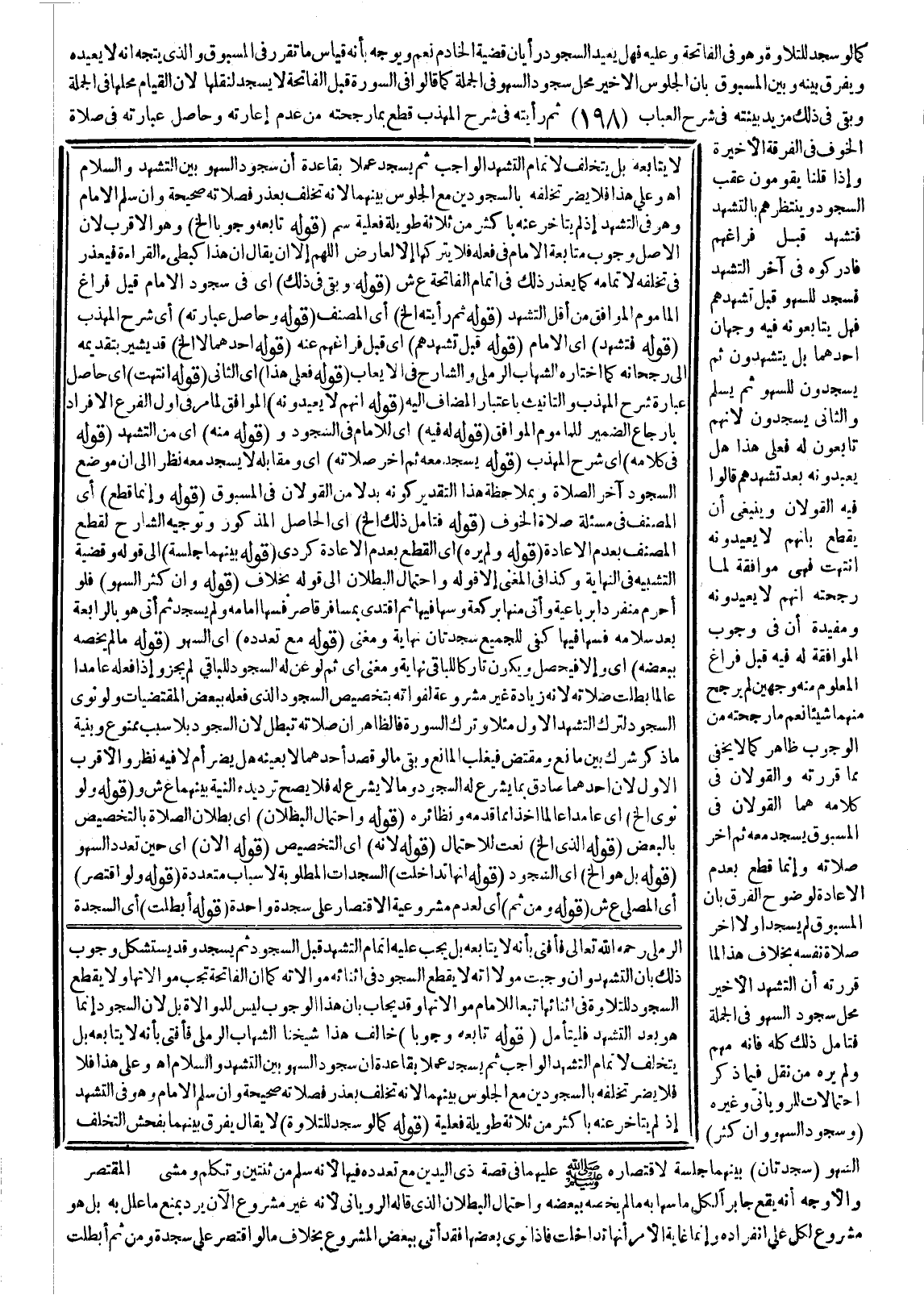 كَمَا لَوْ سَجَدَ لِلتِّلَاوَةِ وَهُوَ فِي الْفَاتِحَةِ وَعَلَيْهِ فَهَلْ يُعِيدُ السُّجُودَ رَأْيَانِ قَضِيَّةُ الْخَادِمِ نَعَمْ وَيُوَجَّهُ بِأَنَّهُ قِيَاسُ مَا تَقَرَّرَ فِي الْمَسْبُوقِ وَاَلَّذِي يَتَّجِهُ أَنَّهُ لَا يُعِيدُهُ وَيُفَرَّقُ بَيْنَهُ وَبَيْنَ الْمَسْبُوقِ بِأَنَّ الْجُلُوسَ الْأَخِيرَ مَحَلُّ سُجُودِ السَّهْوِ فِي الْجُمْلَةِ كَمَا قَالُوا فِي السُّورَةِ قَبْلَ الْفَاتِحَةِ لَا يَسْجُدُ لِنَقْلِهَا؛ لِأَنَّ الْقِيَامَ مَحَلُّهَا فِي الْجُمْلَةِ وَبَقِيَ فِي ذَلِكَ مَزِيدٌ بَيَّنْته فِي شَرْحِ الْعُبَابِ ثُمَّ رَأَيْتُهُ فِي شَرْحِ الْمُهَذَّبِ قَطَعَ بِمَا رَجَّحْتُهُ مِنْ عَدَمِ إعَادَتِهِ.