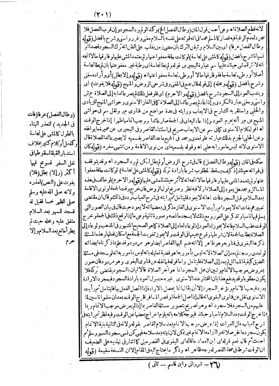 ـــــــــــــــــــــــــــــSحُكْمُهُ فِي الْمَتْنِ (قَوْلُهُ: وَطَالَ الْفَصْلُ) قَالَ فِي شَرْحِ الرَّوْضِ، أَوْ لَمْ يَطُلْ لَكِنْ لَمْ يُرِدْ السُّجُودَ اهـ وَقَدْ يُتَوَقَّفُ فِي فَوَاتِهِ حِينَئِذٍ إذْ كَيْفَ يَسْقُطُ الْمَطْلُوبُ شَرْعًا بِإِرَادَةِ تَرْكِهِ (قَوْلُهُ: كَالْمَشْيِ عَلَى نَجَاسَةٍ) لَوْ كَانَتْ جَافَّةً مَعْفُوًّا عَنْهَا وَلَمْ يَتَعَمَّدْ الْمَشْيَ عَلَيْهَا وَفَارَقَهَا حَالًا اتَّجَهَ أَنَّهُ لَا أَثَرَ حِينَئِذٍ لِلْمَشْيِ عَلَيْهَا (قَوْلُهُ: وَإِلَّا حَرُمَ) لَوْ خَالَفَ فِي هَذِهِ الْمَسَائِلِ وَسَجَدَ هَلْ يَعُودُ إلَى الصَّلَاةِ، أَوْ لَا؟ فِيهِ نَظَرٌ وَصَرِيحُ قَوْلِ الرَّوْضِ فَإِنْ خَرَجَ وَقْتَ الْجُمُعَةِ، أَوْ نَوَى الْإِقَامَةَ بَعْدَ السَّلَامِ وَقَبْلَ السُّجُودِ فَاتَ اهـ أَنَّهُ لَا يَعُودُ، فَلْيُتَأَمَّلْ. ثُمَّ رَأَيْتُهُ فِي شَرْحِ الْعُبَابِ تَرَدَّدَ فِي ذَلِكَ، وَقَالَ: إنَّ مُقْتَضَى تَعْبِيرِهِمْ بِفَاتَ أَنَّهُ لَا يَعُودُ، ثُمَّ رَأَيْتُ الْإِسْنَوِيَّ فِي أَلْغَازِهِ ذَكَرَ فِي بَعْضِهَا أَنَّهُ لَا يَعُودُ حَيْثُ قَالَ فِي بَيَانِ الصُّوَرِ الَّتِي يُسَلِّمُ فِيهَا نَاسِيًا وَتَذَكَّرَ عَلَى الْفَوْرِ وَمَعَ ذَلِكَ لَا يَسْجُدُ مَا نَصُّهُ: وَصُورَةٌ ثَانِيَةٌ وَهِيَ مَا إذَا وَقَعَ ذَلِكَ فِي الْجُمُعَةِ وَخَرَجَ الْوَقْتُ عَقِبَ السَّلَامِ فَإِنَّهُ لَا يَجُوزُ لَهُ الْعَوْدُ إذْ لَوْ عَادَ لَعَادَ إلَى الصَّلَاةِ كَمَا هُوَ الصَّحِيحُ الْمَشْهُورُ فِي الْمَذْهَبِ، وَلَوْ عَادَ إلَى الصَّلَاةِ بَطَلَتْ الْجُمُعَةُ؛ لِأَنَّ شَرْطَهَا وُقُوعُ جَمِيعِهَا فِي الْوَقْتِ وَلَا يَجُوزُ تَفْوِيتُ الْجُمُعَةِ مَعَ إمْكَانِ فِعْلِهَا وَهَذِهِ الْمَسْأَلَةُ ذَكَرَهَا الْبَغَوِيّ فِي فَتَاوِيهِ وَهُوَ ظَاهِرٌ إلَّا أَنَّهُ ضَمَّ إلَيْهَا الْقَاصِرَ أَيْضًا وَهُوَ مَرْدُودٌ وَقَدْ عُلِمَ مِمَّا ذَكَرْنَاهُ أَيْضًا أَنَّهُ لَوْ تَعَدَّى وَسَجَدَ لَمْ يَعُدْ إلَى الصَّلَاةِ؛ لِأَنَّهُ لَيْسَ بِمَأْمُورٍ بِهِ اهـ وَقَضِيَّةُ تَعْلِيلِهِ بِأَنَّهُ لَيْسَ بِمَأْمُورٍ بِهِ أَنَّهُ لَوْ سَجَدَ فِي مَسْأَلَةِ الضِّيقِ كَبَقِيَّةِ الْمَسَائِلِ لَمْ يَعُدْ إلَى الصَّلَاةِ، فَلْيُتَأَمَّلْ. وَأَمَّا قَوْلُهُ فِيمَا نَقَلَهُ عَنْ فَتَاوَى الْبَغَوِيّ وَهُوَ مَرْدُودٌ فَإِنْ صُوِّرَ بِعُرُوضِ مُوجِبِ الْإِتْمَامِ وَتَبَيَّنَ أَنَّ مَحَلَّ السُّجُودِ إنَّمَا هُوَ آخِرُ الصَّلَاةِ فَالْإِتْيَانُ بِالسُّجُودِ يَقْتَضِي تَرْكَهُ فَلَا يَكُونُ مَطْلُوبًا وَقَدْ يُدْفَعُ هَذَا بِأَنَّ الْمُخْتَارَ عِنْدَ الْإِسْنَوِيِّ وَغَيْرِهِ حُصُولُ الْعَوْدِ بِإِرَادَةِ السُّجُودِ فَبِمُجَرَّدِ الْإِرَادَةِ يَعُودُ فَيَجِبُ الْإِتْمَامُ وَيُؤَخَّرُ السُّجُودُ إلَّا أَنْ يُقَالَ إنَّمَا يَحْصُلُ بِالْإِرَادَةِ إذَا اتَّصَلَ الْفِعْلُ بِهَا، فَلْيُتَأَمَّلْ. ثُمَّ رَأَيْتُ الْإِسْنَوِيَّ نَقَلَ عَنْ فَتَاوَى الْبَغَوِيّ أَنَّهُ قَالَ إذَا صَلَّى الْجُمُعَةَ، أَوْ قَصَرَ الْمُسَافِرُ فَخَرَجَ الْوَقْتُ بَعْدَ أَنْ سَلَّمُوا نَاسِينَ لِمَا عَلَيْهِمْ مِنْ السُّجُودِ فَلَا سُجُودَ اهـ وَهُوَ تَصْرِيحٌ بِتَصْوِيرِ مَسْأَلَةِ الْقَاصِرِ بِمَا إذَا لَمْ يَعْرِضْ مُوجِبُ الْإِتْمَامِ وَبِمَا إذَا خَرَجَ الْوَقْتُ بَعْدَ السَّلَامِ نَاسِيًا وَحِينَئِذٍ فَيُوَجَّهُ كَلَامُهُ بِأَنَّهُ يَلْزَمُ إخْرَاجُ بَعْضِهَا عَنْ الْوَقْتِ، وَفِيهِ نَظَرٌ، ثُمَّ رَأَيْتُهُ فِي شَرْحِ الْعُبَابِ عَلَّلَ الْفَوَاتَ إذَا عَرَضَ مُوجِبُ الْإِتْمَامِ بَعْدَ سَلَامِ الْقَاصِرِ بِقَوْلِهِ وَلِأَنَّهُ فِي الثَّانِيَةِ بِنِيَّةِ الْإِتْمَامِ يَكُونُ س