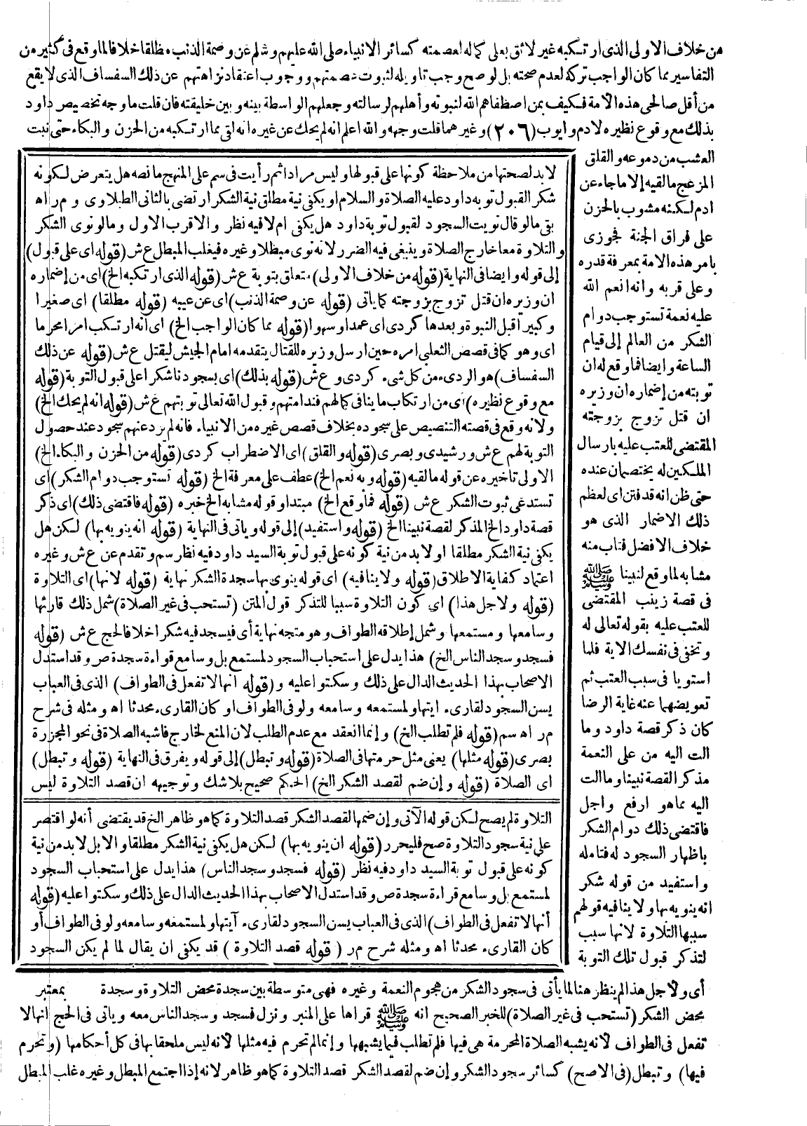 ـــــــــــــــــــــــــــــSالتِّلَاوَةِ لَمْ يَصِحَّ لَكِنْ قَوْلُهُ الْآتِي وَإِنْ ضَمَّ لِقَصْدِ الشُّكْرِ قَصْدَ التِّلَاوَةِ كَمَا هُوَ ظَاهِرٌ إلَخْ قَدْ يَقْتَضِي أَنَّهُ لَوْ اقْتَصَرَ عَلَى نِيَّةِ سُجُودِ التِّلَاوَةِ صَحَّ فَلْيُحَرَّرْ (قَوْلُهُ أَنْ يَنْوِيَهُ بِهَا) لَكِنْ هَلْ يَكْفِي نِيَّةُ الشُّكْرِ مُطْلَقًا أَوْ لَا، بَلْ لَا بُدَّ مِنْ نِيَّةِ كَوْنِهِ عَلَى قَبُولِ تَوْبَةِ السَّيِّدِ دَاوُد فِيهِ نَظَرٌ (قَوْلُهُ: فَسَجَدَ وَسَجَدَ النَّاسُ) هَذَا يَدُلُّ عَلَى اسْتِحْبَابِ السُّجُودِ لِمُسْتَمِعٍ بَلْ وَسَامِعِ قِرَاءَةِ سَجْدَةِ ص وَقَدْ اسْتَدَلَّ الْأَصْحَابُ بِهَذَا الْحَدِيثِ الدَّالِّ عَلَى ذَلِكَ وَسَكَتُوا عَلَيْهِ (قَوْلُهُ: أَنَّهَا لَا تُفْعَلُ فِي الطَّوَافِ) الَّذِي فِي الْعُبَابِ يُسَنُّ السُّجُودُ لِقَارِئِ آيَتِهَا وَلِمُسْتَمِعِهِ وَسَامِعِهِ، وَلَوْ فِي الطَّوَافِ، أَوْ كَانَ الْقَارِئُ مُحْدِثًا اهـ وَمِثْلُهُ شَرْحُ م ر (قَوْلُهُ: قَصْدَ التِّلَاوَةِ) قَدْ يَكْفِي أَنْ يُقَالَ لَمَّا لَمْ يَكُنْ السُّجُودُ