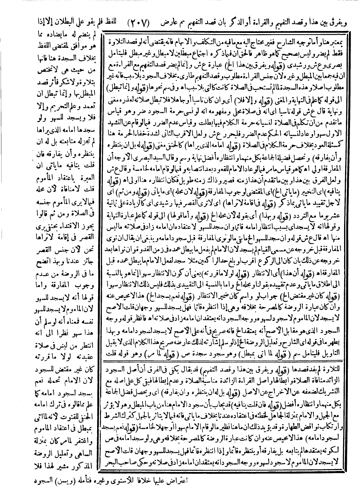 وَيُفَرَّقُ بَيْنَ هَذَا وَقَصْدِ التَّفْهِيمِ وَالْقِرَاءَةِ أَوْ الذِّكْرِ بِأَنَّ قَصْدَ التَّفْهِيمِ ثَمَّ عَارِضٌ لِلَّفْظِ فَلَمْ يَقْوَ عَلَى الْبُطْلَانِ إلَّا إذَا لَمْ يَنْضَمَّ لَهُ مَا يُضَادُّهُ مِمَّا هُوَ مُوَافِقٌ لِمُقْتَضَى اللَّفْظِ بِخِلَافِ السَّجْدَةِ هُنَا فَإِنَّهَا مِنْ حَيْثُ هِيَ لَا تَخْتَصُّ بِتِلَاوَةٍ وَلَا شُكْرٍ فَأَثَّرَ قَصْدُ الْمُبْطِلِ بِهَا وَإِنَّمَا تُبْطِلُ إنْ تَعَمَّدَ وَعَلِمَ التَّحْرِيمَ وَإِلَّا فَلَا وَيَسْجُدُ لِلسَّهْوِ، وَلَوْ سَجَدَهَا إمَامُهُ الَّذِي يَرَاهَا لَمْ تَجُزْ لَهُ مُتَابَعَتُهُ بَلْ لَهُ أَنْ يَنْتَظِرَهُ وَأَنْ يُفَارِقَهُ فَإِنْ قُلْتَ يُنَافِيهِ مَا يَأْتِي أَنَّ الْعِبْرَةَ بِاعْتِقَادِ الْمَأْمُومِ قُلْتُ لَا مُنَافَاةَ لِأَنَّ مَحَلَّهُ فِيمَا لَا يَرَى الْمَأْمُومُ جِنْسَهُ فِي الصَّلَاةِ وَمِنْ ثَمَّ قَالُوا يَجُوزُ الِاقْتِدَاءُ بِحَنَفِيٍّ يَرَى الْقَصْرَ فِي إقَامَةٍ لَا نَرَاهَا نَحْنُ؛ لِأَنَّ جِنْسَ الْقَصْرِ جَائِزٌ عِنْدَنَا وَبِهَذَا اتَّضَحَ مَا فِي الرَّوْضَةِ مِنْ عَدَمِ وُجُوبِ الْمُفَارَقَةِ وَأَمَّا قَوْلُهَا إنَّهُ لَا يَسْجُدُ لِلسَّهْوِ؛ لِأَنَّ الْمَأْمُومَ لَا يَسْجُدُ لِسَهْوِ نَفْسِهِ.
