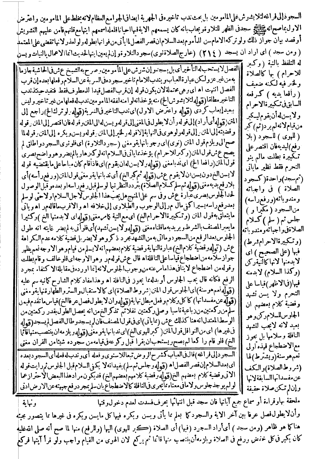 السُّجُودِ إلَى فَرَاغِهِ لِئَلَّا يُشَوِّشَ عَلَى الْمَأْمُومِينَ بَلْ بُحِثَ نَدْبُ تَأْخِيرِهِ فِي الْجَهْرِيَّةِ أَيْضًا مَعَ الْجَوَامِعِ الْعِظَامِ؛ لِأَنَّهُ يَخْلِطُ عَلَى الْمَأْمُومِينَ وَاعْتُرِضَ الْأَوَّلُ بِمَا صَحَّ «أَنَّهُ - صَلَّى اللَّهُ عَلَيْهِ وَسَلَّمَ - سَجَدَ فِي الظُّهْرِ لِلتِّلَاوَةِ» وَيُجَابُ بِأَنَّهُ كَانَ يُسْمِعُهُمْ الْآيَةَ فِيهَا أَحْيَانًا فَلَعَلَّهُ أَسْمَعَهُمْ آيَتَهَا مَعَ قِلَّتِهِمْ فَأَمِنَ عَلَيْهِمْ التَّشْوِيشَ أَوْ قَصَدَ بَيَانَ جَوَازِ ذَلِكَ، وَلَوْ تَرَكَهُ الْإِمَامُ سُنَّ لِلْمَأْمُومِ بَعْدَ السَّلَامِ إنْ قَصُرَ الْفَصْلُ لِمَا يَأْتِي مِنْ فَوَاتِهَا بِطُولِهِ وَلَوْ لِعُذْرٍ؛ لِأَنَّهَا لَا تُقْضَى عَلَى الْمُعْتَمَدِ.