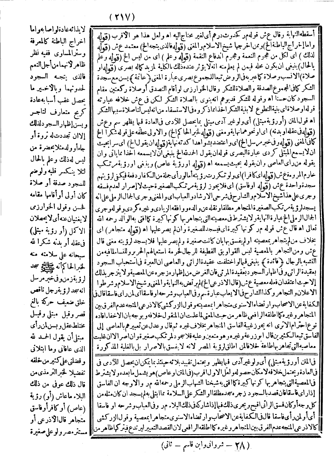 (قَوْلُهُ وَأَمَّا إخْرَاجُ الْبَاطِنَةِ إلَخْ) وَمِمَّنْ أَخْرَجَهَا شَيْخُ الْإِسْلَامِ وَالْمُغْنِي (قَوْلُهُ فَاَلَّذِي يَتَّجِهُ إلَخْ) مُعْتَمَدٌ ع ش (قَوْلُهُ لِذَلِكَ) أَيْ لِكُلٍّ مِنْ هُجُومِ النِّعْمَةِ وَهُجُومِ انْدِفَاعِ النِّقْمَةِ (قَوْلُهُ وَعَلِمَ) أَيْ مَنْ لَيْسَ إلَخْ (قَوْلُهُ وَعَلِمَ بِالْحَالِ) يَنْبَغِي أَنْ يَكُونَ مَحَلُّهُ فِيمَنْ لَمْ يَعْلَمْ مِنْهُ أَنَّهُ لَا يُؤَثِّرُ عِنْدَهُ ذَلِكَ بِالْكُلِّيَّةِ لِمَزِيدِ كَمَالِهِ بَصْرِيٌّ (قَوْلُهُ أَوْ صَلَاةً) الْأَنْسَبُ وَصَلَاةً كَمَا عَبَّرَ بِهِ فِي الرَّوْضِ تَبَعًا لِلْمَجْمُوعِ بَصْرِيٌّ عِبَارَةُ الْمُغْنِي (خَاتِمَةٌ) يُسَنُّ مَعَ سَجْدَةِ الشُّكْرِ كَمَا فِي الْمَجْمُوعِ الصَّدَقَةُ وَالصَّلَاةُ لِلشُّكْرِ وَقَالَ الْخُوَارِزْمِيَّ لَوْ أَقَامَ التَّصَدُّقَ أَوْ صَلَاةَ رَكْعَتَيْنِ مَقَامَ السُّجُودِ كَانَ حَسَنًا اهـ وَقَوْلُهُ لِلشُّكْرِ قَدْ يُوهِمُ أَنَّهُ يَنْوِي بِالصَّلَاةِ الشُّكْرَ لَكِنْ فِي ع ش خِلَافُهُ عِبَارَتُهُ قَوْلُهُ أَوْ صَلَاةً أَيْ بِنِيَّةِ التَّطَوُّعِ لَا بِنِيَّةِ الشُّكْرِ أَخْذًا مِمَّا ذَكَرَهُ فِي الِاسْتِسْقَاءِ مِنْ أَنَّهُ لَيْسَ لَنَا صَلَاةٌ سَبَبُهَا الشُّكْرُ اهـ قَوْلُ الْمَتْنِ (أَوْ رُؤْيَةِ مُبْتَلًى) أَيْ وَلَوْ غَيْرَ آدَمِيٍّ مُبْتَلًى بِمَا يَحْصُلُ لِلْآدَمِيِّ فِي الْعَادَةِ فِيمَا يَظْهَرُ سم وَع ش (قَوْلُهُ فِي عَقْلِهِ أَوْ بَدَنِهِ) أَيْ أَوْ نَحْوِهِمَا نِهَايَةٌ وَمُغْنِي (قَوْلُهُ لِخَبَرِ الْحَاكِمِ إلَخْ) وَالْأَوْلَى عَطْفُهُ عَلَى قَوْلِهِ شُكْرًا إلَخْ كَمَا فِي الْمُغْنِي (قَوْلُهُ وَفِي خَبَرٍ مُرْسَلٍ إلَخْ) أَيْ وَاعْتَضَدَ بِشَوَاهِدَ أَكَّدَتْهُ نِهَايَةٌ (قَوْلُهُ أَنْ يَقُولَ إلَخْ) أَيْ سِرًّا بِحَيْثُ أَنْ لَا يَسْمَعَ الْمُبْتَلَى كُرْدِيٌّ عِبَارَةُ الْبَصْرِيِّ قَوْلُهُ أَنْ يَقُولَ الْحَمْدُ لِلَّهِ إلَخْ يَنْبَغِي أَنْ لَا يَسْمَعَهُ أَخْذًا مِمَّا يَأْتِي وَأَنْ يَقُولَهُ مَنْ رَأَى الْعَاصِيَ وَأَنْ يَقُولَهُ بِحَيْثُ يُسْمِعُهُ اهـ.