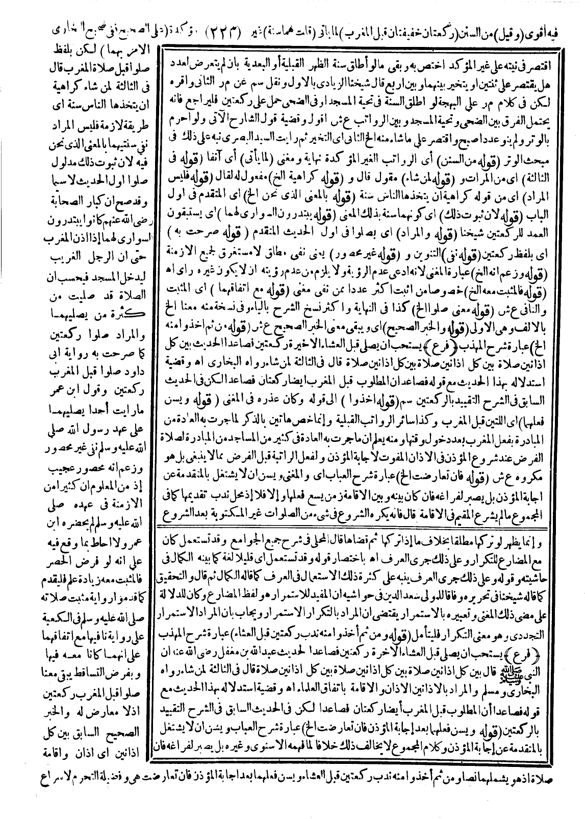 (قَوْلُهُ: وَمِنْ ثَمَّ أَخَذُوا مِنْهُ نَدْبَ رَكْعَتَيْنِ قَبْلَ الْعِشَاءِ) عِبَارَةُ شَرْحِ الْمُهَذَّبِ فَرْعٌ يُسْتَحَبُّ أَنْ يُصَلِّيَ قَبْلَ الْعِشَاءِ الْآخِرَةِ رَكْعَتَيْنِ فَصَاعِدًا لِحَدِيثِ عَبْدِ اللَّهِ بْنِ مُغَفَّلٍ - رَضِيَ اللَّهُ تَعَالَى عَنْهُ - أَنَّ النَّبِيَّ - صَلَّى اللَّهُ عَلَيْهِ وَسَلَّمَ - قَالَ «بَيْنَ كُلِّ أَذَانَيْنِ صَلَاةٌ بَيْنَ كُلِّ أَذَانَيْنِ صَلَاةٌ بَيْنَ كُلِّ أَذَانَيْنِ صَلَاةٌ قَالَ فِي الثَّالِثَةِ لِمَنْ شَاءَ» رَوَاهُ الْبُخَارِيُّ وَمُسْلِمٌ، وَالْمُرَادُ بِالْأَذَانَيْنِ الْأَذَانُ وَالْإِقَامَةُ بِاتِّفَاقِ الْعُلَمَاءِ اهـ وَقَضِيَّةُ اسْتِدْلَالِهِ بِهَذَا الْحَدِيثِ مَعَ قَوْلِهِ فَصَاعِدًا أَنَّ الْمَطْلُوبَ قَبْلَ الْمَغْرِبِ أَيْضًا رَكْعَتَانِ فَصَاعِدًا لَكِنْ فِي الْحَدِيثِ السَّابِقِ فِي الشَّرْحِ التَّقْيِيدُ بِالرَّكْعَتَيْنِ (قَوْلُهُ: وَيُسَنُّ فِعْلُهُمَا بَعْدَ إجَابَةِ الْمُؤَذِّنِ، فَإِنْ تَعَارَضَتَا إلَخْ) عِبَارَةُ شَرْحِ الْعُبَابِ وَيُسَنُّ أَنْ لَا يَشْتَغِلَ بِالْمُتَقَدِّمَةِ عَنْ إجَابَةِ الْمُؤَذِّنِ وَكَلَامُ الْمَجْمُوعِ لَا يُخَالِفُ ذَلِكَ خِلَافًا لِمَا فَهِمَهُ الْإِسْنَوِيُّ وَغَيْرُهُ بَلْ يَصْبِرُ لِفَرَاغِهِ، فَإِنْ