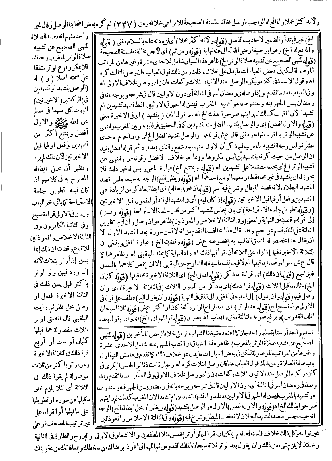 ـــــــــــــــــــــــــــــQإلَخْ) خَبَرٌ فَمُبْتَدَأٌ، وَالضَّمِيرُ لِأَحَادِيثِ الْفَصْلِ (قَوْلُهُ: وَلِأَنَّهُ أَكْثَرُ عَمَلًا) أَيْ لِزِيَادَتِهِ عَلَيْهِ بِالسَّلَامِ مُغْنِي (قَوْلُهُ: وَالْمَانِعُ لَهُ إلَخْ) وَهُوَ أَبُو حَنِيفَةَ - رَضِيَ اللَّهُ تَعَالَى عَنْهُ - نِهَايَةٌ (قَوْلُهُ: وَمِنْ ثَمَّ) أَيْ لِأَجْلِ مُخَالَفَتِهِ لِلسُّنَّةِ الصَّحِيحَةِ (قَوْلُهُ: لِلنَّهْيِ الصَّحِيحِ عَنْ تَشْبِيهِ صَلَاةِ الْوِتْرِ إلَخْ) ظَاهِرُ هَذَا السِّيَاقِ شَامِلٌ لِلْإِحْدَى عَشْرَةَ وَغَيْرِهَا مِنْ الْمَرَاتِبِ الْمَوْصُولَةِ لَكِنْ فِي بَعْضِ الْعِبَارَاتِ مَا يَدُلُّ عَلَى خِلَافِ ذَلِكَ وَمِنْ ذَلِكَ قَوْلُ الْعُبَابِ، فَإِنْ وَصَلَ الثَّالِثَ كُرِهَ انْتَهَى وَقَوْلُ الْأُسْتَاذِ فِي كَنْزِهِ وَيُكْرَهُ الْوَصْلُ عِنْدَ الْإِتْيَانِ بِثَلَاثِ رَكَعَاتٍ، فَإِنْ زَادَ وَوَصَلَ فَخِلَافُ الْأَوْلَى انْتَهَى وَفِي الْعُبَابِ بَعْدَ مَا تَقَدَّمَ، وَإِذَا وَصَلَهُ فِي رَمَضَانَ أَسَرَّ فِي الثَّالِثَةِ أَيْ دُونَ الْأُولَيَيْنِ قَالَ فِي شَرْحِهِ وَيُوَجَّهُ بِأَنَّهُ فِي رَمَضَانَ يُسَنُّ الْجَهْرُ فِيهِ وَعِنْدَ وَصْلِهِ هُوَ تَشْبِيهٌ بِالْمَغْرِبِ فَيُسَنُّ لَهُ الْجَهْرُ فِي الْأَوَّلِيَّيْنِ فَقَطْ سَوَاءٌ تَشَهَّدَ تَشَهُّدَيْنِ أَمْ تَشَهُّدًا؛ لِأَنَّ الْمَغْرِبَ كَذَلِكَ ثُمَّ رَأَيْتُهُمْ صَرَّحُوا بِذَلِكَ انْتَهَى. اهـ.