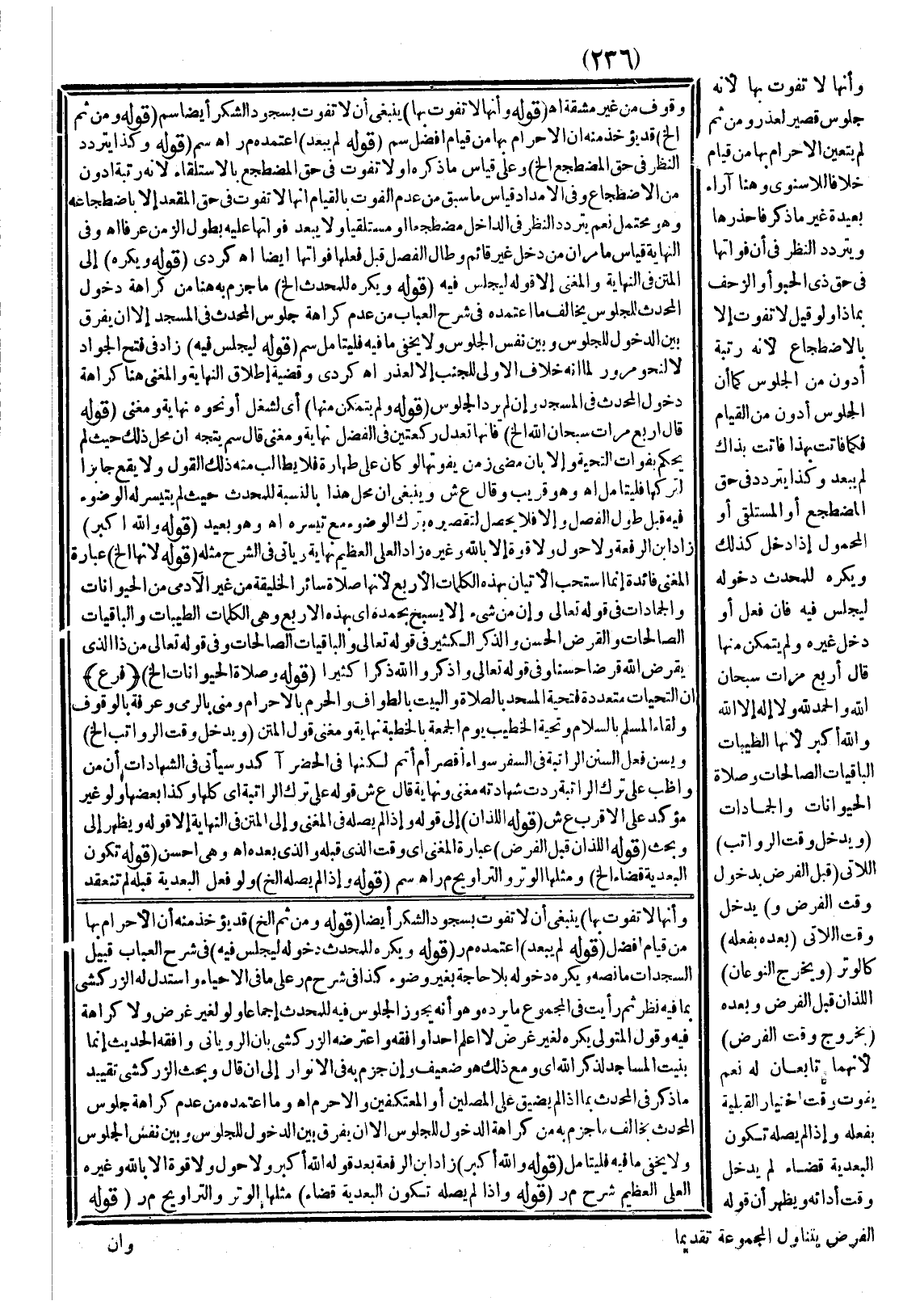 ـــــــــــــــــــــــــــــSوَأَنَّهَا لَا تَفُوتُ بِهَا) يَنْبَغِي أَنْ لَا تَفُوتَ بِسُجُودِ الشُّكْرِ أَيْضًا (قَوْلُهُ: وَمِنْ ثَمَّ إلَخْ) قَدْ يُؤْخَذُ مِنْهُ أَنَّ الْإِحْرَامَ بِهَا مِنْ قِيَامٍ أَفْضَلُ (قَوْلُهُ: لَمْ يَبْعُدْ) اعْتَمَدَهُ م ر (قَوْلُهُ: وَيُكْرَهُ لِلْمُحْدِثِ دُخُولُهُ لِيَجْلِسَ فِيهِ) فِي شَرْحِ الْعُبَابِ قُبَيْلَ السَّجَدَاتِ مَا نَصُّهُ وَيُكْرَهُ دُخُولُهُ بِلَا حَاجَةٍ بِغَيْرِ وُضُوءٍ كَذَا فِي شَرْحِ م ر عَلَى مَا فِي الْإِحْيَاءِ وَاسْتَدَلَّ لَهُ الزَّرْكَشِيُّ بِمَا فِيهِ نَظَرٌ ثُمَّ رَأَيْت فِي الْمَجْمُوعِ مَا يَرُدُّهُ وَهُوَ أَنَّهُ يَجُوزُ الْجُلُوسُ فِيهِ لِلْمُحْدِثِ إجْمَاعًا ولَوْ لِغَيْرِ غَرَضٍ وَلَا كَرَاهَةَ فِيهِ وَقَوْلُ الْمُتَوَلِّي يُكْرَهُ لِغَيْرِ غَرَضٍ لَا أَعْلَمُ أَحَدًا وَافَقَهُ.