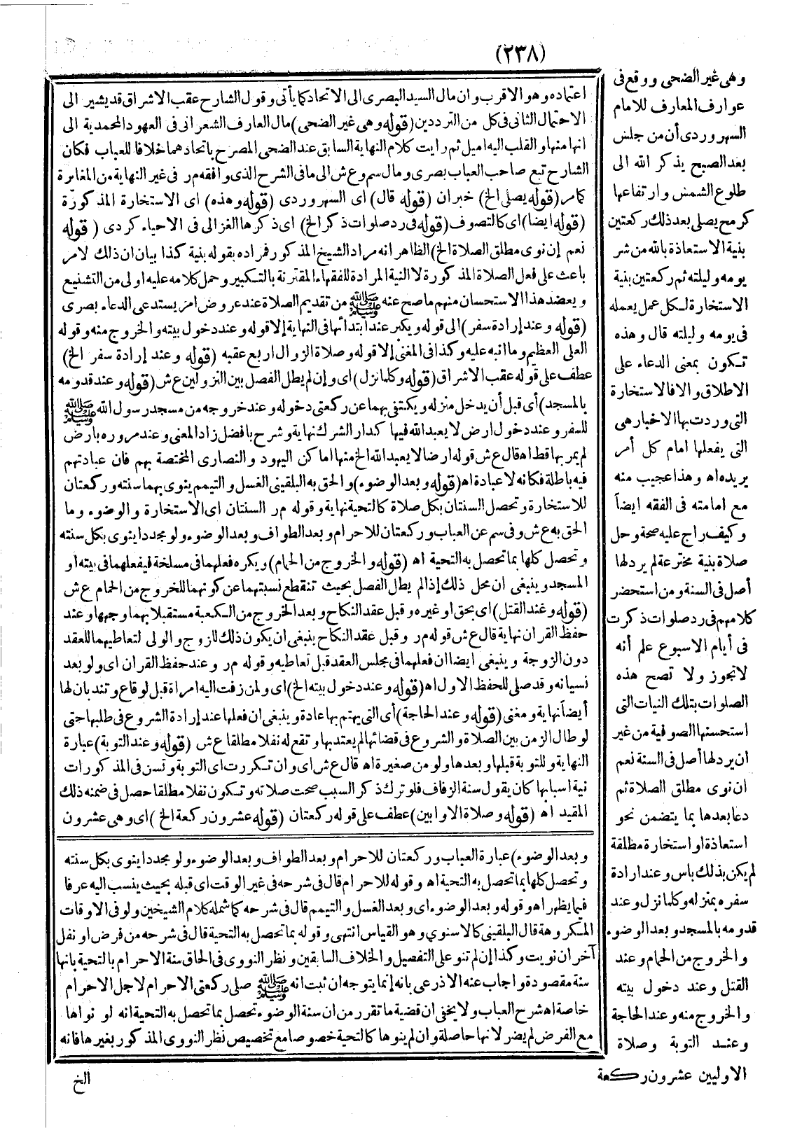 وَهَذَا عَجِيبٌ مِنْهُ مَعَ إمَامَتِهِ فِي الْفِقْهِ أَيْضًا وَكَيْفَ رَاجَ عَلَيْهِ صِحَّةُ وَحِلُّ صَلَاةٍ بِنِيَّةٍ مُخْتَرَعَةٍ لَمْ يَرِدْ لَهَا أَصْلٌ فِي السُّنَّةِ وَمَنْ اسْتَحْضَرَ كَلَامَهُمْ فِي رَدِّ صَلَوَاتٍ ذُكِرَتْ فِي أَيَّامِ الْأُسْبُوعِ عَلِمَ أَنَّهُ لَا تَجُوزُ وَلَا تَصِحُّ هَذِهِ الصَّلَوَاتُ بِتِلْكَ النِّيَّاتِ الَّتِي اسْتَحْسَنَهَا الصُّوفِيَّةُ مِنْ غَيْرِ أَنْ يَرِدَ لَهَا أَصْلٌ فِي السُّنَّةِ نَعَمْ إنْ نَوَى مُطْلَقَ الصَّلَاةِ ثُمَّ دَعَا بَعْدَهَا بِمَا يَتَضَمَّنُ نَحْوَ اسْتِعَاذَةٍ أَوْ اسْتِخَارَةٍ مُطْلَقَةٍ لَمْ يَكُنْ بِذَلِكَ بَأْسٌ، وَعِنْدَ إرَادَةِ سَفَرٍ بِمَنْزِلِهِ وَكُلَّمَا نَزَلَ وَعِنْدَ قُدُومِهِ بِالْمَسْجِدِ وَبَعْدَ الْوُضُوءِ، وَالْخُرُوجِ مِنْ الْحَمَّامِ وَعِنْدَ الْقَتْلِ وَعِنْدَ دُخُولِ بَيْتِهِ، وَالْخُرُوجِ مِنْهُ وَعِنْدَ الْحَاجَةِ وَعِنْدَ التَّوْبَةِ وَصَلَاةُ الْأَوَّابِينَ عِشْرُونَ رَكْعَةً