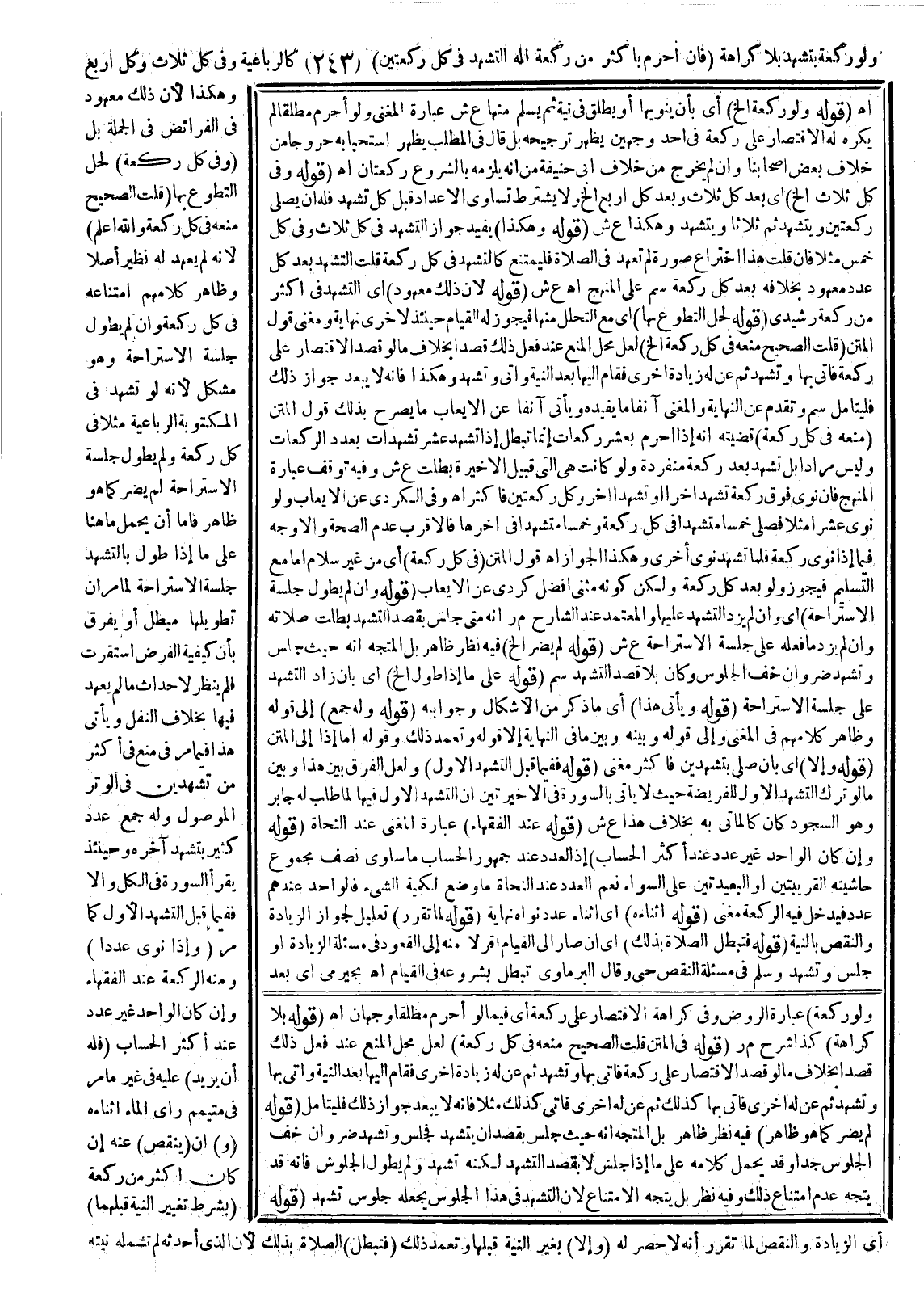 وَلَوْ رَكْعَةً بِتَشَهُّدٍ بِلَا كَرَاهَةٍ (، فَإِنْ أَحْرَمَ بِأَكْثَرَ مِنْ رَكْعَةٍ فَلَهُ التَّشَهُّدُ فِي كُلِّ رَكْعَتَيْنِ) كَالرُّبَاعِيَّةِ وَفِي كُلِّ ثَلَاثٍ وَكُلِّ أَرْبَعٍ وَهَكَذَا؛ لِأَنَّ ذَلِكَ مَعْهُودٌ فِي الْفَرَائِضِ فِي الْجُمْلَةِ بَلْ (وَفِي كُلِّ رَكْعَةٍ) لِحِلِّ التَّطَوُّعِ بِهَا (قُلْت الصَّحِيحُ مَنْعُهُ فِي كُلِّ رَكْعَةٍ وَاَللَّهُ أَعْلَمُ) ؛ لِأَنَّهُ لَمْ يُعْهَدْ لَهُ نَظِيرٌ أَصْلًا وَظَاهِرُ كَلَامِهِمْ امْتِنَاعُهُ فِي كُلِّ رَكْعَةٍ، وَإِنْ لَمْ يُطَوِّلْ جِلْسَةَ الِاسْتِرَاحَةِ وَهُوَ مُشْكِلٌ؛ لِأَنَّهُ لَوْ تَشَهَّدَ فِي الْمَكْتُوبَةِ الرُّبَاعِيَّةِ مَثَلًا فِي كُلِّ رَكْعَةٍ وَلَمْ يُطَوِّلْ جِلْسَةَ الِاسْتِرَاحَةِ لَمْ يَضُرَّ كَمَا هُوَ ظَاهِرٌ فَإِمَّا أَنْ يُحْمَلَ مَا هُنَا عَلَى مَا إذَا طَوَّلَ بِالتَّشَهُّدِ جِلْسَةَ الِاسْتِرَاحَةِ لِمَا مَرَّ أَنَّ تَطْوِيلَهَا مُبْطِلٌ أَوْ يُفَرَّقُ بِأَنَّ كَيْفِيَّةَ الْفَرْضِ لِإِحْدَاثِ مَا لَمْ يُعْهَدْ فِيهَا بِخِلَافِ النَّفْلِ وَيَأْتِي هَذَا فِيمَا مَرَّ فِي مَنْعِ أَكْثَرَ مِنْ تَشَهُّدَيْنِ فِي الْوِتْرِ الْمَوْصُولِ وَلَهُ جَمْعُ عَدَدٍ كَثِيرٍ بِتَشَهُّدٍ آخِرَهُ وَحِينَئِذٍ يَقْرَأُ السُّورَةَ فِي الْكُلِّ وَإِلَّا فَفِيمَا قَبْلَ التَّشَهُّدِ الْأَوَّلِ كَمَا مَرَّ.