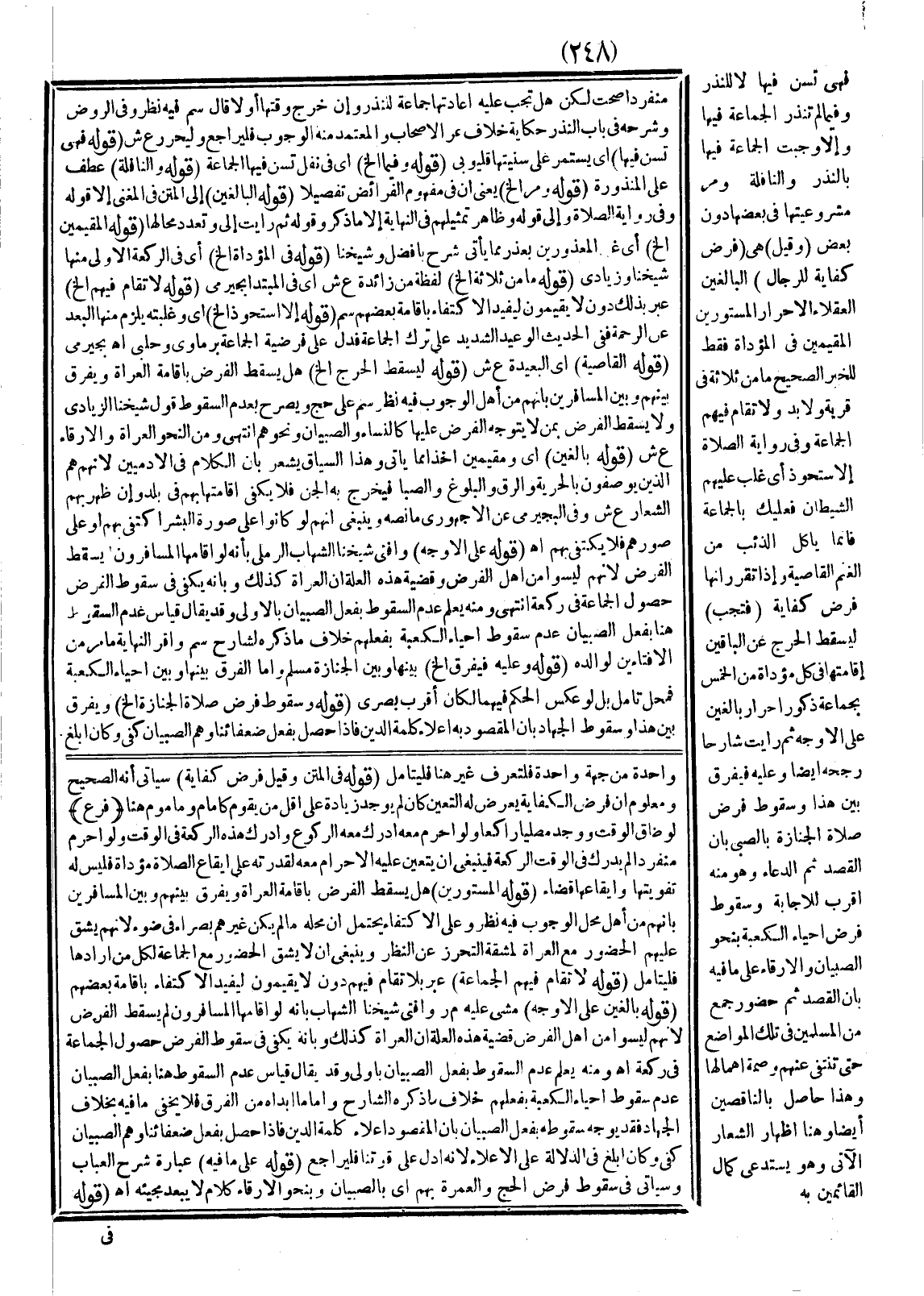 ـــــــــــــــــــــــــــــSوَاحِدَةٍ مِنْ جِهَةٍ وَاحِدَةٍ فَلْتَعْرِفَ غَيْرَ هُنَا فَلْيُتَأَمَّلْ (قَوْلُهُ: فِي الْمَتْنِ وَقِيلَ فَرْضُ كِفَايَةٍ) سَيَأْتِي أَنَّهُ الصَّحِيحُ وَمَعْلُومٌ أَنَّ فَرْضَ الْكِفَايَةِ يَعْرِضُ لَهُ التَّعَيُّنُ كَأَنْ لَمْ يُوجَدْ زِيَادَةٌ عَلَى أَقَلِّ مَنْ يَقُومُ كَإِمَامٍ وَمَأْمُومٍ هُنَا (فَرْعٌ) لَوْ ضَاقَ الْوَقْتُ وَوَجَدَ مُصَلِّيًا رَاكِعًا وَلَوْ أَحْرَمَ مَعَهُ أَدْرَكَ مَعَهُ الرُّكُوعَ وَأَدْرَكَ هَذِهِ الرَّكْعَةَ فِي الْوَقْتِ وَلَوْ أَحْرَمَ مُنْفَرِدًا لَمْ يُدْرِكْ فِي الْوَقْتِ رَكْعَةً فَيَنْبَغِي أَنْ يَتَعَيَّنَ عَلَيْهِ الْإِحْرَامُ مَعَهُ لِقُدْرَتِهِ عَلَى إيقَاعِ الصَّلَاةِ مُؤَدَّاةً فَلَيْسَ لَهُ تَفْوِيتُهَا وَإِيقَاعُهَا قَضَاءً (قَوْلُهُ: الْمَسْتُورِينَ) هَلْ يَسْقُطُ الْفَرْضُ بِإِقَامَةِ الْعُرَاةِ وَيُفَرَّقُ بَيْنَهُمْ وَبَيْنَ الْمُسَافِرِينَ بِأَنَّهُمْ مِنْ أَهْلِ مَحَلِّ الْوُجُوبِ فِيهِ نَظَرٌ وَعَلَى الِاكْتِفَاءِ يُحْتَمَلُ أَنَّ مَحَلَّهُ مَا لَمْ يَكُنْ غَيْرُهُمْ بُصَرَاءَ فِي ضَوْءٍ؛ لِأَنَّهُمْ يَشُقُّ عَلَيْهِمْ الْحُضُورُ مَعَ الْعُرَاةِ لِمَشَقَّةِ التَّحَرُّزِ عَنْ النَّظَرِ وَيَنْبَغِي أَنْ لَا يَشُقَّ الْحُضُورُ مَعَ الْجَمَاعَة لِكُلِّ مَنْ أَرَادَهَا فَلْيُتَأَمَّلْ.