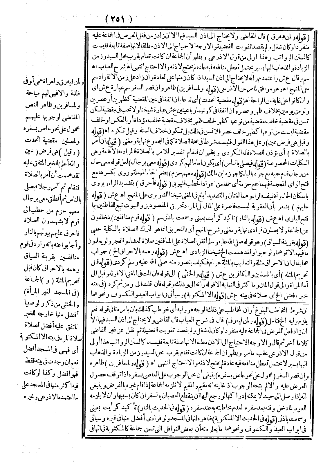 (قَوْلُهُ: وَلِمَنْ فِيهِ رِقٌّ) قَالَ فِي شَرْحِ الْعُبَابِ قَالَ الْقَاضِي وَلَا يُحْتَاجُ إلَى إذْنِ السَّيِّدِ فِيهَا إلَّا إنْ زَادَ فِعْلُ الْفَرْدِ فِي الْجَمَاعَةِ عَلَيْهِ مُنْفَرِدًا وَكَانَ لَهُ شُغْلٌ وَلَمْ يَقْصِدْ تَفْوِيتَ الْفَضِيلَةِ ثُمَّ نَقَلَ عَنْ غَيْرِ الْقَاضِي كَلَامًا آخَرَ ثُمَّ قَالَ: وَالْأَوْجَهُ الِاحْتِيَاجُ إلَى الْإِذْنِ مُطْلَقًا؛ لِأَنَّهَا صِفَةٌ تَابِعَةٌ فَلَيْسَتْ كَالسُّنَنِ الرَّوَاتِبِ هَذَا أَوْلَى مِنْ قَوْلِ الْأَذْرَعِيِّ عَقِبَ مَا مَرَّ وَيَظْهَرُ أَنَّ الْجَمَاعَةَ إنْ كَانَتْ تُقَامُ بِقُرْبِ مَحَلِّ السَّيِّدِ وَزَمَنُ الزِّيَادَةِ وَالذَّهَابِ إلَيْهَا يَسِيرٌ لَا يُحْتَمَلُ تَعَطُّلُ مَنَافِعِهِ فِيهِ عَادَةً لَمْ يَحْتَجْ لِإِذْنِهِ وَإِلَّا احْتَاجَ انْتَهَى. اهـ. (قَوْلُهُ: وَلِمُسَافِرِينَ) ظَاهِرُهُ، وَإِنْ قَصُرَ السَّفَرُ (قَوْلُهُ: مَحْمُولٌ عَلَى نَحْوِ عَاصٍ بِسَفَرِهِ) يَنْبَغِي أَنَّ مَحَلَّ الْوُجُوبِ عَلَى الْعَاصِي بِسَفَرِهِ إذَا تَوَقَّفَ حُصُولُ الْفَرْضِ عَلَيْهِ وَإِلَّا لَمْ يُتَّجَهْ الْوُجُوبُ إذْ غَايَتُهُ أَنَّهُ مُقِيمٌ، وَالْمُقِيمُ لَا تَلْزَمُهُ الْجَمَاعَةُ إذَا قَامَ غَيْرُهُ بِالْفَرْضِ وَيَنْبَغِي أَنَّهُ إذَا وَصَلَ إلَى حَيْثُ يُمْكِنُهُ إدْرَاكُهَا لَوْ رَجَعَ إلَيْهَا أَنْ يَنْقَطِعَ الْعِصْيَانُ بِالسَّفَرِ إنْ كَانَ بِسَبَبِهَا، وَأَنْ لَا يَلْزَمُهُ الْعَوْدُ لَمَّا دَخَلَ وَقْتُهُ بَعْدَ سَفَرِهِ لِعَدَمِ مُخَاطَبَتِهِ بِهِ عِنْدَ سَفَرِهِ (قَوْلُهُ: فِي الْحَدِيثِ «بِالنَّارِ» ) تَأْكِيدٌ كَرَأَيْتُ بِعَيْنِي وَسَمِعْت بِأُذُنِي.