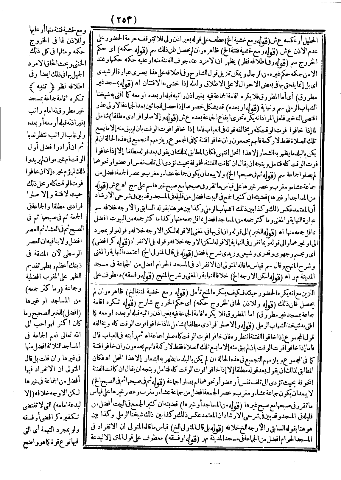 (قَوْلُهُ: تُكْرَهُ إقَامَةُ جَمَاعَةٍ بِمَسْجِدٍ غَيْرِ مَطْرُوقٍ) أَمَّا الْمَطْرُوقُ فَلَا يُكْرَهُ إقَامَةُ الْجَمَاعَةِ فِيهِ بِغَيْرِ إذْنِ رَاتِبِهِ قَبْلَهُ أَوْ بَعْدَهُ أَوْ مَعَهُ كَمَا أَفْتَى بِهِ شَيْخُنَا الشِّهَابُ الرَّمْلِيُّ (قَوْلُهُ: وَإِلَّا صَلَّوْا فُرَادَى مُطْلَقًا) شَامِلٌ لِمَا إذَا خَافُوا فَوْتَ الْوَقْتِ كُلِّهِ وَيُخَالِفُهُ قَوْلُ الْمَجْمُوعِ إذَا خَافُوا الْفِتْنَةَ انْتَظَرُوهُ، فَإِنْ خَافُوا فَوْتَ الْوَقْتِ كُلِّهِ صَلَّوْا جَمَاعَةً. اهـ. ثُمَّ رَأَيْته فِي شَرْحِ الْعُبَابِ قَالَ فَأَمَّا إذَا خَافُوا فَوْتَ الْوَقْتِ بِأَنْ لَمْ يَبْقَ مِنْهُ إلَّا مَا يَسَعُ تِلْكَ الصَّلَاةَ فَقَطْ لَا رَكْعَةً، فَإِنَّهُمْ يُجَمِّعُونَ، وَإِنْ خَافُوا فِتْنَةً كَمَا فِي الْمَجْمُوعِ وَيَلْزَمُهُمْ التَّجْمِيعُ فِي هَذِهِ الْحَالَةِ إنْ لَمْ يَكُنْ بِالْبَلَدِ مَا يَظْهَرُ بِهِ الشِّعَارُ إلَّا هَذَا الْمَحَلَّ. اهـ. فَكَانَ الْمُطَابِقُ لِذَلِكَ أَنْ يَقُولَ بَعْدَ قَوْلِهِ مُطْلَقًا إلَّا إذَا خَافُوا فَوْتَ الْوَقْتِ كُلِّهِ فَتَأَمَّلْ وَيُتَّجَهُ أَنْ يُقَالَ إنْ كَانَتْ الْفِتْنَةُ الْمَخُوفَةُ بِحَيْثُ تُؤَدِّي إلَى تَلَفِ نَفْسٍ أَوْ عُضْوٍ أَوْ نَحْوِهِمَا لَمْ يُصَلُّوا جَمَاعَةً.